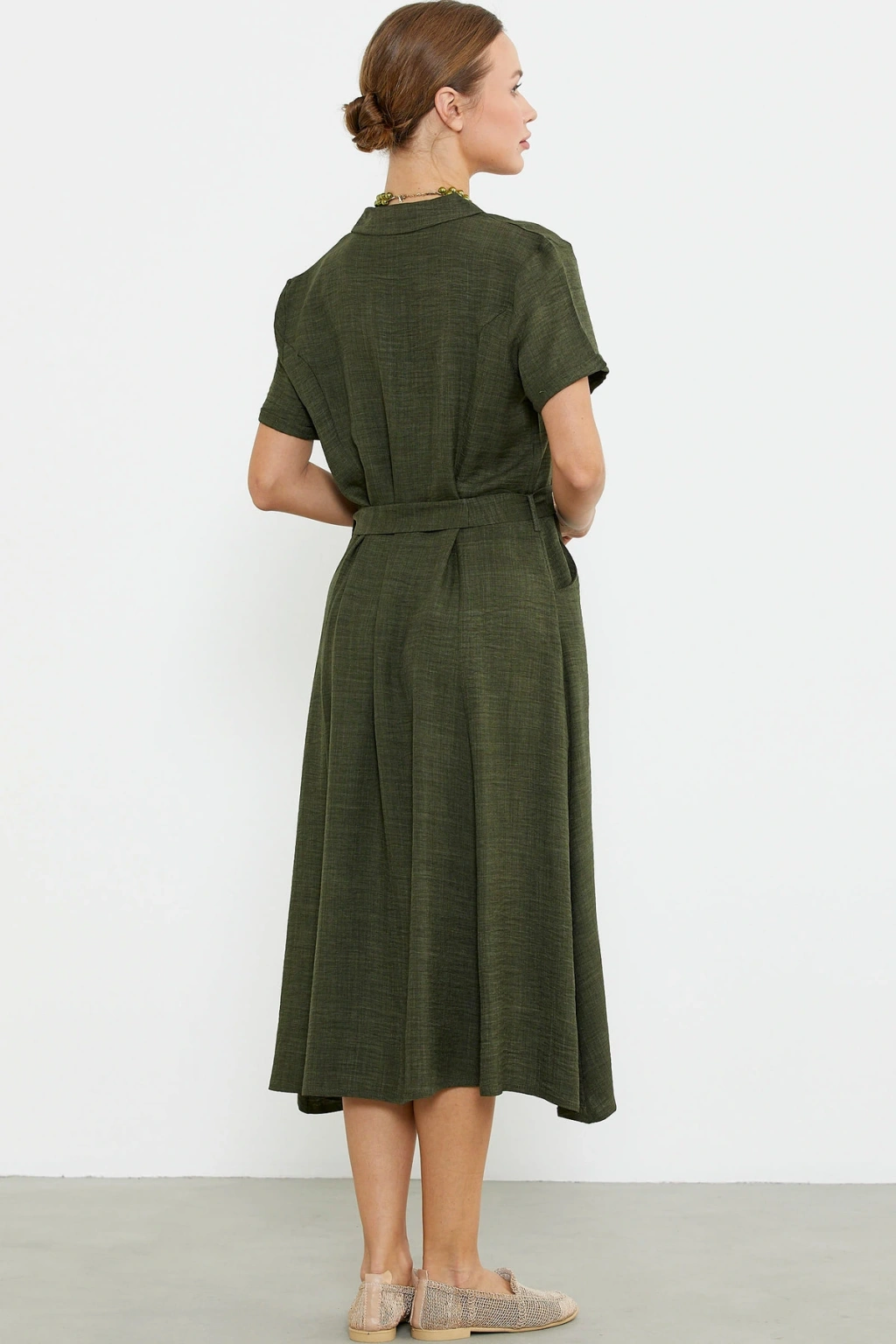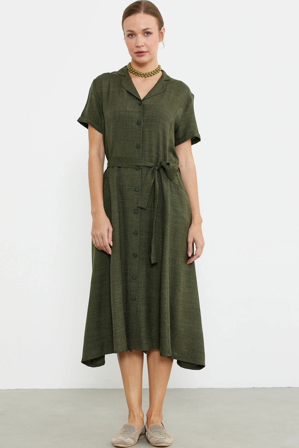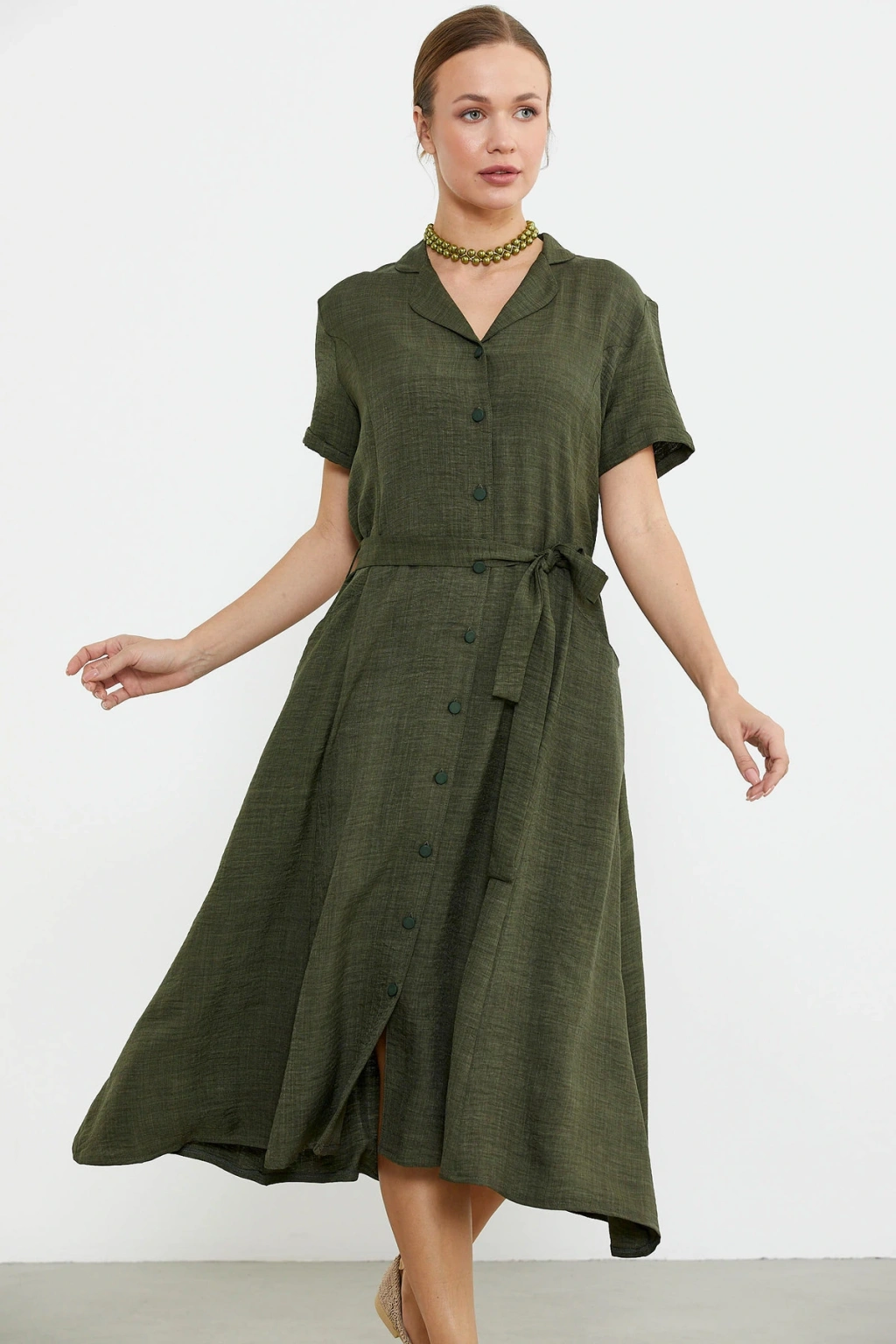 Çıkarılabilir kuşaklı gömlek model elbise midi boydur. Viskoz dokuma kumaştan üretilmiştir. Rahat kalıp, düğme kapamalıdır.