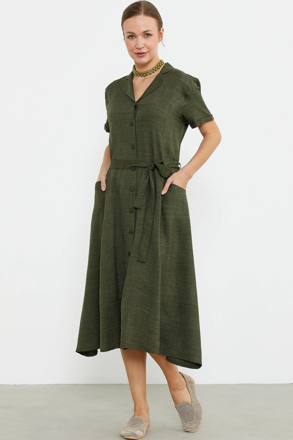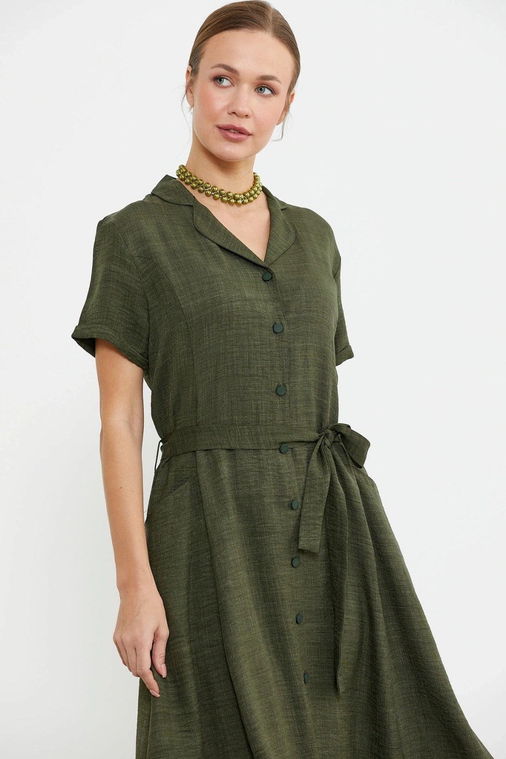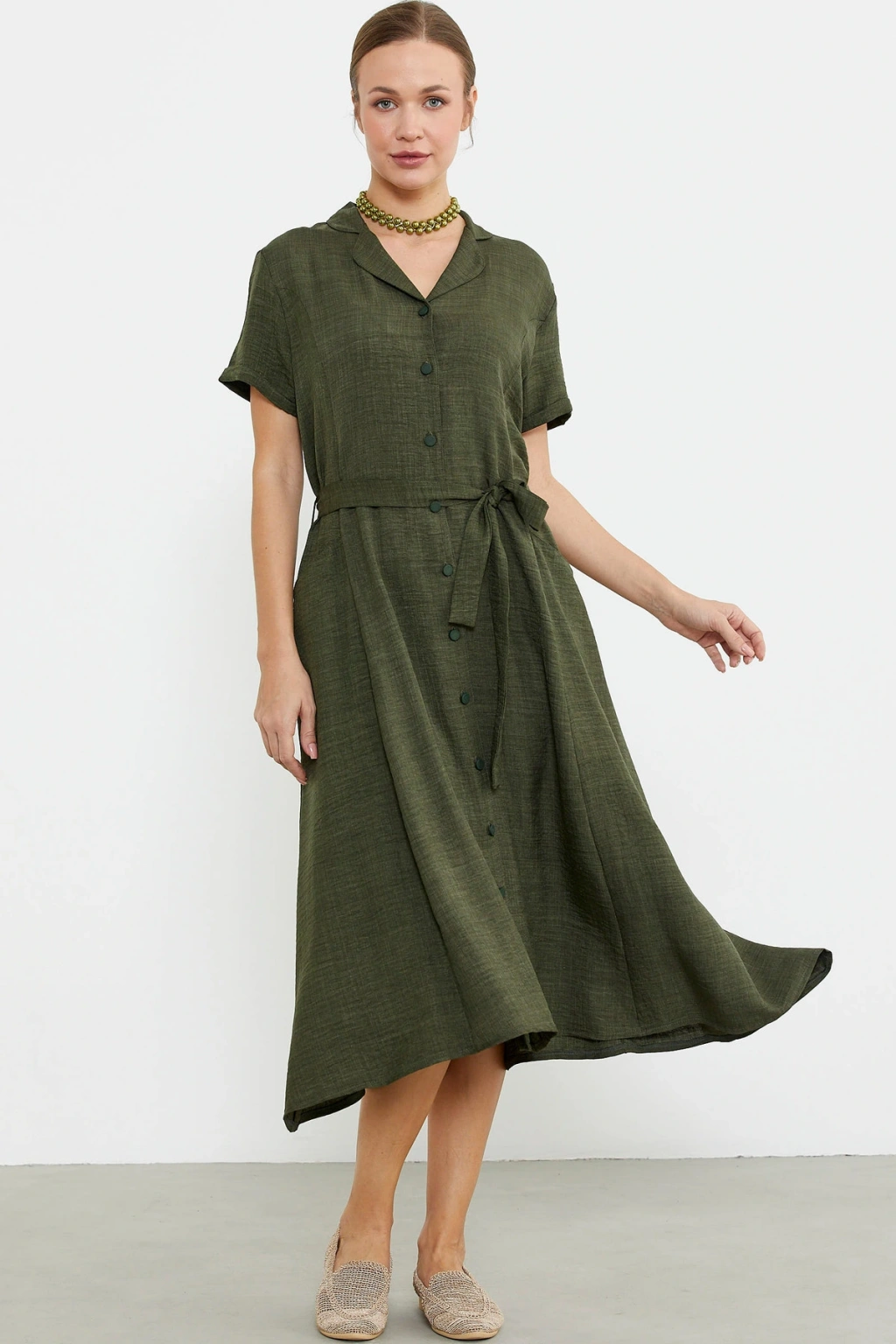 Çıkarılabilir kuşaklı gömlek model elbise midi boydur. Viskoz dokuma kumaştan üretilmiştir. Rahat kalıp, düğme kapamalıdır.
