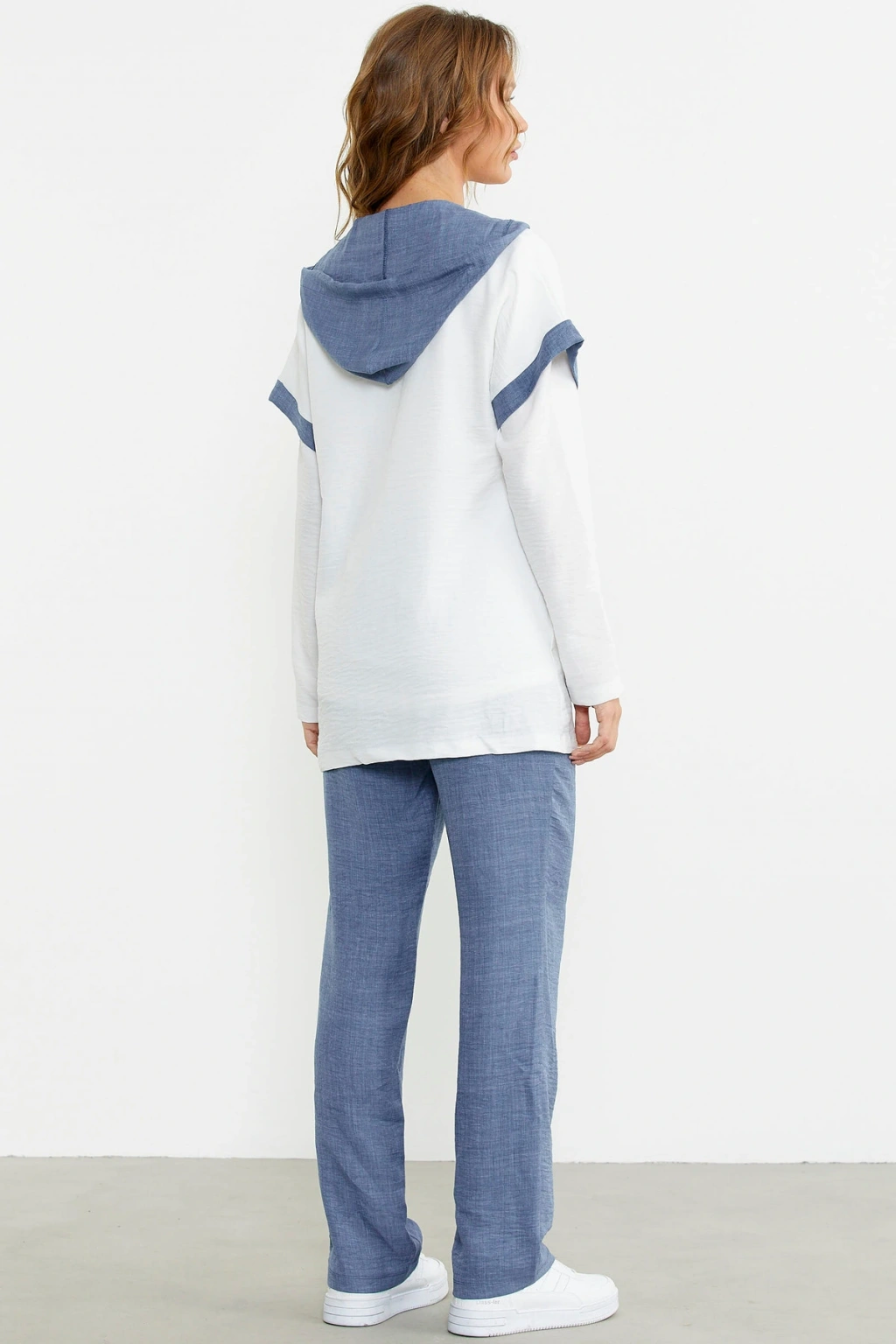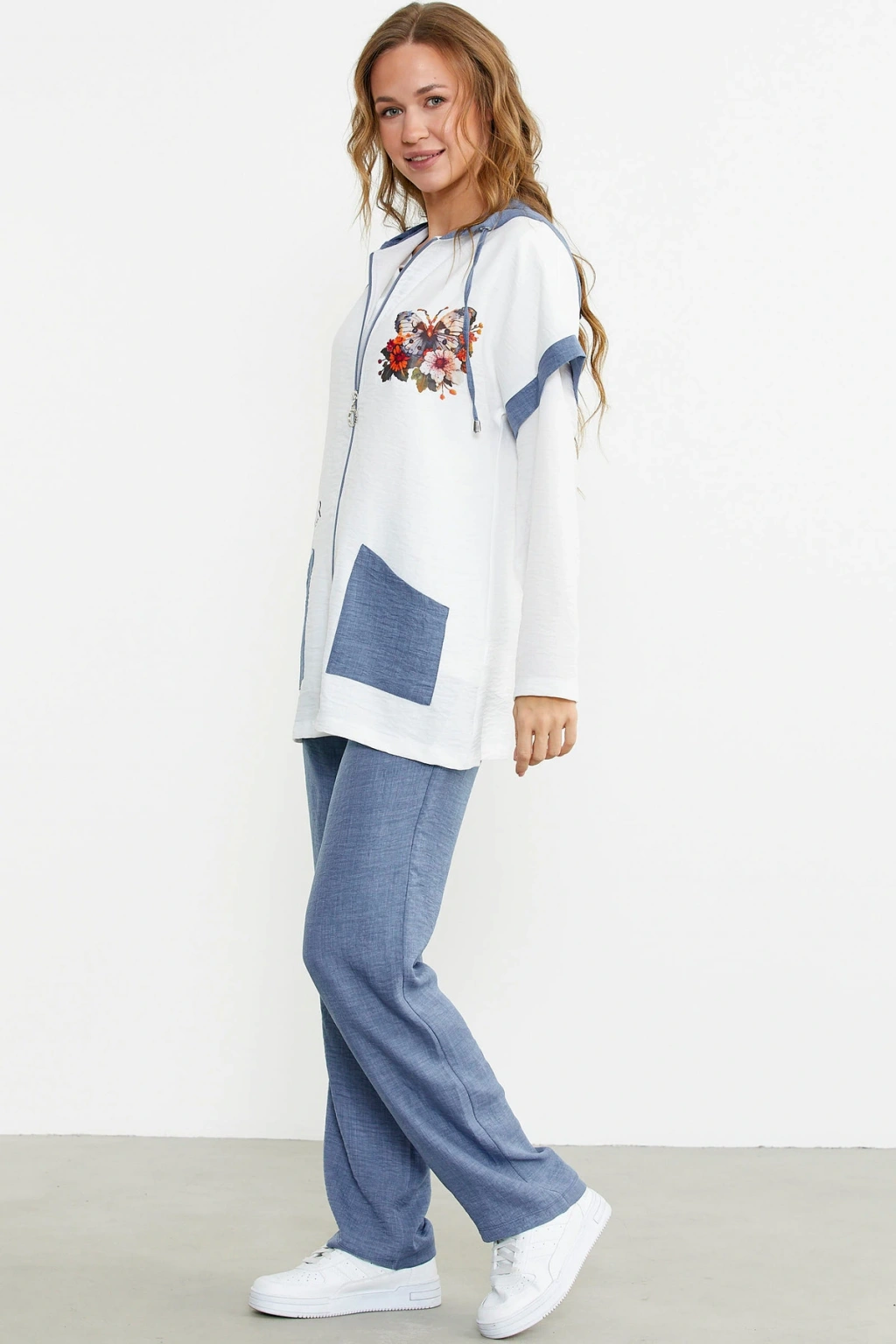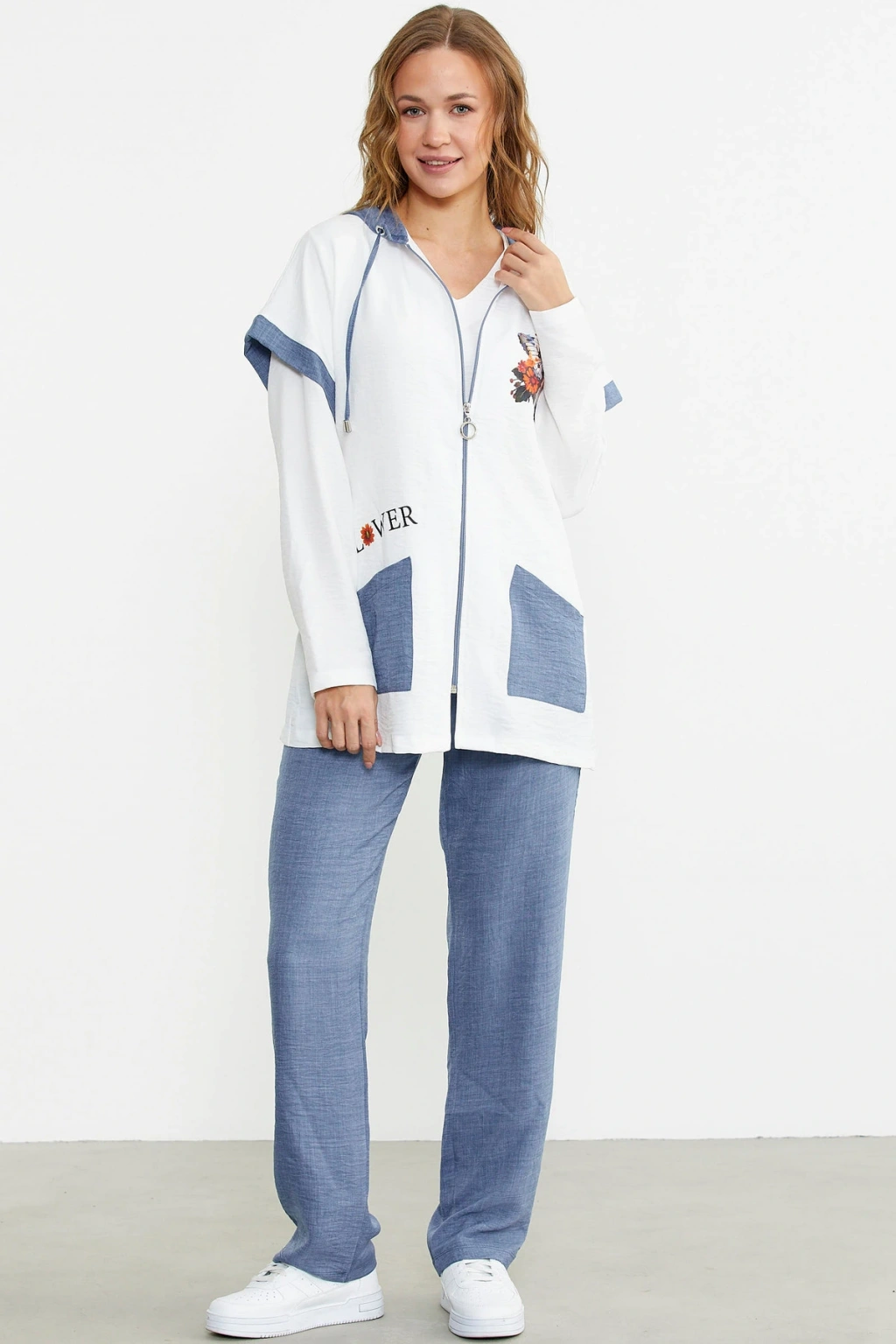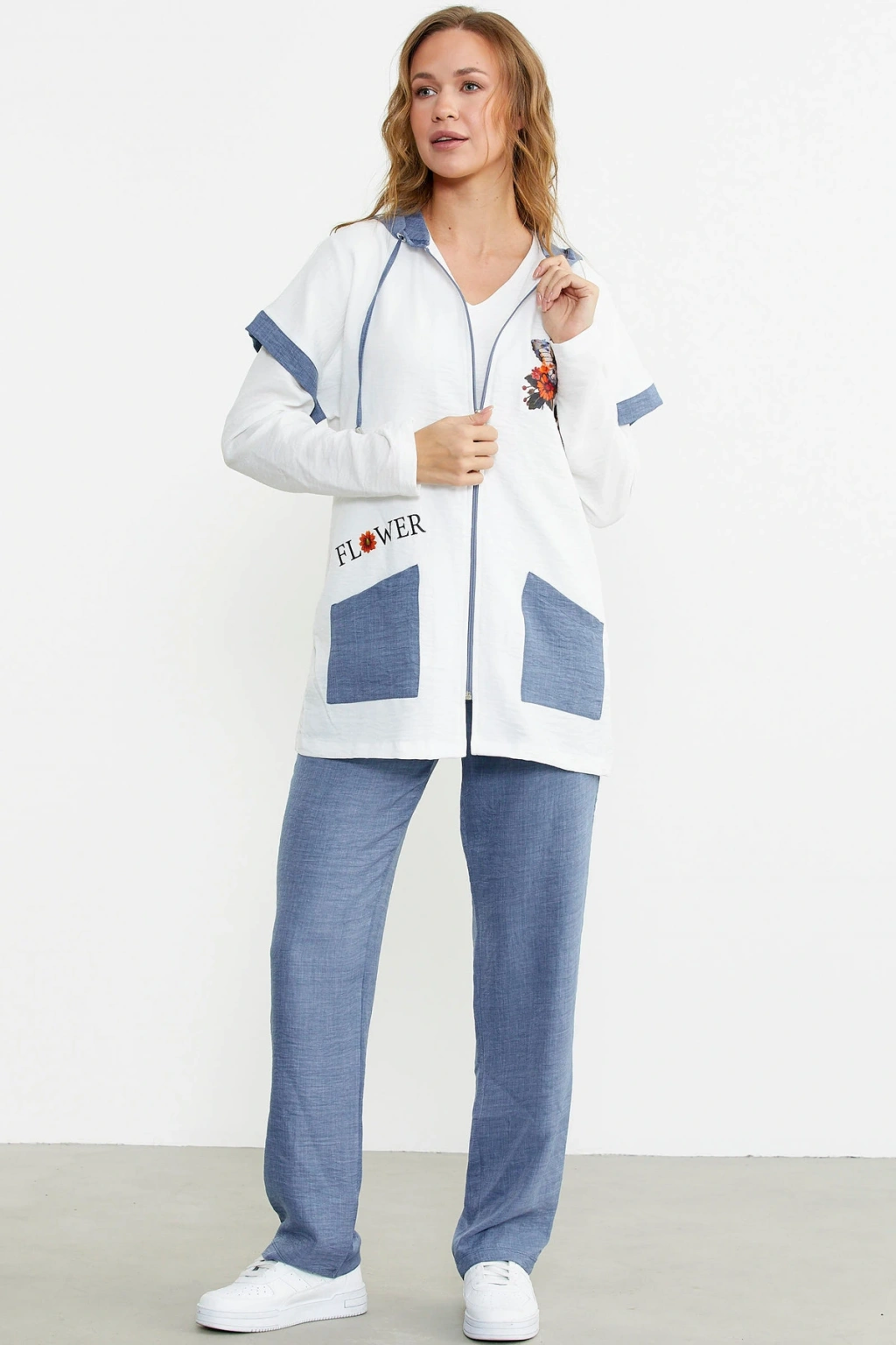 Krep dokulu kumaştan üretilmiş üçlü takım, renk kontrastlıdır.İçi uzun kollu düz, üst parça baskı detaylıdır. Rahat kalıp üretilmiştir.