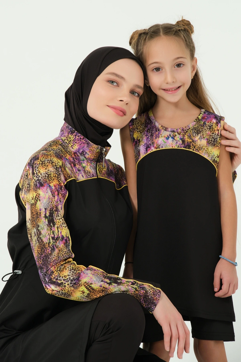 EN: Water-repellent: Lycra fabric with water-repellent . Half-patterned top. Sleeveless. Crew neck. Piping embellishment. Short leggings. Bonnet.