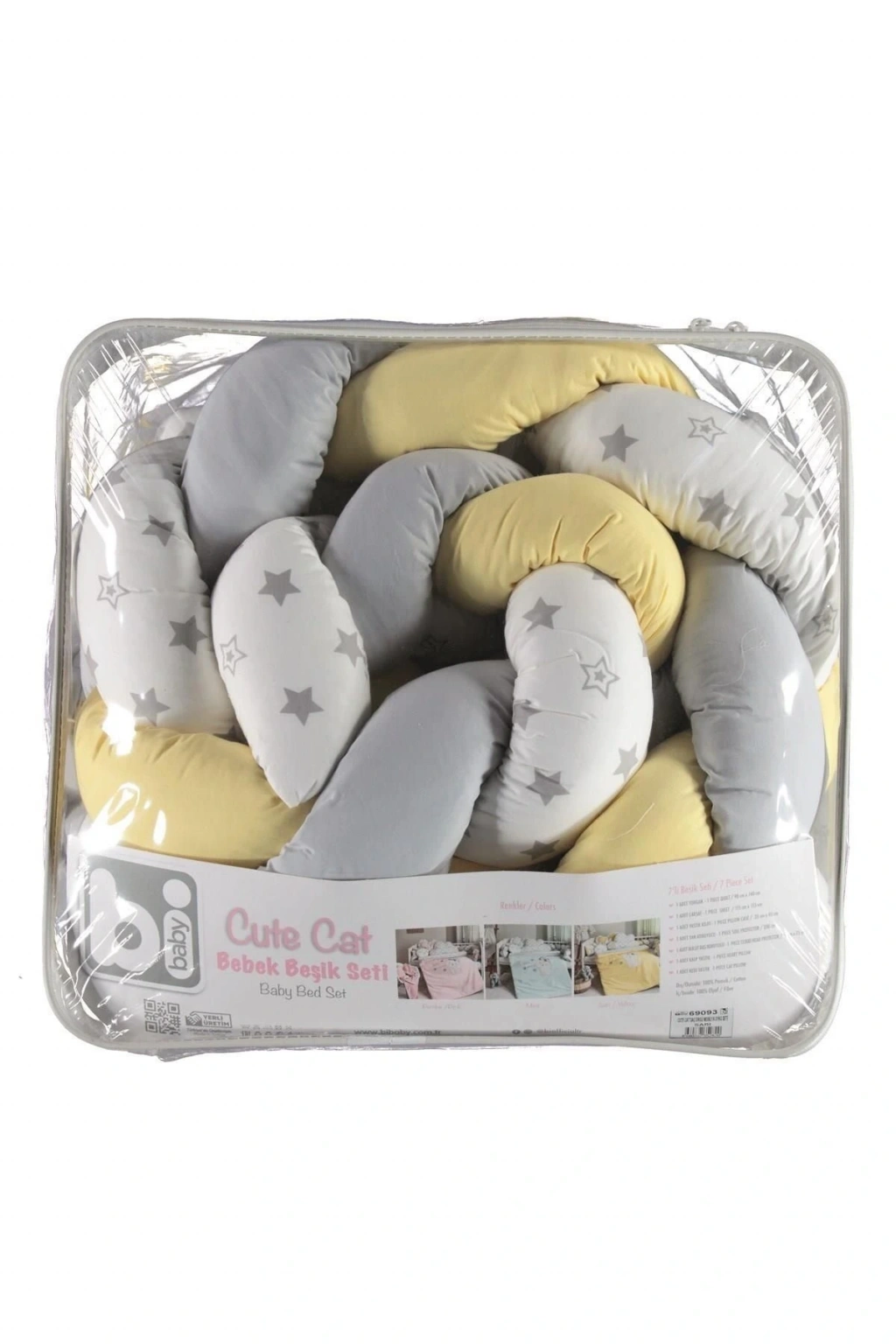 Paket içeriği: 1 adet yorgan 90*140 cm, 1 adet çarşaf 115*155 cm, 1 adet yastık kılıfı 35*45 cm, 1 adet yan koruyucu 200 cm, 1 adet bulut baş koruyucu 50*75 cm, 1 adet kalp yastık, 1 adet kedi yastık ; 7 parçadan oluşmaktadır. ; Bibaby ürünleri %100 pamuk kumaştan üretilmektedir. ; dış: %100 pamuk, iç: %100 elyaf ; Ürünlerin doğal ve yumuşak dokusu hem anneleri huzurlu hemde bebeklerin rahatını en üst seviyede tutar. ; Bibaby ürünleri bebeğinizin hassas cildini bozacak hiçbir kimyasal madde barındırmamaktadır. ; Bebeğinizin narin tenine uygundur. Bebeğinizin rahat hareket etmesini sağlar. ; Petrol içerikli kansorejen madde bulundurmaz ve dış kısmı pamuk iç kısmı ise elyaftır. ; Yıkama önerisi: ağartıcı kullanmadan 30 derece yıkayınız. ; Üretim yeri: türkiye ;
