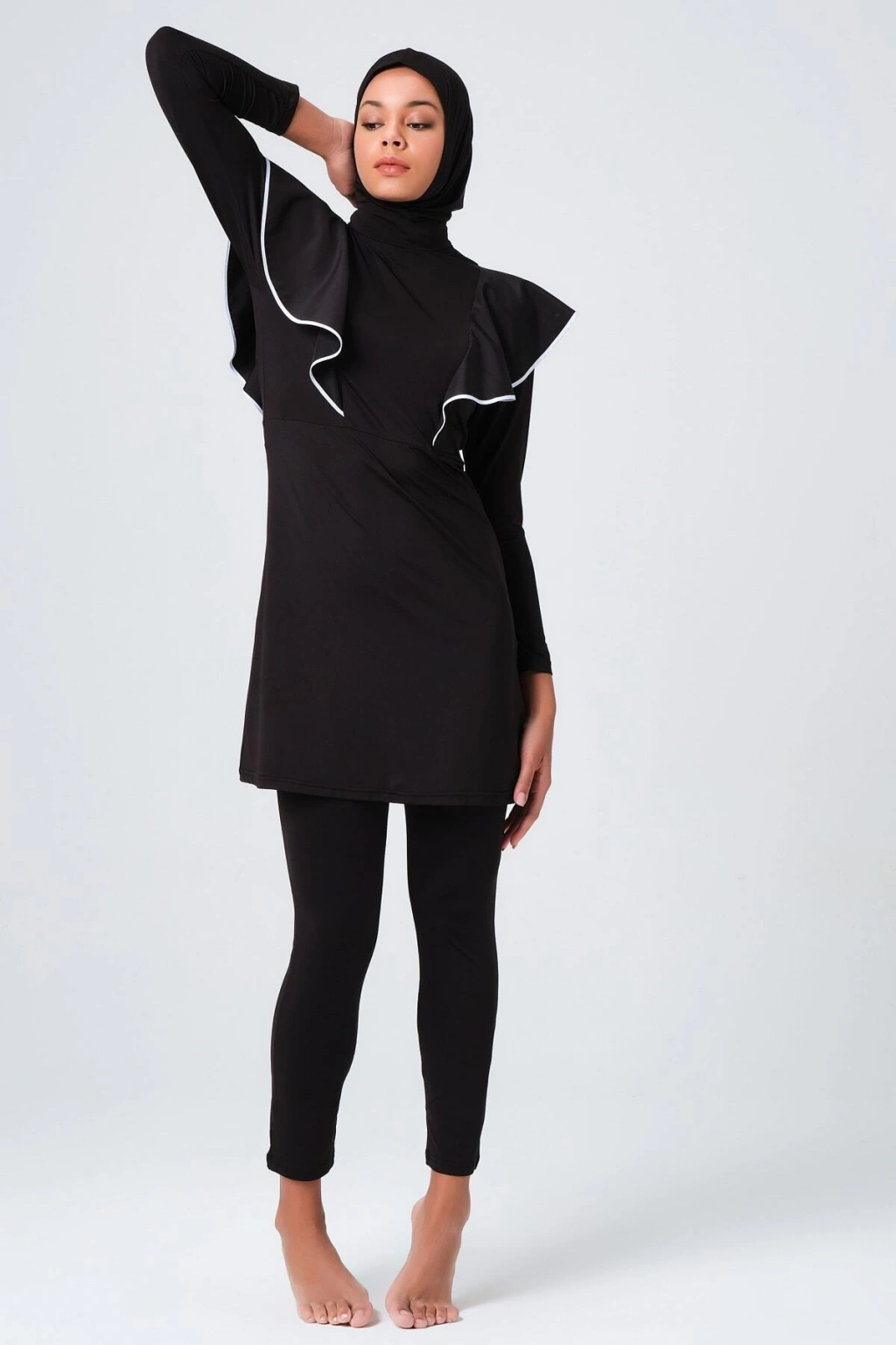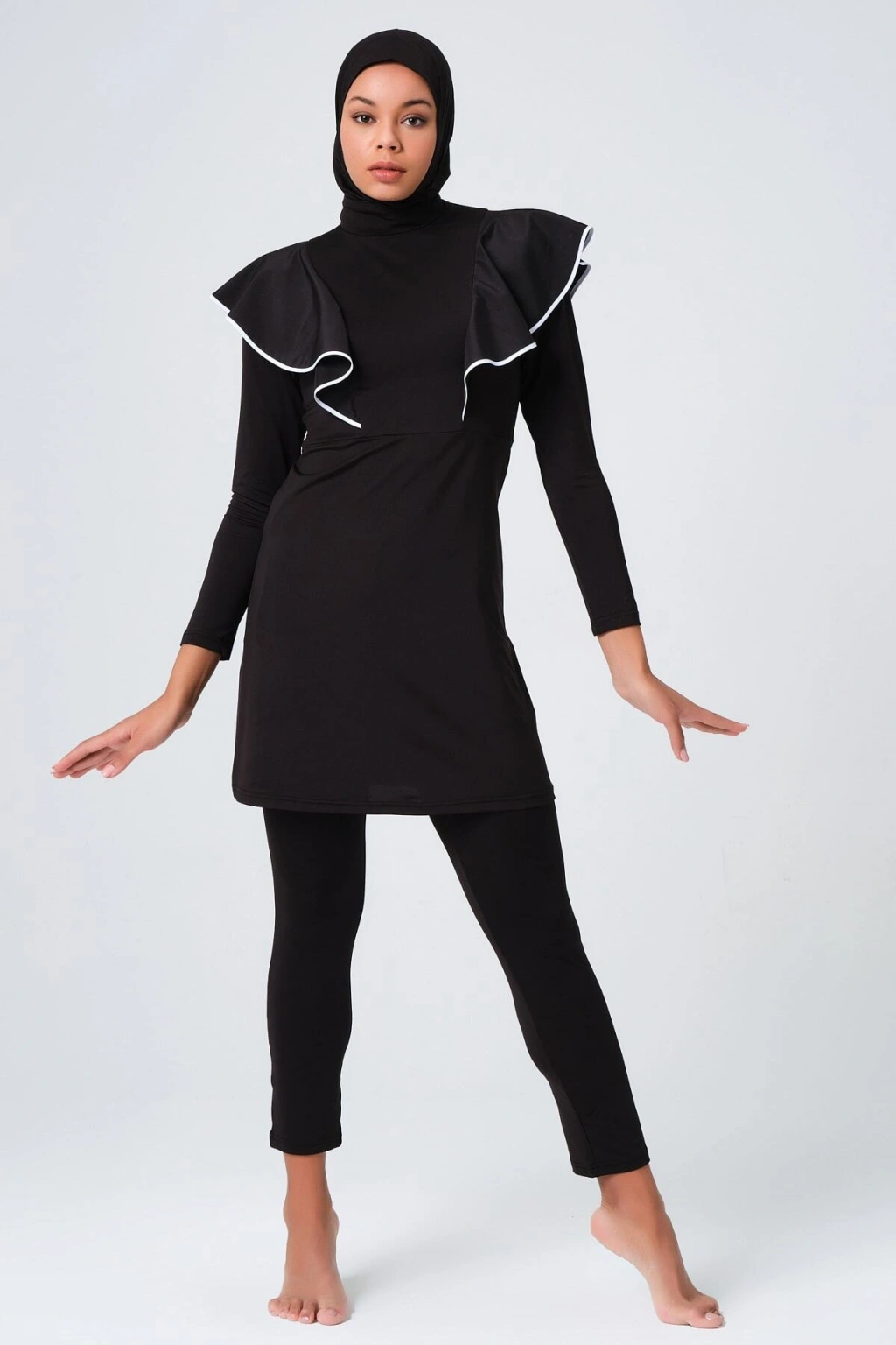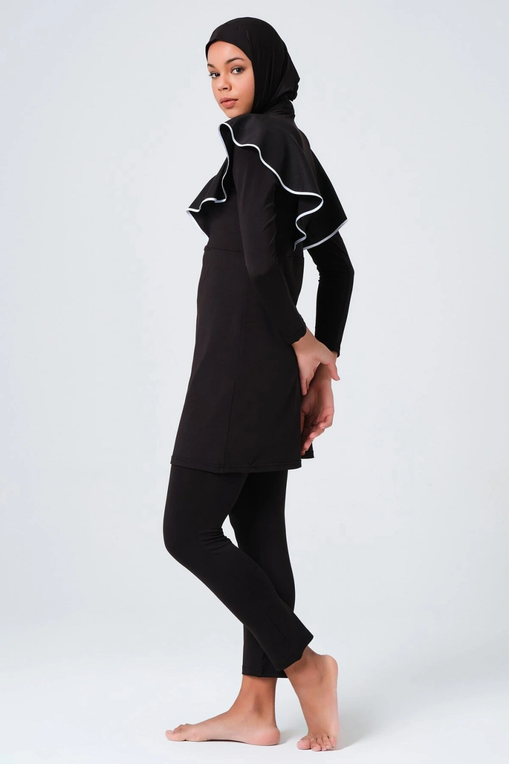 Renk : Siyah ; Tanım; Üst Beden : Su itici,suyu iten apreli likra kumaş. Üst desenli. Uzun kollu. Paraşüt kumaş volan detaylı. Kıl biye süslemeli. Dik yaka. Tayt. Eşarp ve bone. Tek parça iç çamaşır. ; Paket İçeriği : Üst, Tayt, Eşarp, Bone, Tek parça iç çamaşırı olmak üzere 5 parçadan oluşmaktadır. Hızlı kuruma, kolay yüzme olanağı sağlar. ; Ürün Ölçüleri: ; S Göğüs 86 cm, Bel 81 cm, Basen 94 cm, Uzunluk 90 cm ; M Göğüs 90 cm, Bel 85 cm, Basen 98 cm, Uzunluk 91 cm ; L Göğüs 94 cm, Bel 89 cm, Basen 102 cm, Uzunluk 92 cm ; XL Göğüs 98 cm, Bel 93 cm , Basen 106 cm, Uzunluk 93 cm ; 2XL Göğüs 102 cm, Bel 97 cm, Basen 110 cm, Uzunluk 94 cm ; 3XL Göğüs 106 cm, Bel 101 cm, Basen 114 cm, Uzunluk 95 cm ; Modelin üzerindeki ürün S bedendir. ; Modelin vücut ölçüleri : Boy:1.76 cm, Göğüs 90 cm, Bel 66 cm, Basen 94 cm.