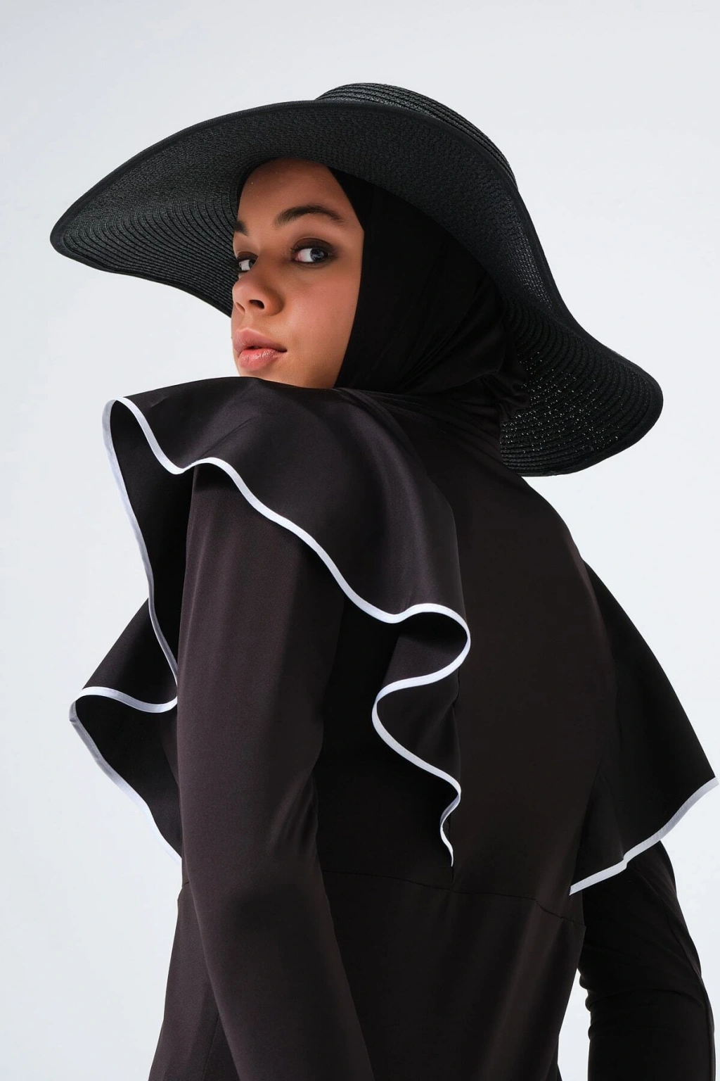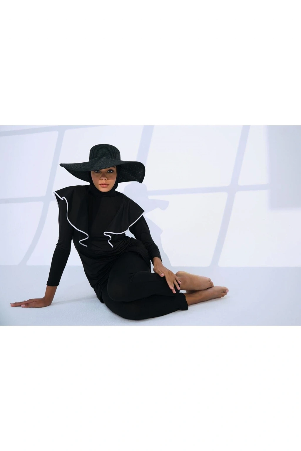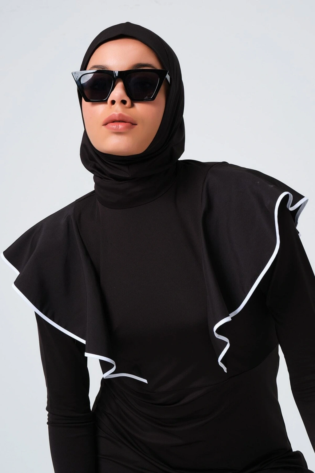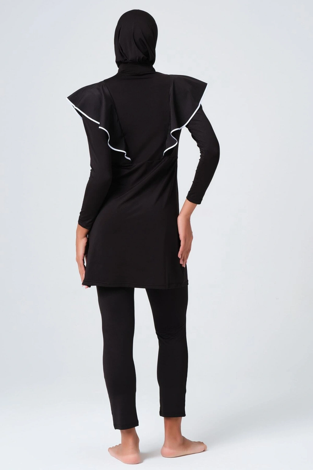 Renk : Siyah ; Tanım; Üst Beden : Su itici,suyu iten apreli likra kumaş. Üst desenli. Uzun kollu. Paraşüt kumaş volan detaylı. Kıl biye süslemeli. Dik yaka. Tayt. Eşarp ve bone. Tek parça iç çamaşır. ; Paket İçeriği : Üst, Tayt, Eşarp, Bone, Tek parça iç çamaşırı olmak üzere 5 parçadan oluşmaktadır. Hızlı kuruma, kolay yüzme olanağı sağlar. ; Ürün Ölçüleri: ; S Göğüs 86 cm, Bel 81 cm, Basen 94 cm, Uzunluk 90 cm ; M Göğüs 90 cm, Bel 85 cm, Basen 98 cm, Uzunluk 91 cm ; L Göğüs 94 cm, Bel 89 cm, Basen 102 cm, Uzunluk 92 cm ; XL Göğüs 98 cm, Bel 93 cm , Basen 106 cm, Uzunluk 93 cm ; 2XL Göğüs 102 cm, Bel 97 cm, Basen 110 cm, Uzunluk 94 cm ; 3XL Göğüs 106 cm, Bel 101 cm, Basen 114 cm, Uzunluk 95 cm ; Modelin üzerindeki ürün S bedendir. ; Modelin vücut ölçüleri : Boy:1.76 cm, Göğüs 90 cm, Bel 66 cm, Basen 94 cm.