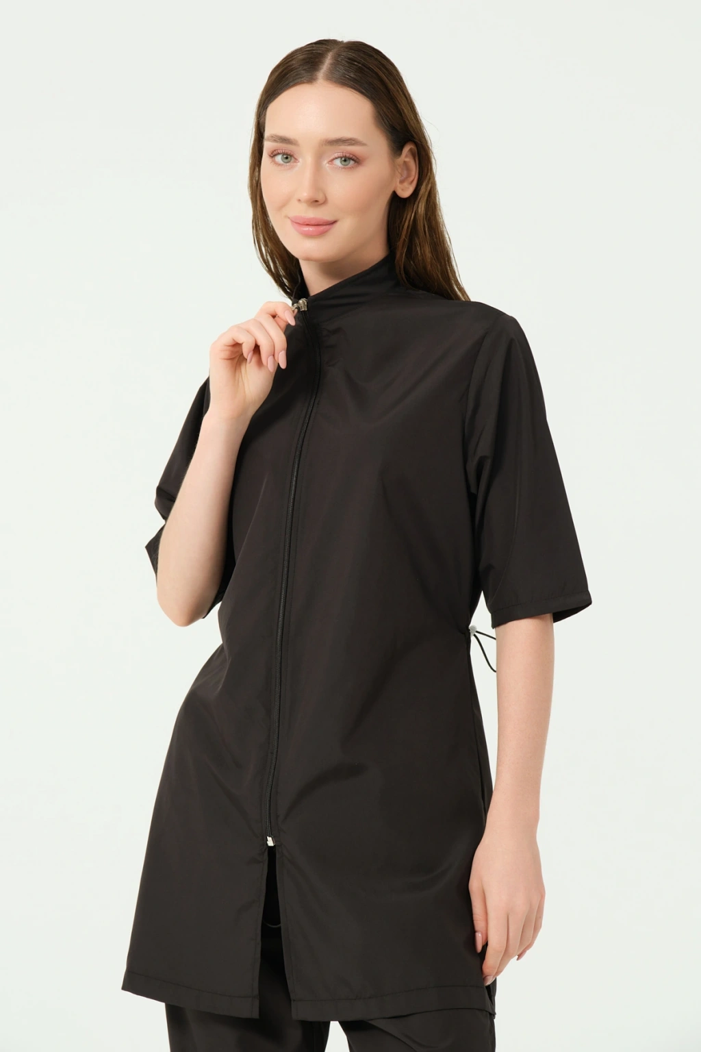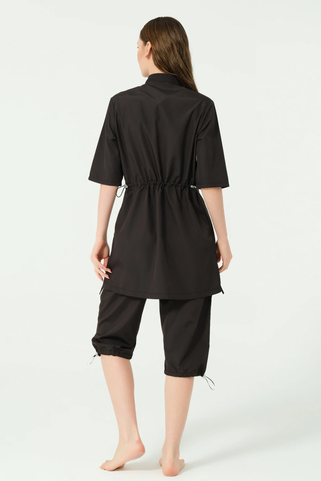 TR: Su itici: Suyu iten apreli paraşüt kumaş. Üst kısa kollu. Önü fermuar kapamalı. Dik yaka. Kısa pantolon. Likra bone. Tek parça iç çamaşır. Basic tasarım.