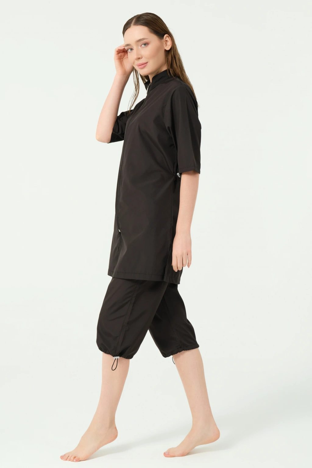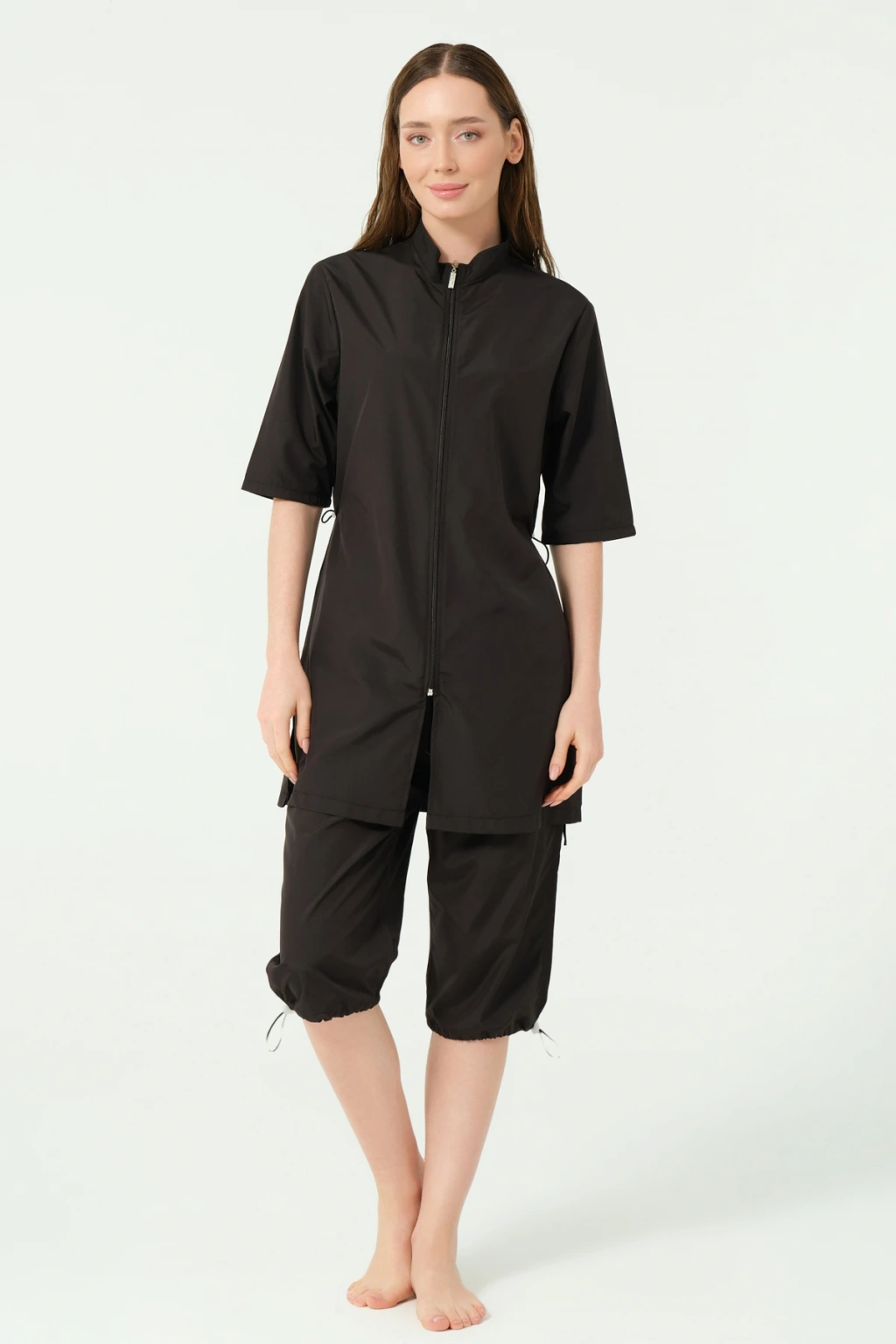 EN: Water-repellent: Lycra fabric with water-repellent . Short-sleeved top. Zippered front. High collar. Short pants. Lycra bonnet. One-piece bustier. Basic design.