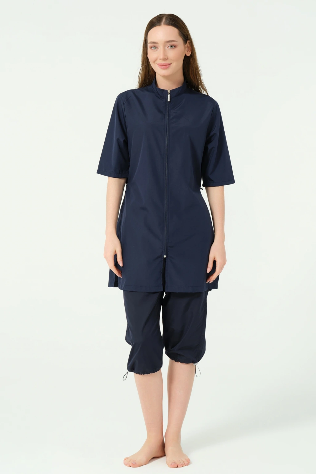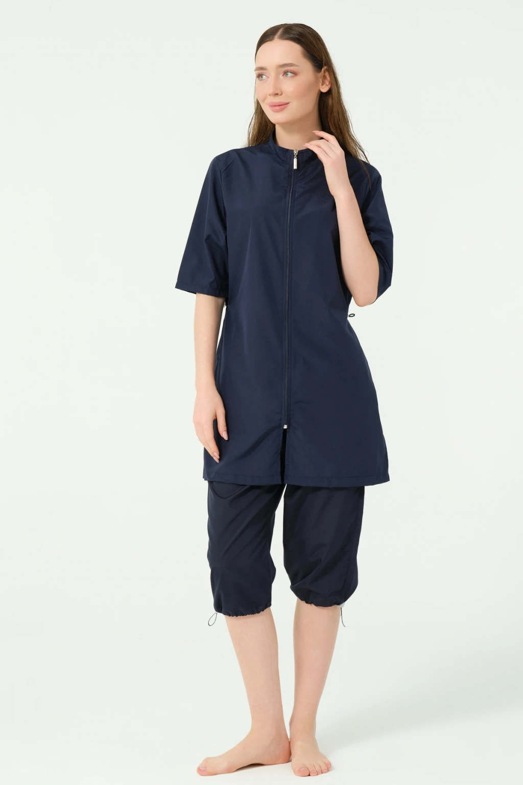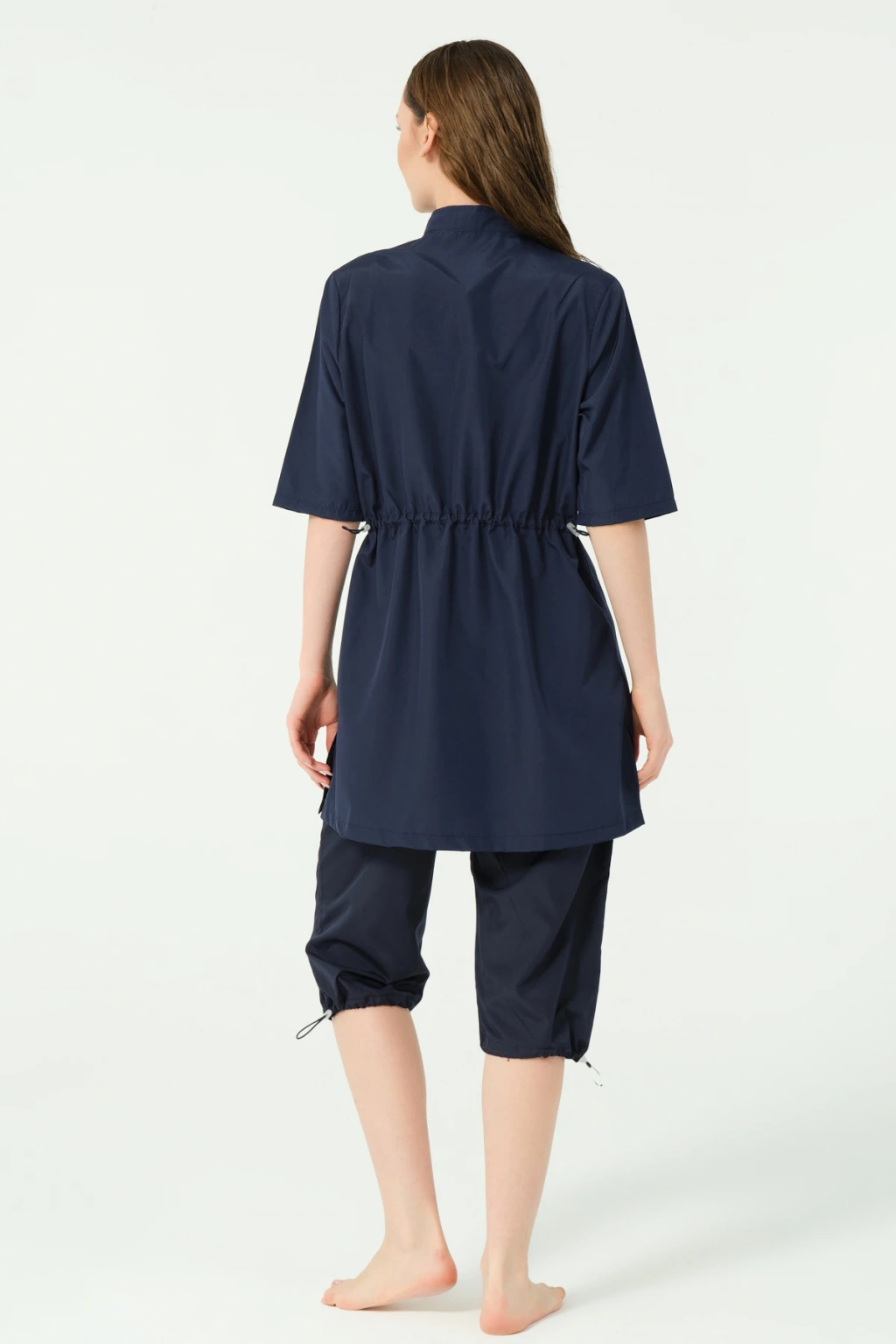 TR: Su itici: Suyu iten apreli paraşüt kumaş. Üst kısa kollu. Önü fermuar kapamalı. Dik yaka. Kısa pantolon. Likra bone. Tek parça iç çamaşır. Basic tasarım.