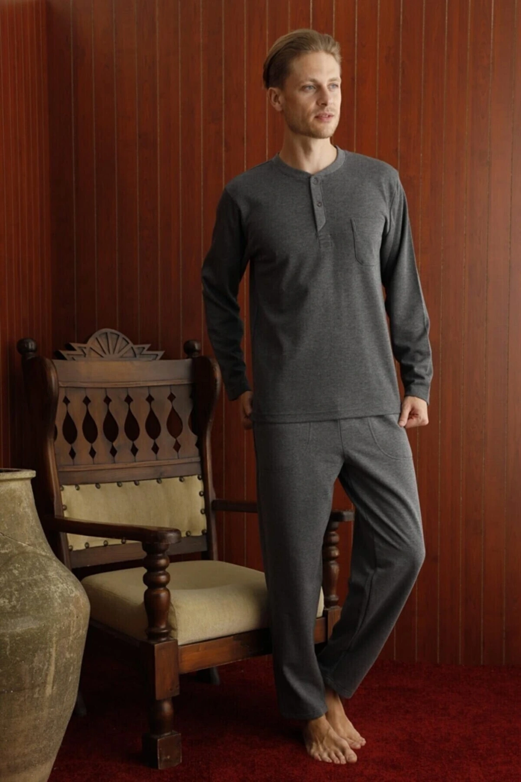 - Rahat kesimi ile günlük kullanım için ideal, regular kalıpta tasarlanmıştır.; - Uzun kollu ve uzun paçalı yapısıyla mevsim geçişlerinde konfor sunar.; - Antrasit rengiyle şıklığı ve rahatlığı bir arada yaşatır; evdeki stilinizi tamamlar.; - Dokuma kumaşı sayesinde yumuşak dokunuşuyla cildinize nazikçe sarılır.; - Homewear koleksiyonuna ait bu pijama takımı, ev giyiminizin vazgeçilmezi olacak.; - Pamuklu materyali ile nefes alabilir yapıda olup gün boyu rahatlık sağlar.; - Kolay bakım imkanı sunan yıkama talimatlarına sahiptir; böylece zamandan tasarruf edersiniz.; - Düz deseniyle sadelikten yana olanların tercihi olurken, her türden üst giysiyle kolayca kombinlenebilir.; - Normal bel yüksekliği sayesinde konforlu bir oturuşa sahip olmanızı sağlar.; - Bisiklet yakası modern ve minimalist bir görünüm kazandırırken, düğmeli detaylar pratik kullanım sunar.; - İnterlok dokuma tipi dayanıklılığı arttırarak uzun süreli kullanım vaad eder.