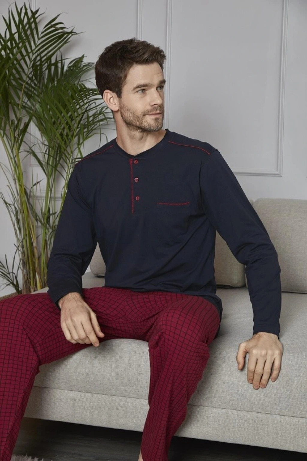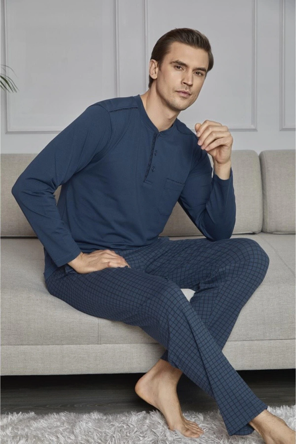 Rahatlık ve şıklığı bir arada sunan düz desenli pijama takımı, uzun paça boyu ve uzun kollarıyla konforlu bir kullanım sağlar.; Uzun boy tasarımı ile bacaklarınızı tamamen sararak sıcak tutar ve rahat hareket etme özgürlüğü sunar.; Uzun kolları sayesinde kollarınızın tamamını kapatarak soğuk havalarda ekstra koruma sağlar.; Düz tasarımıyla zamansız bir şıklık sunarken, düğme detayları modern bir dokunuş katmaktadır.;