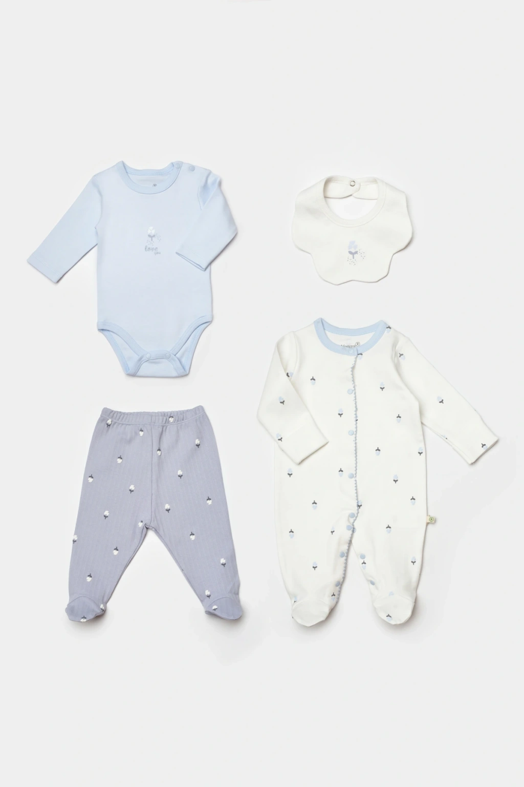 Set İçeriği : - Üst zıbın - Patikli Pantolon - Kendinden eldivenli tulum - Önlük - Bebeğinizin cildine zarar vermeyen, organik pamuklu kumaştan üretilmiştir.; - Günlük kullanım için ideal olan bu set, rahatlığı ve şıklığı bir arada sunar.; - Çiçek desenleriyle bebeğinizin odasına neşe katarken, göz alıcı bir görünüm sağlar.; - 4 parçadan oluşan set; bebeklerinize özel ihtiyaçlarını karşılamak üzere tasarlanmıştır.; - Sürdürülebilirlik ilkesini benimseyen organik materyaller kullanılarak üretilmiştir, çevre dostudur.; - Her pakette yer alan 4 parça ile bebeğinizin ihtiyaç duyduğu temel eşyalar tek seferde elinizin altında olacak.; - Tasarım koleksiyonuna ait bu set, modern ve estetik detaylarıyla dikkat çekerken fonksiyonellikten ödün vermez.;