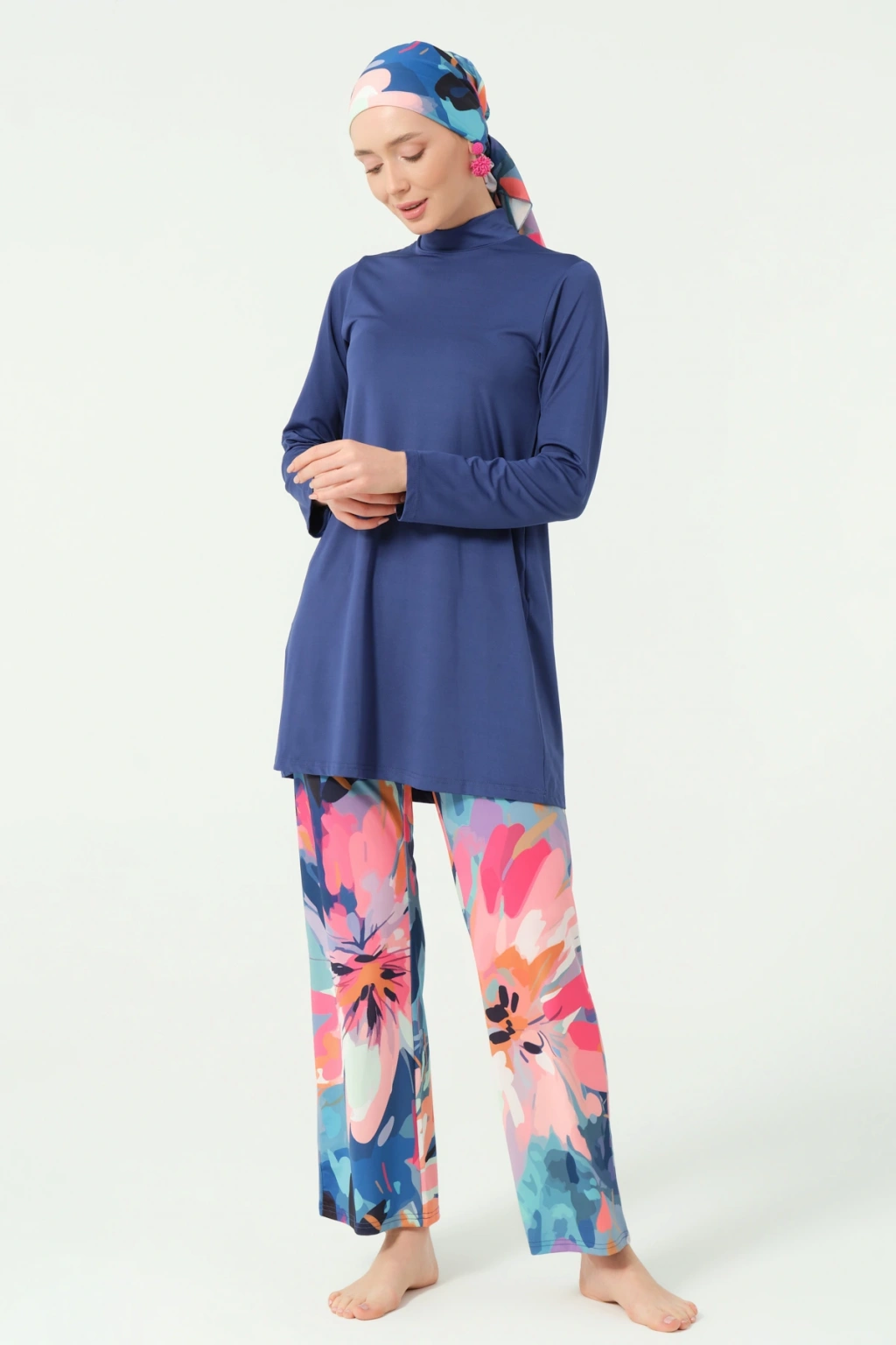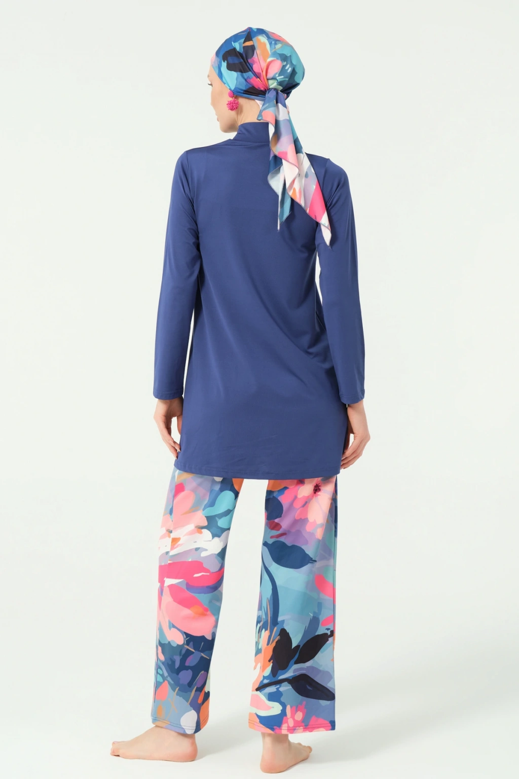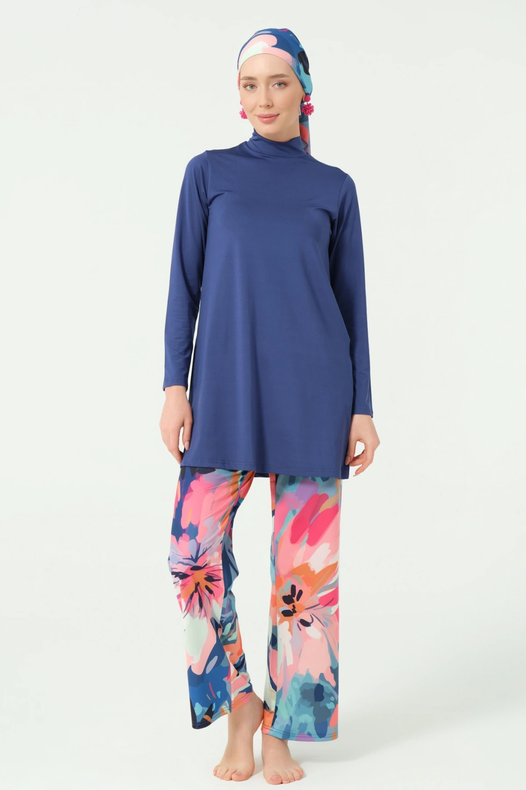 Lian Kıl Biye Detaylı Paraşüt Kumaş Tam Kapalı Tesettür Mayo Lacivert DLX-25289