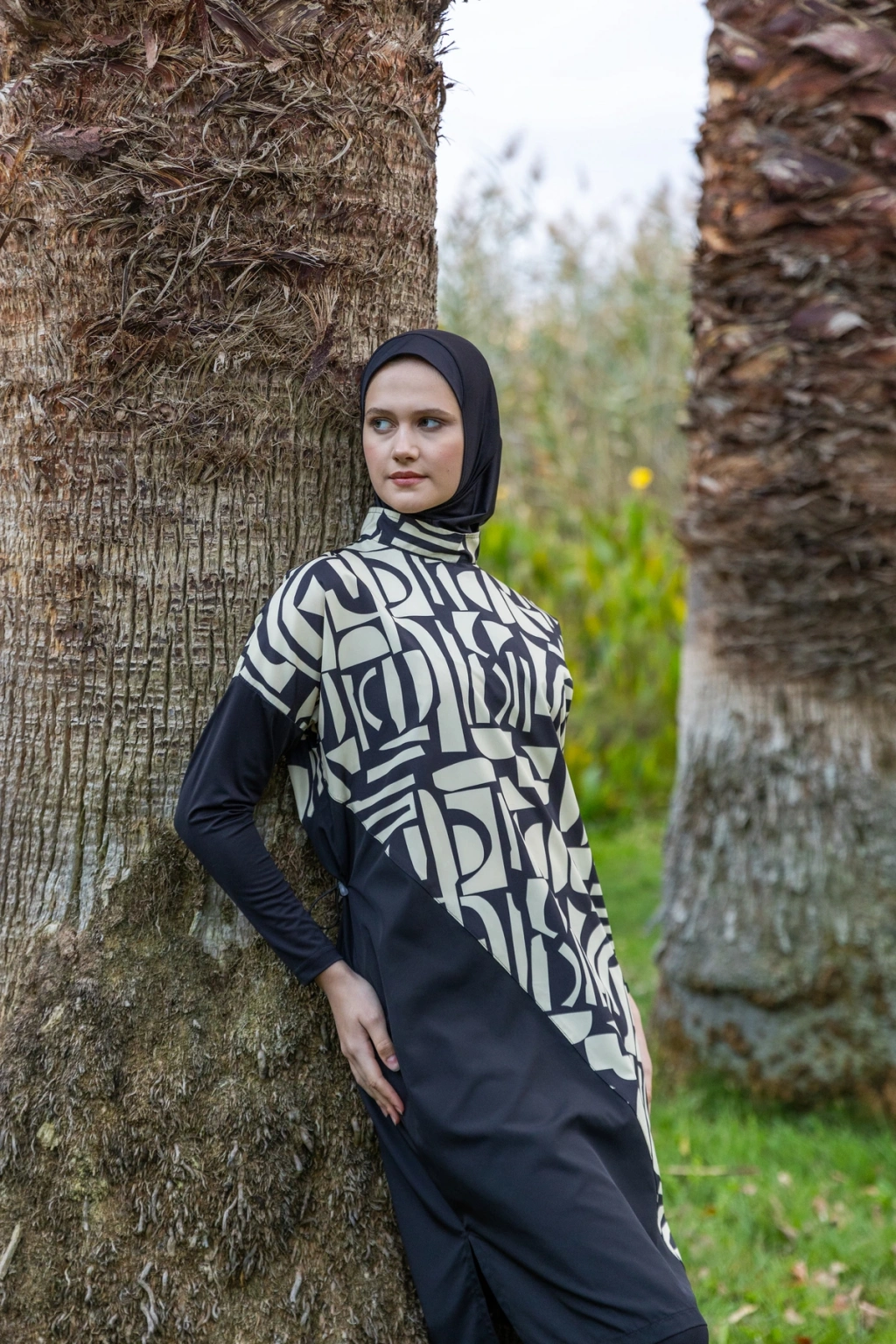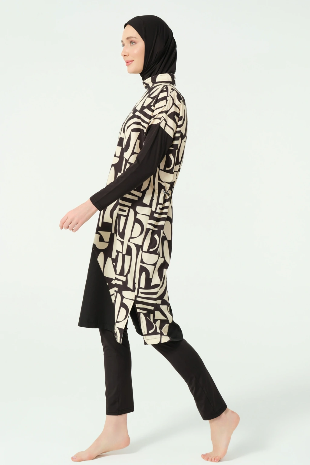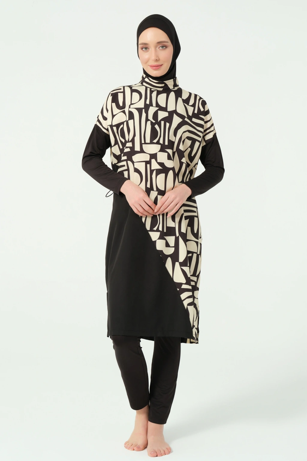TR: Üst, Tayt, Eşarp, Bone, Tek parça iç çamaşırı olmak üzere 5 parçadan oluşmaktadır. Hızlı kuruma, kolay yüzme olanağı sağlar.