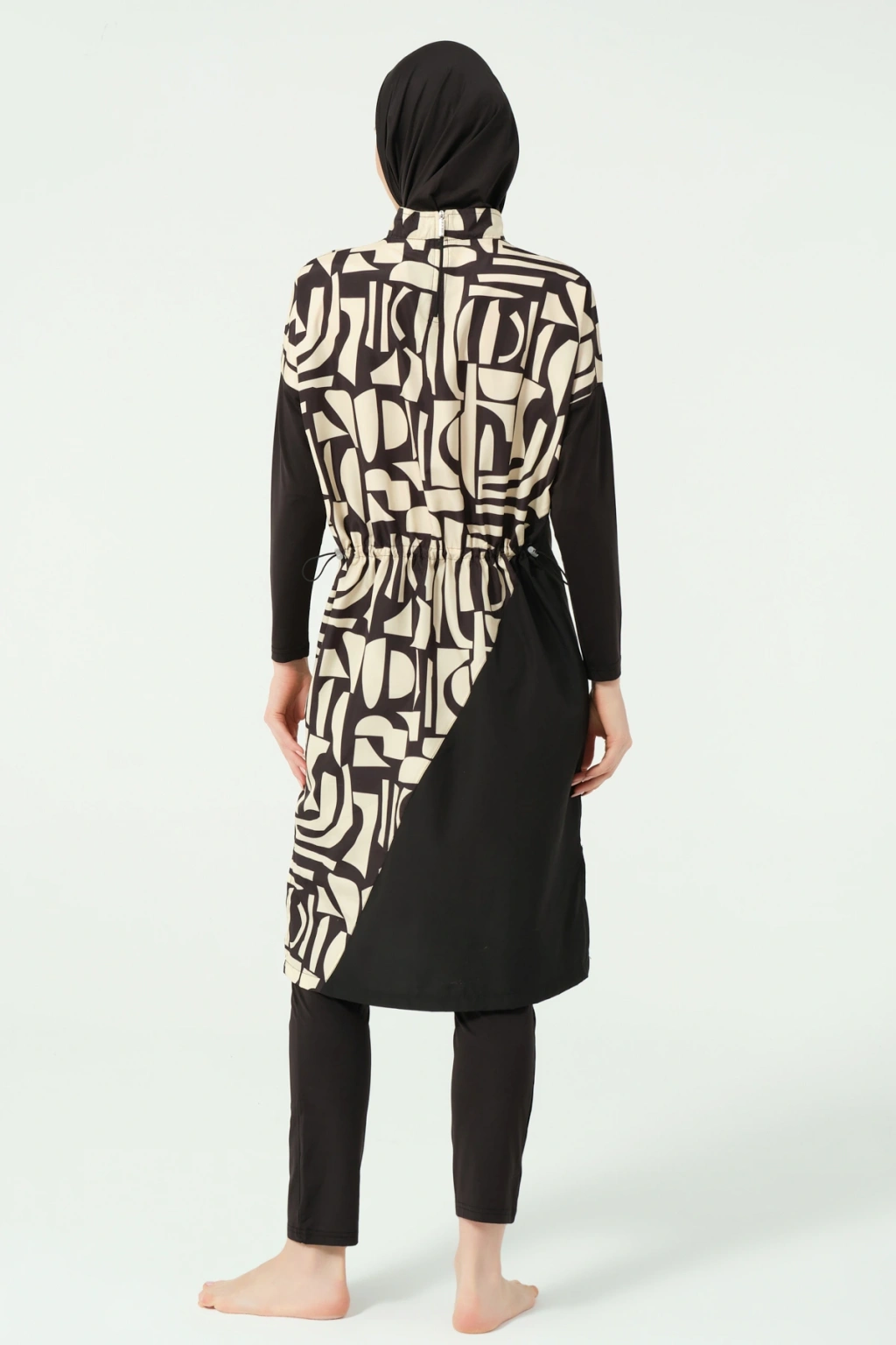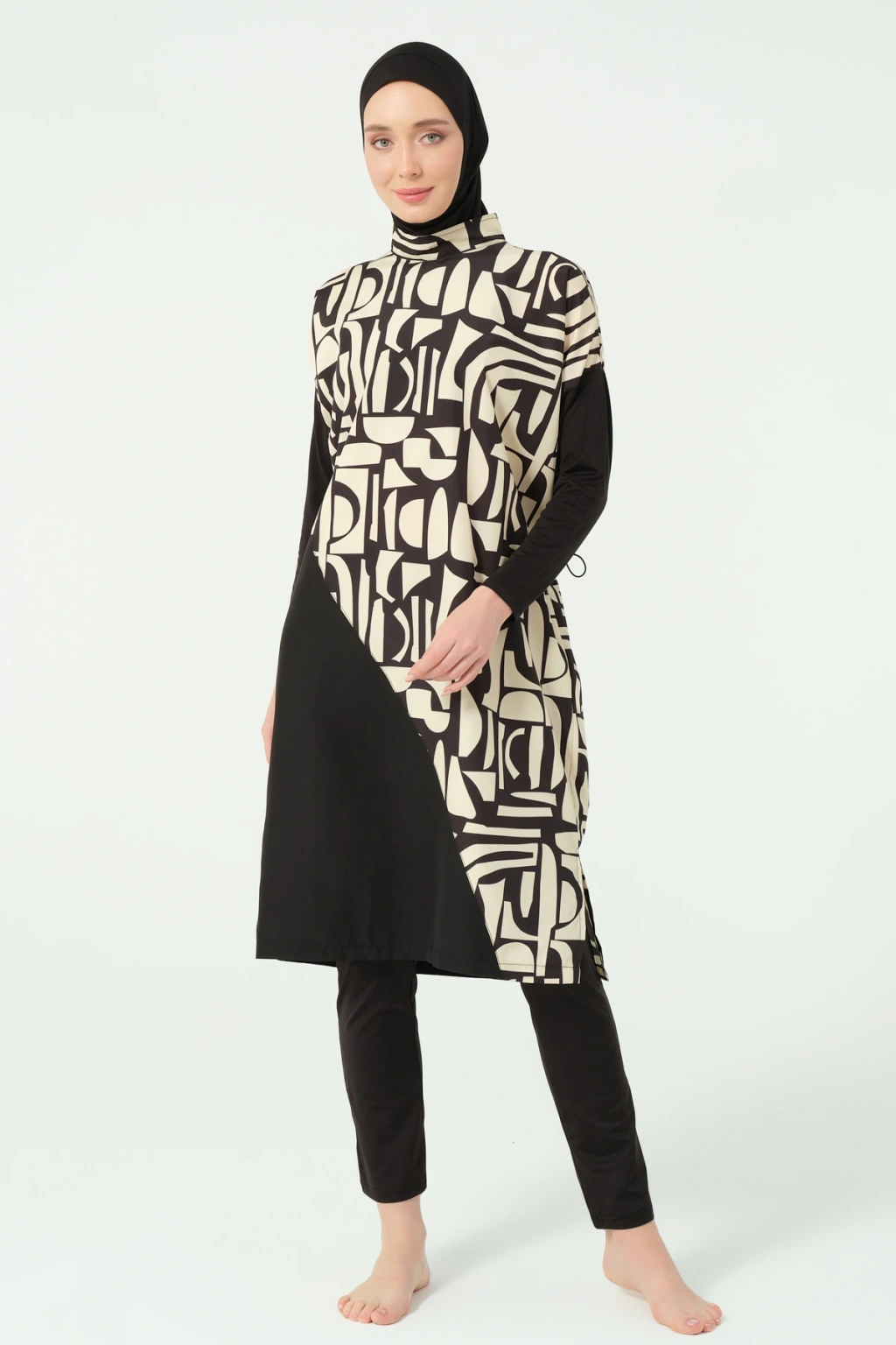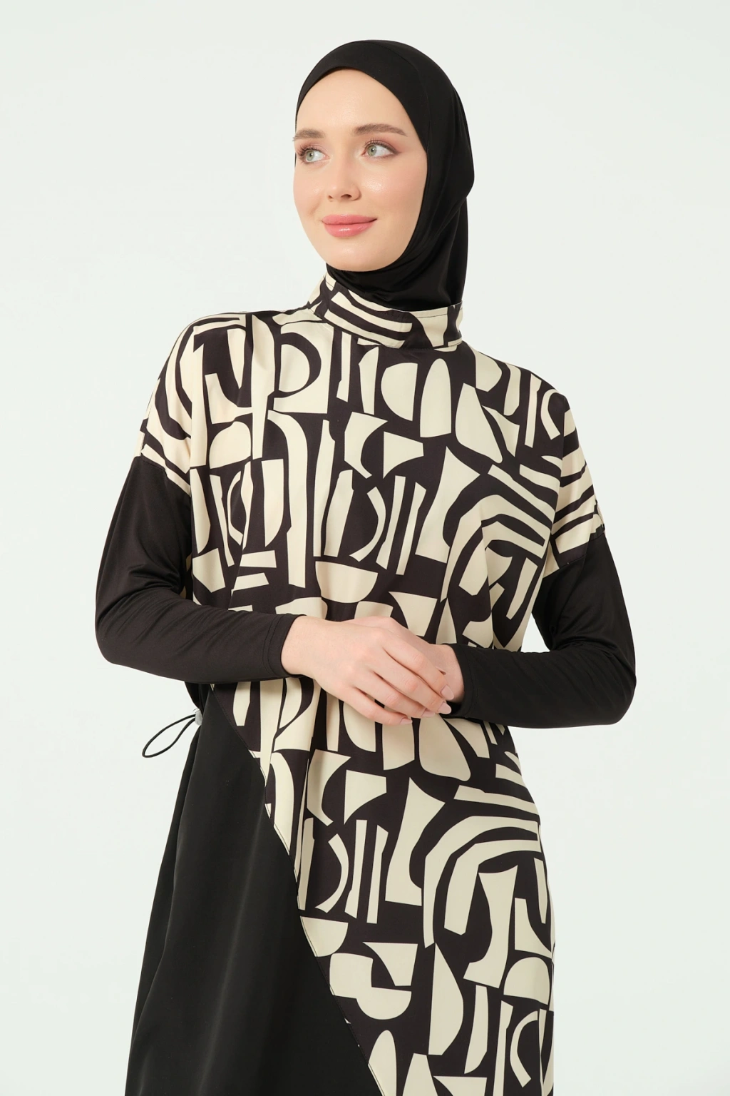 TR: Üst, Tayt, Eşarp, Bone, Tek parça iç çamaşırı olmak üzere 5 parçadan oluşmaktadır. Hızlı kuruma, kolay yüzme olanağı sağlar.