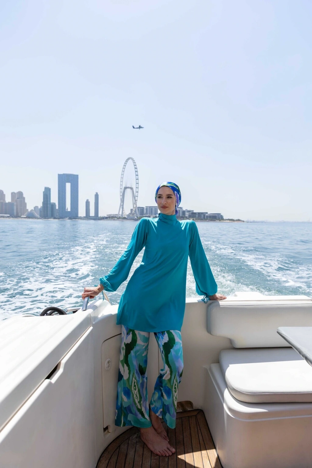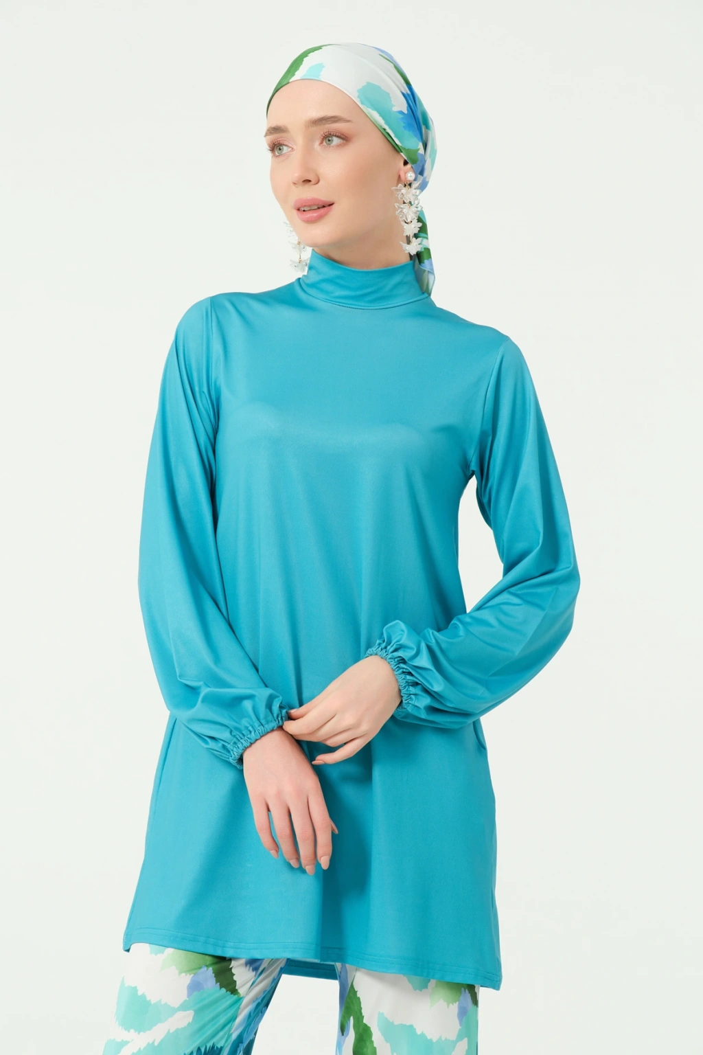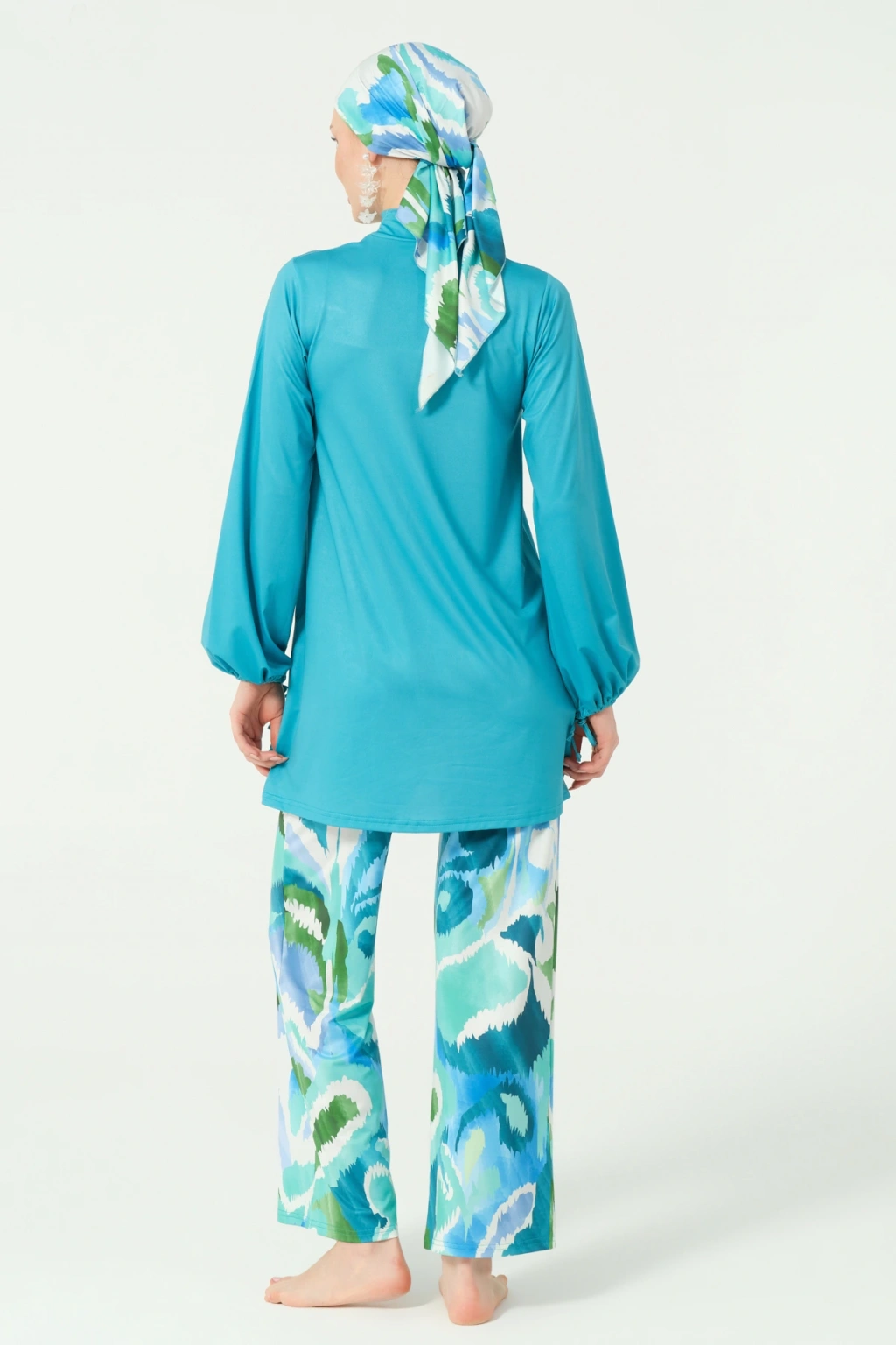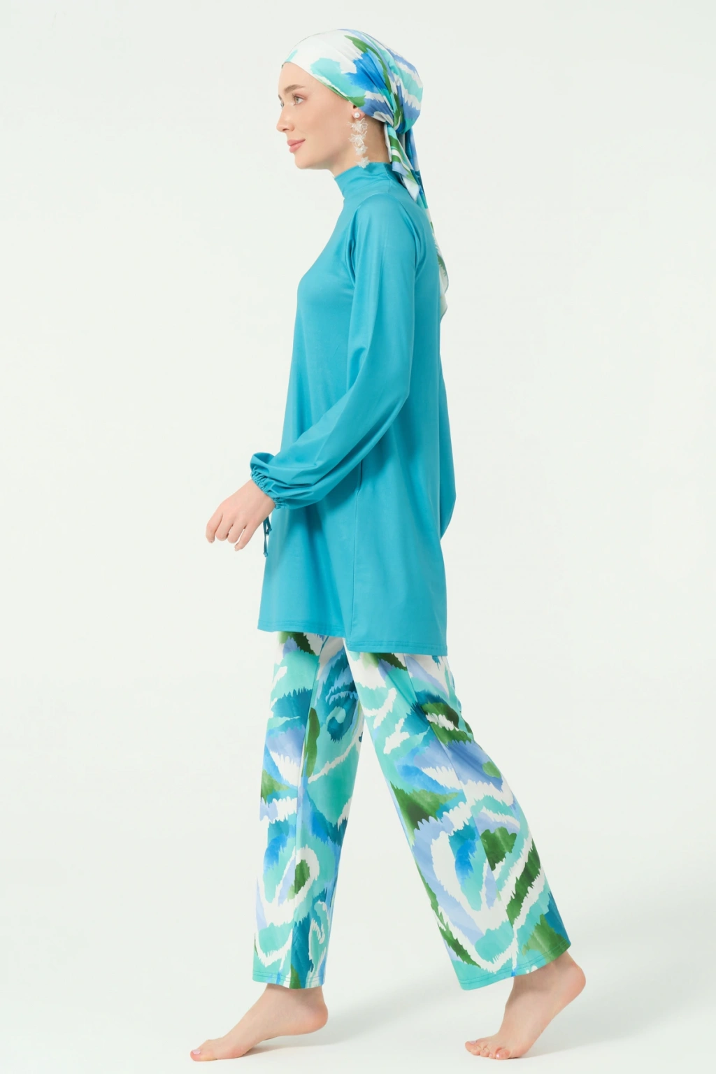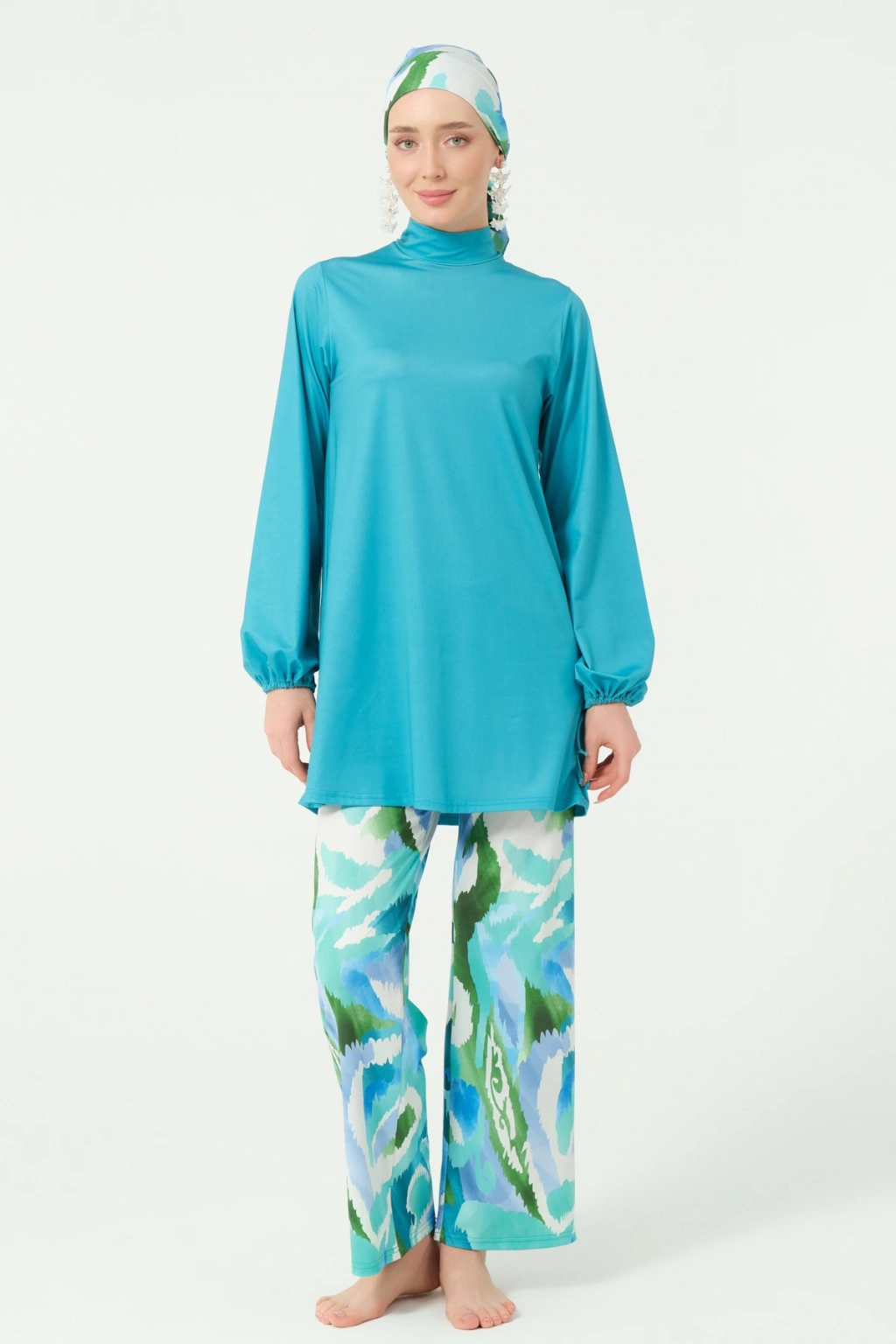 TR: Su itici: Suyu iten apreli likra kumaş. Üst klasik bol kalıp. Uzun kollu. Kol ucu büzmeli. Dik yaka. Bol paça desenli pantolon. Paçası sıkma kordonlu. Tek parça iç çamaşır. Desenli üçgen eşarp ve bone.