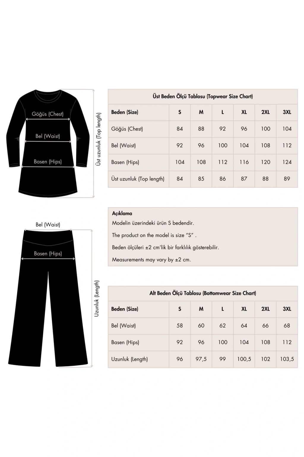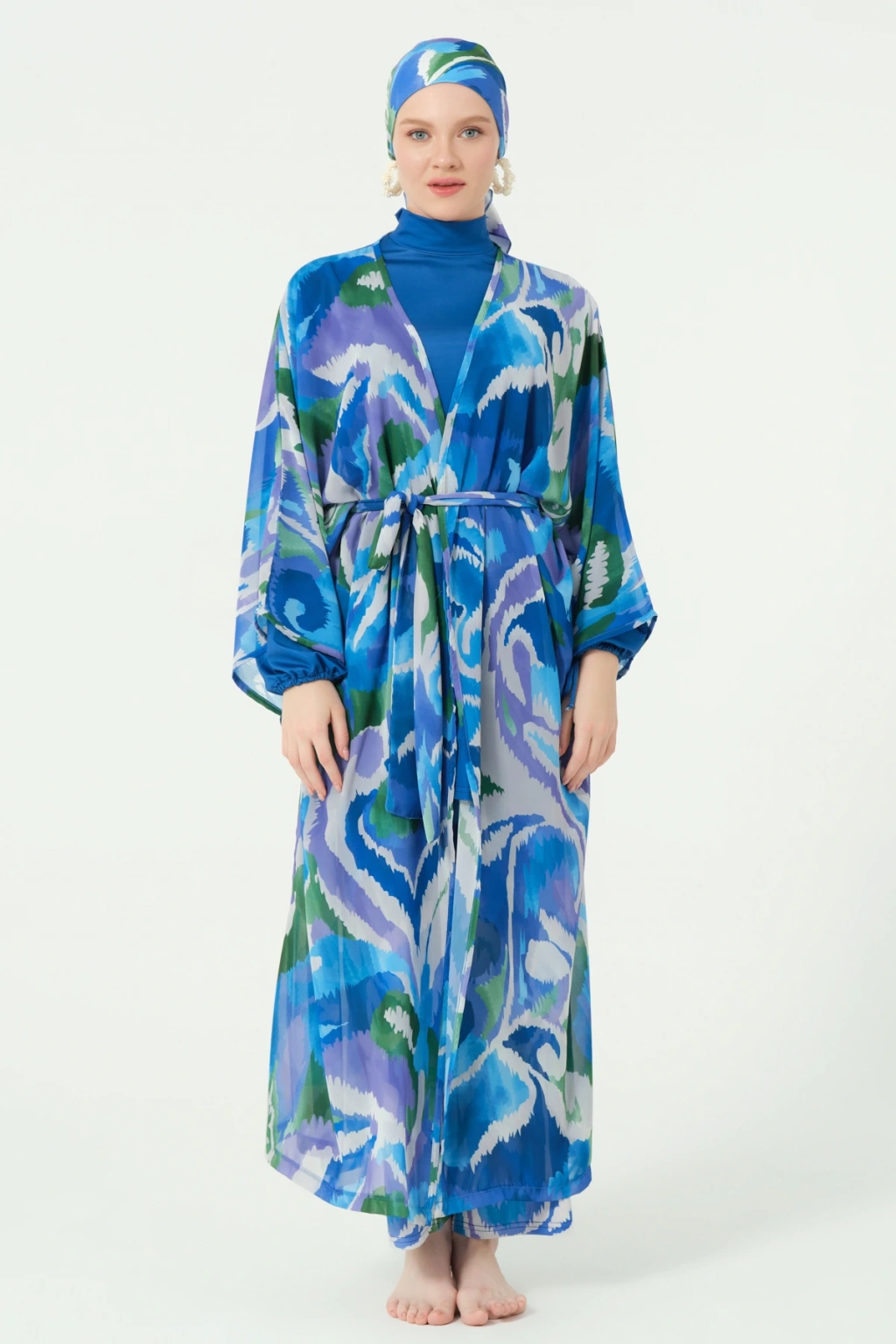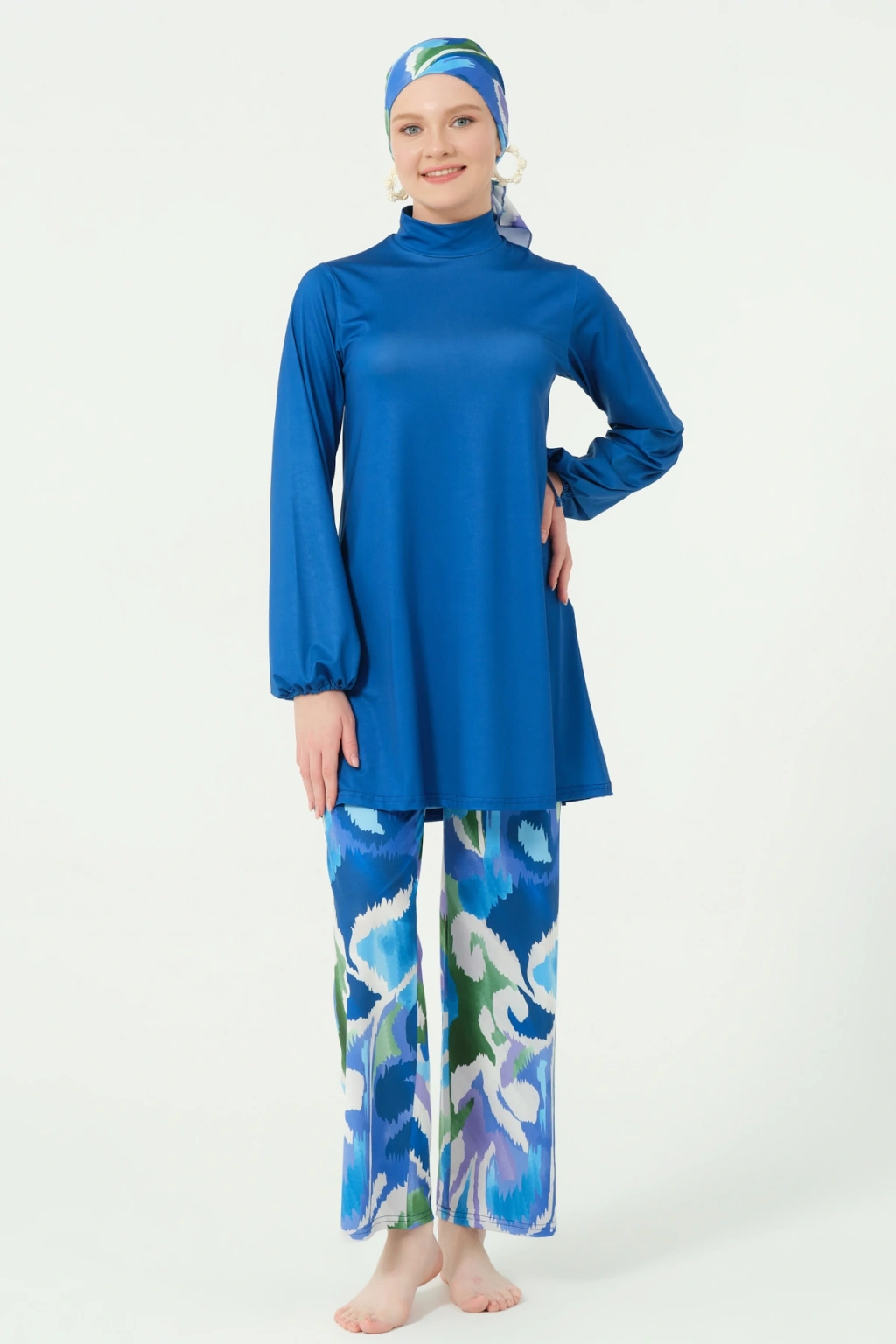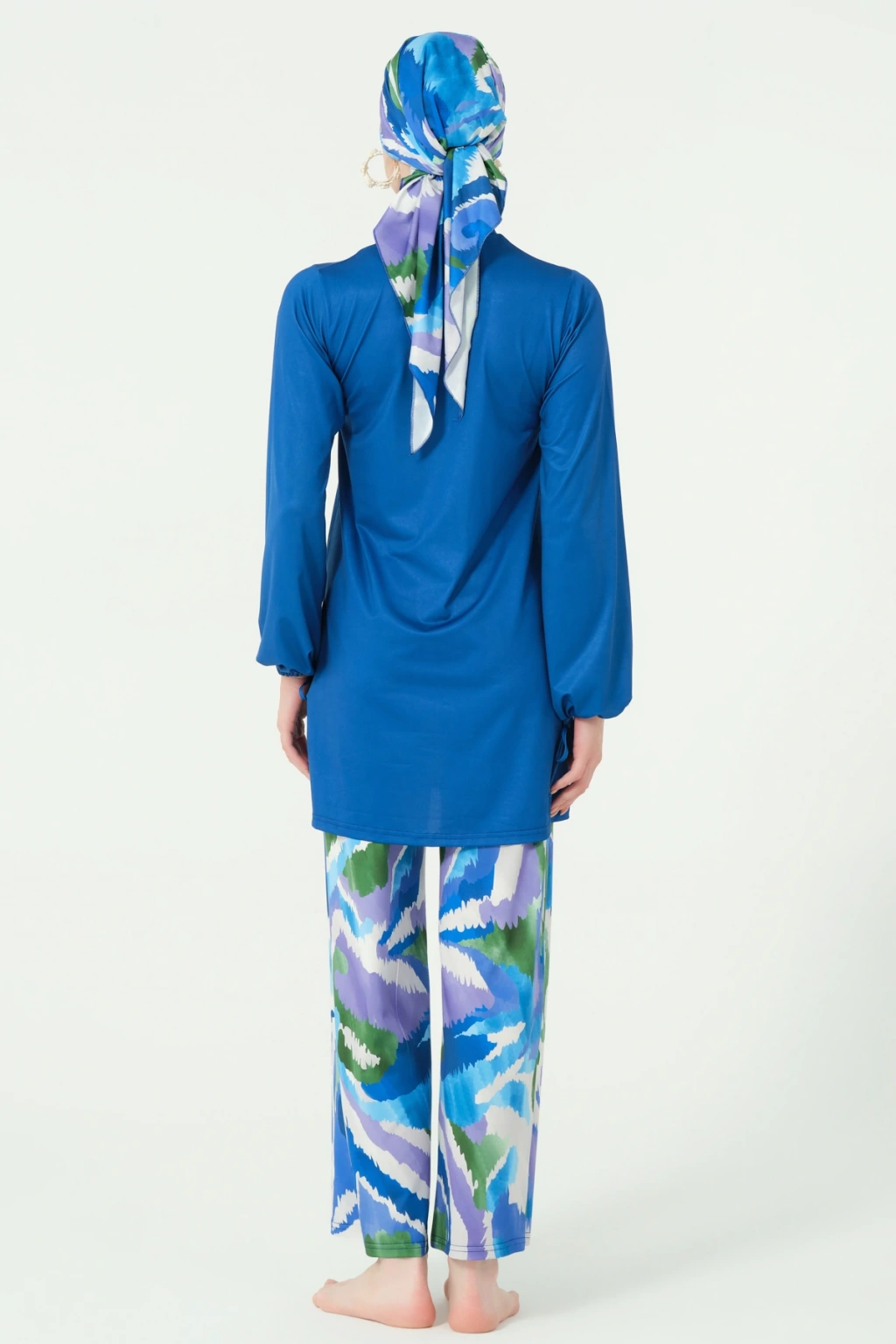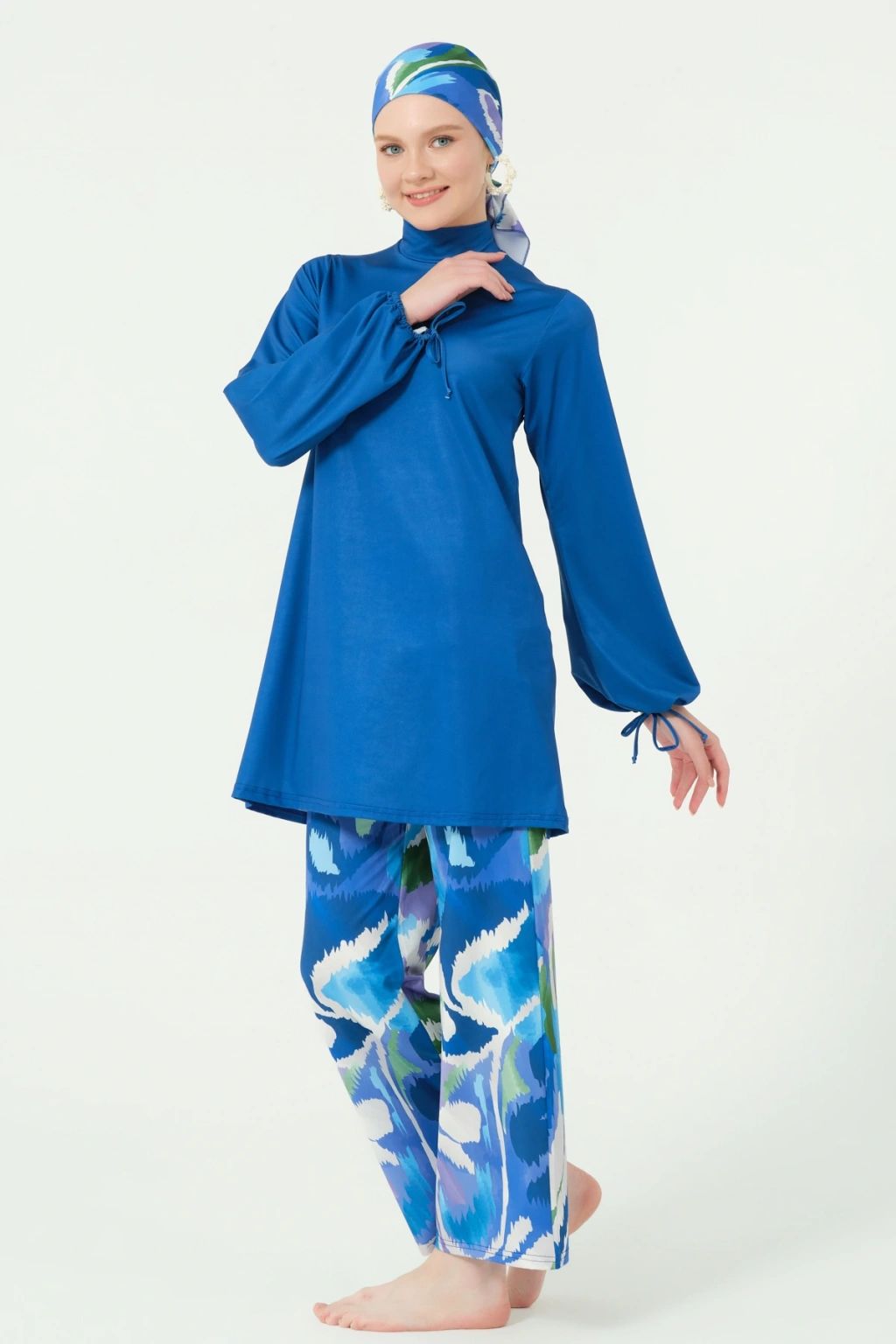 TR: Su itici: Suyu iten apreli likra kumaş. Üst klasik bol kalıp. Uzun kollu. Kol ucu büzmeli. Dik yaka. Bol paça desenli pantolon. Paçası sıkma kordonlu. Tek parça iç çamaşır. Desenli üçgen eşarp ve bone.