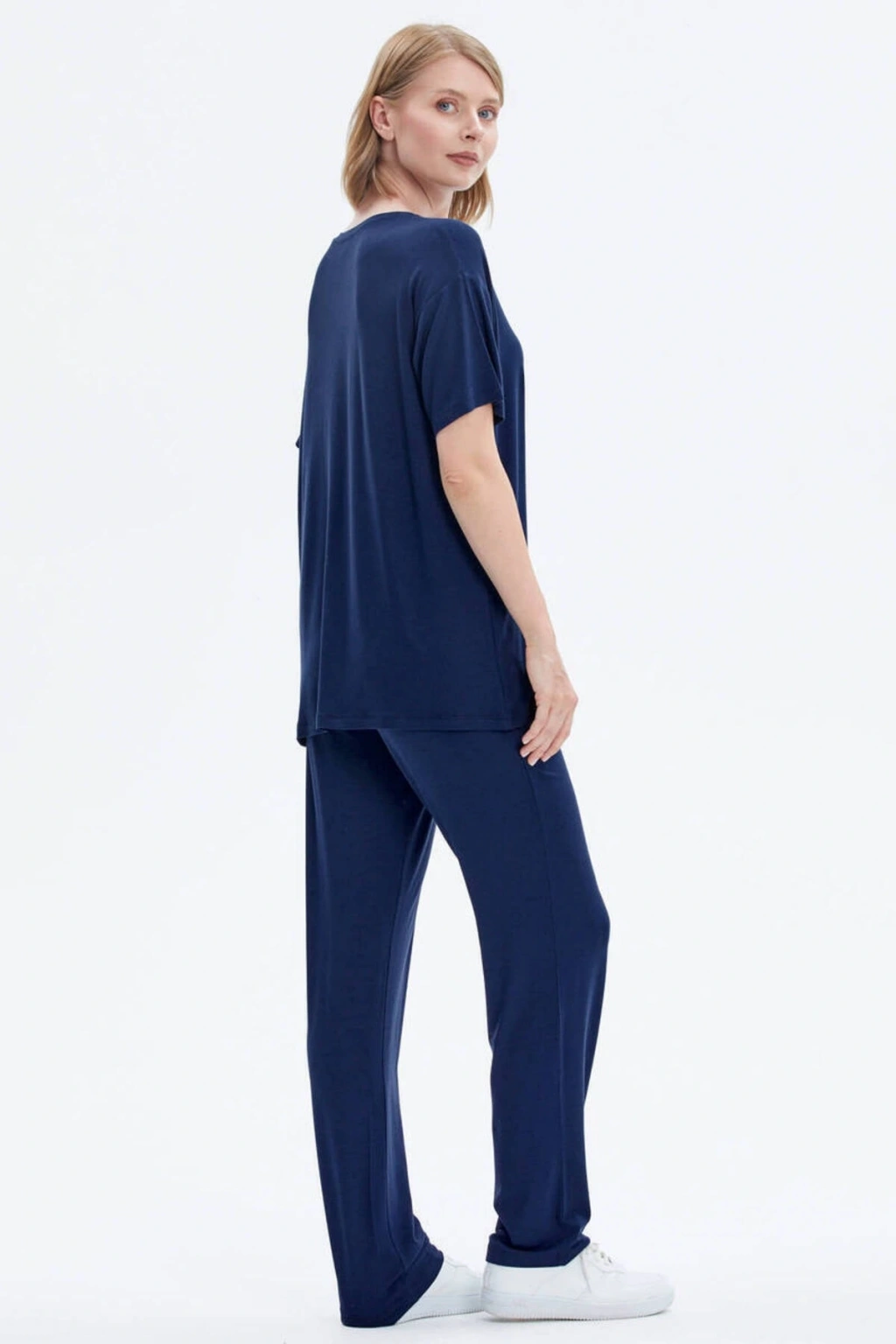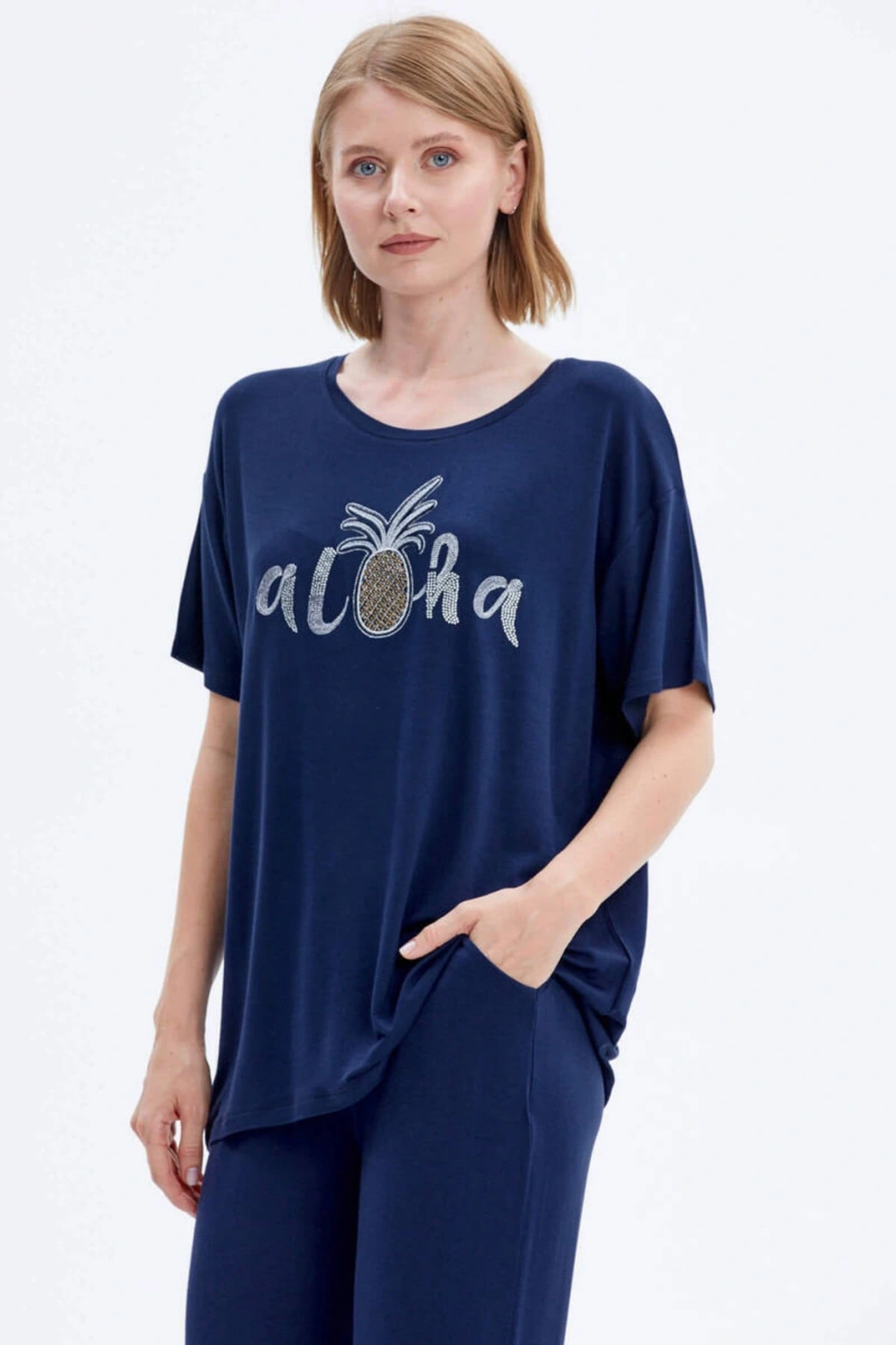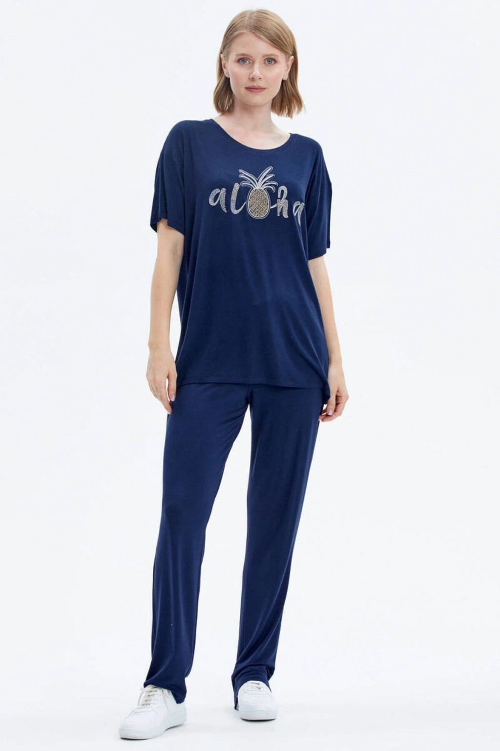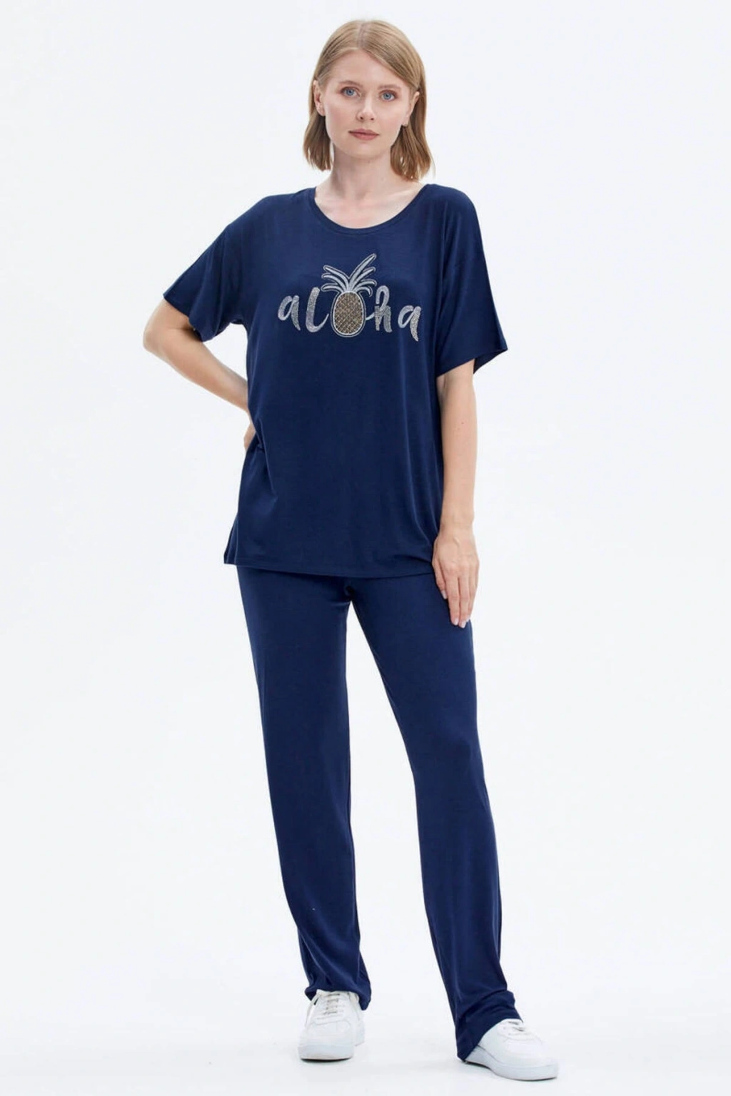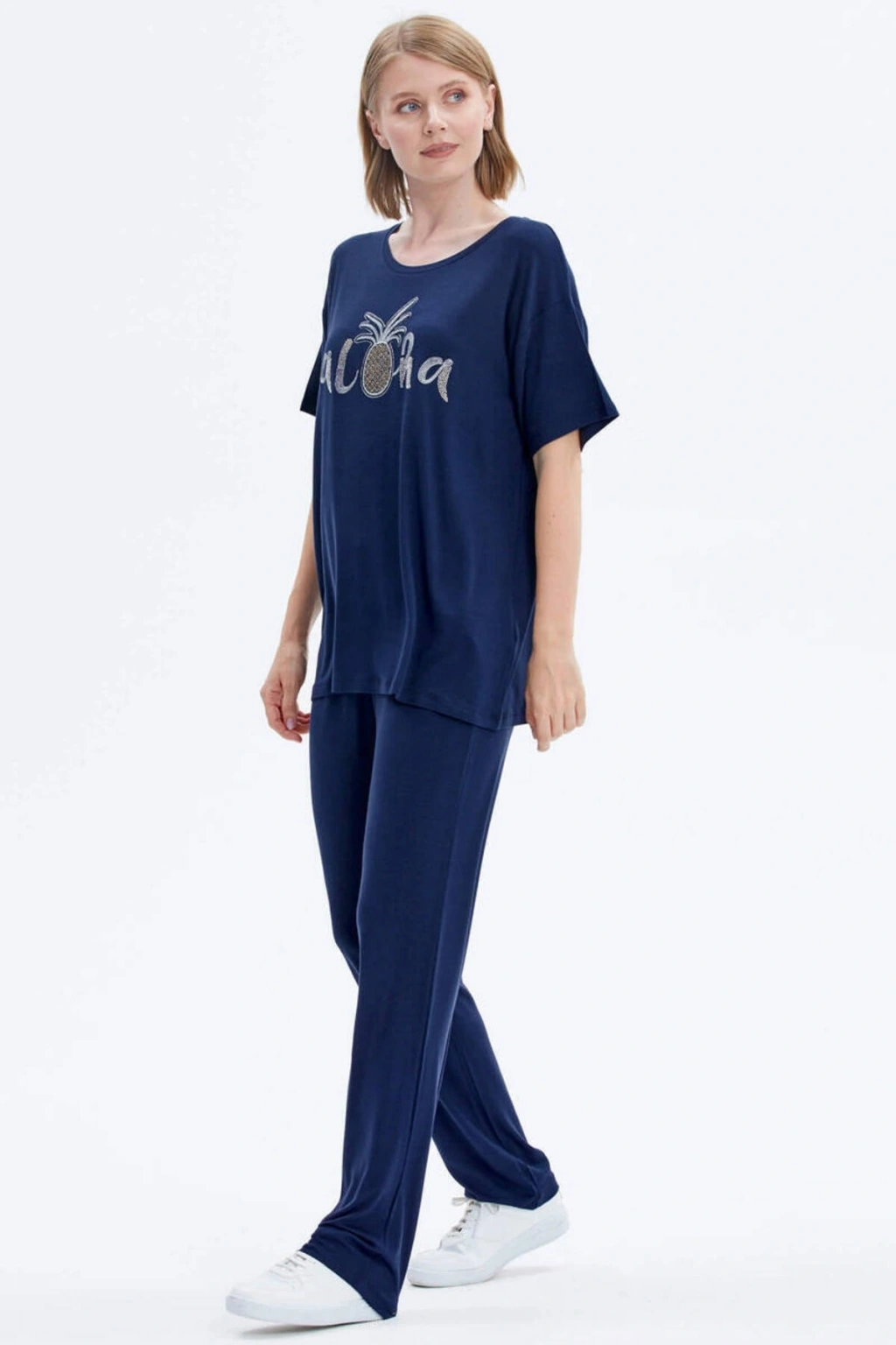 Sıfır yaka, kısa kollu, nakış detaylı tshirt ve boru paça, cep detaylı alttan oluşan penye takım; ÜST Kumaş İçeriği: %95 Viskoz %5 Elastan Desen: Düz Yaka Tipi: Sıfır Yaka Kol Tipi: Kısa Kol Ürün Boyu: 70 cm Kalıp Tipi: Standart Kalıp ALT Kumaş İçeriği: %95 Viskoz %5 Elastan Desen: Düz Paça Tipi: Boru Paça Bel Tipi: Lastikli Cep: İki Adet Yan Cep Ürün Boyu: 103 cm Kalıp Tipi: Standart Kalıp Mankenin Giydiği Beden: S Manken Ölçüleri: Boy: 175 cm Göğüs: 87 cm Bel: 63 cm Basen: 90 cm;