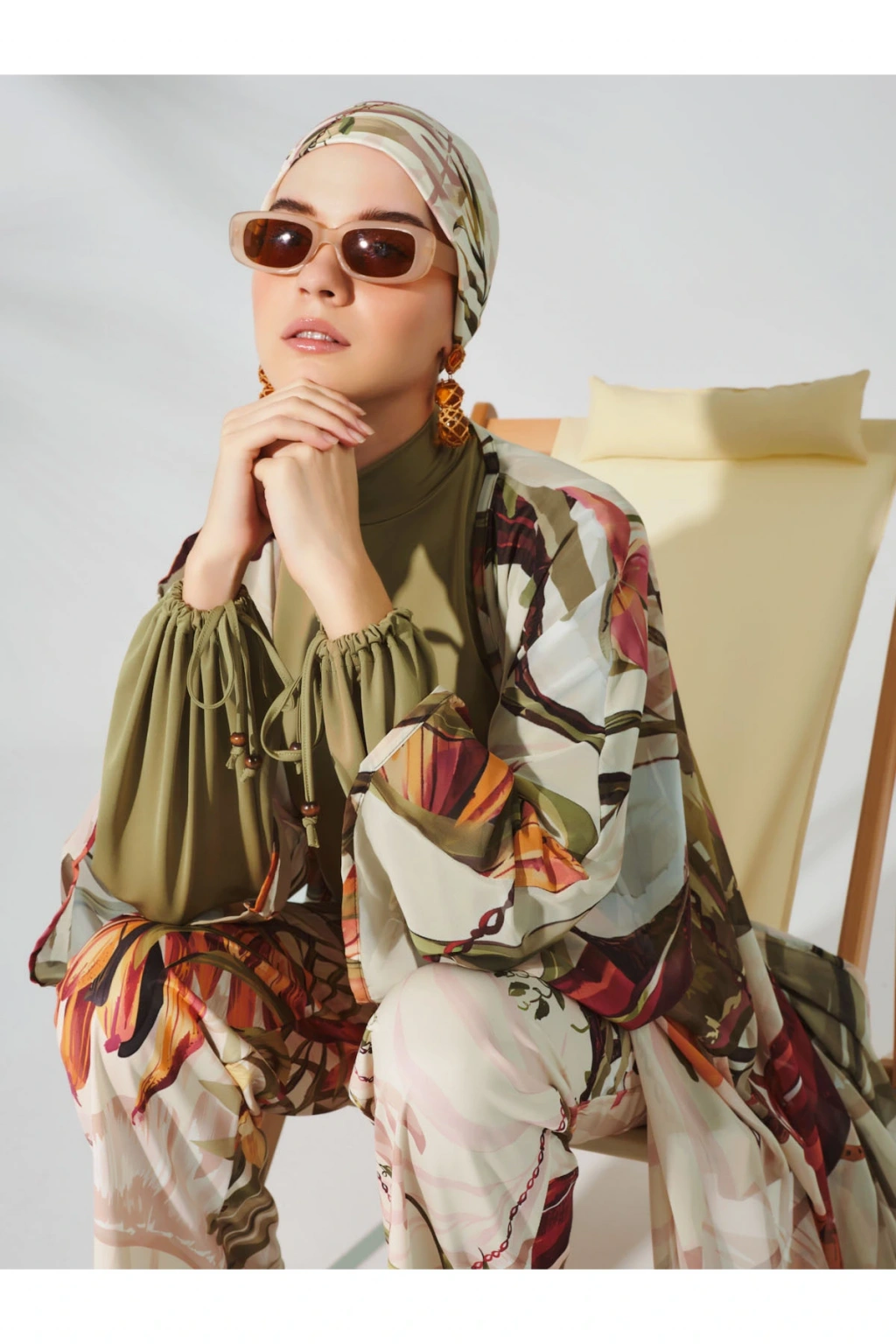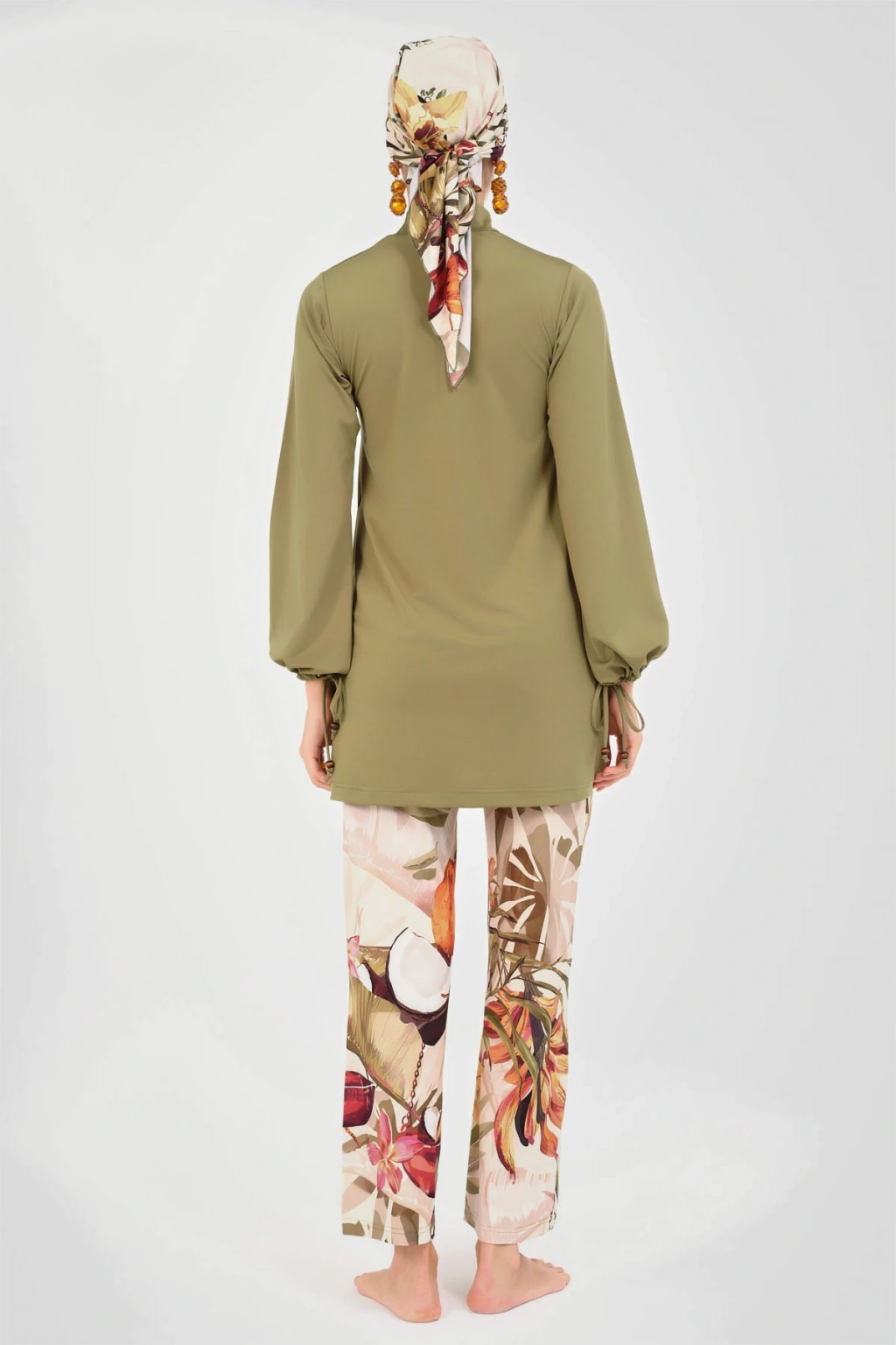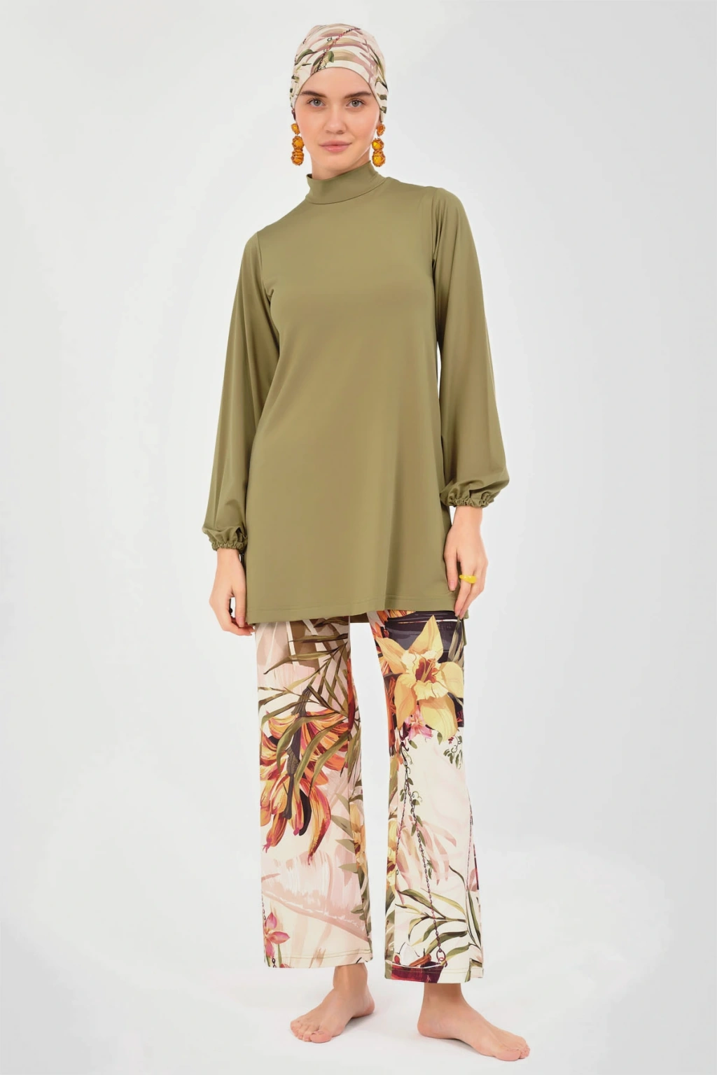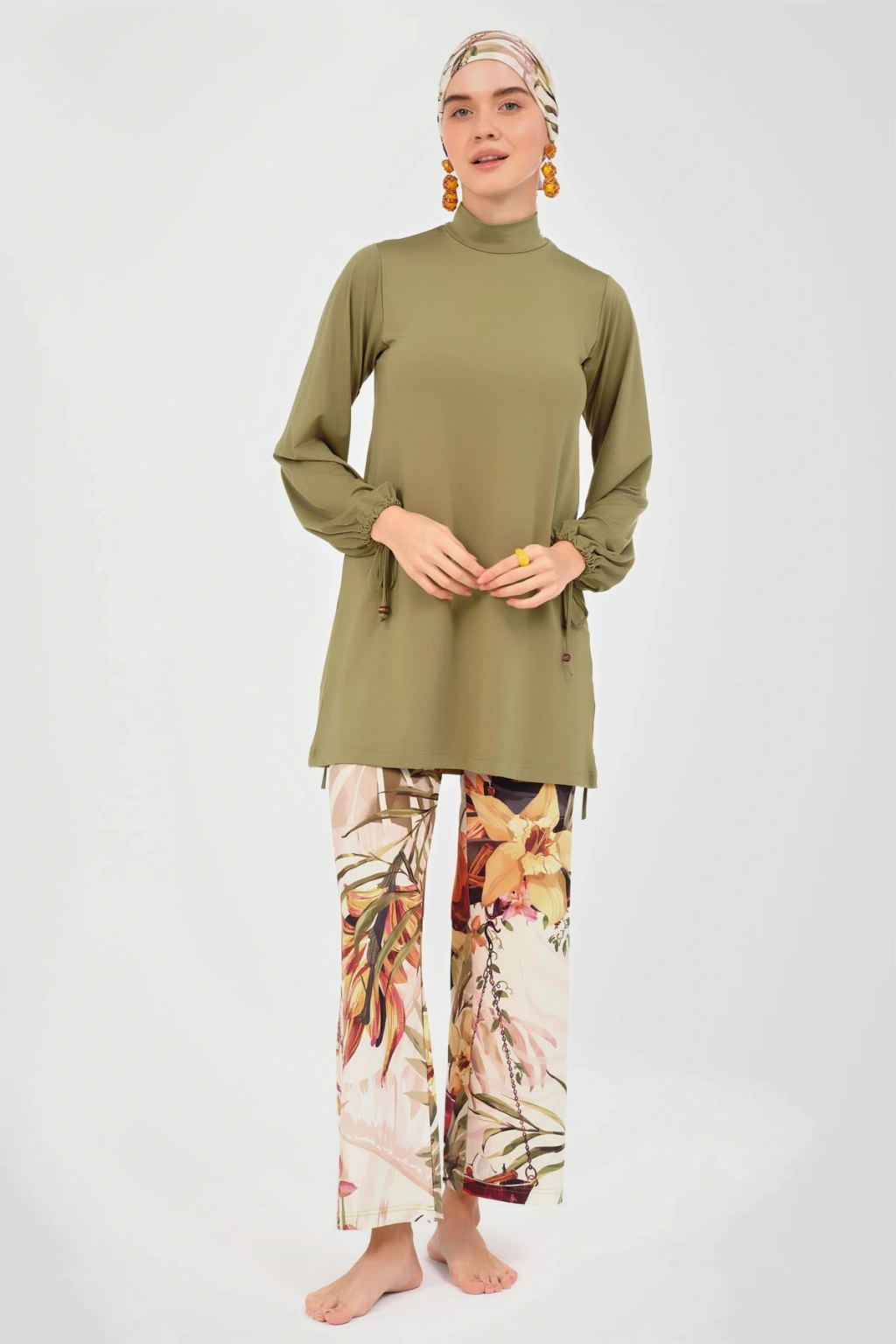 Natural Desenli Tesettür Mayo Zeytin yeşili rengi ve natural desenleri ile dikkat çeken bu tesettür mayo, bol pantolonu sayesinde rahat hareket etme olanağı sunar. ; Modaya uygun ve konforlu tasarımıyla, kapalı kadınlar için ideal bir seçenektir. ; Havuz ve deniz için uygundur. ; Tanım Su itici . ; Suyu iten apreli likra kumaş. ; Üst klasik bol kalıp. ; Uzun kollu. ; Dik yaka. ; Bol paça desenli pantolon. ; Tek parça iç çamaşır. ; Desenli üçgen eşarp ve bone. ; Paket İçeriği Üst, Pantolon, Üçgen bone, Bone, Tek parça iç çamaşırı olmak üzere 5 parçadan oluşmaktadır. ; Hızlı kuruma, kolay yüzme olanağı sağlar. ; Kumaş İçeriği %95 Poliester, %5 Elastan, Su itici apre uygulanmıştır.;