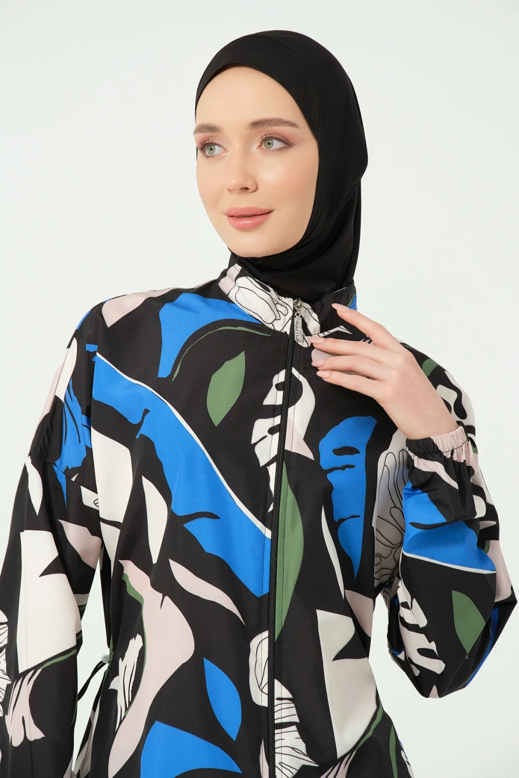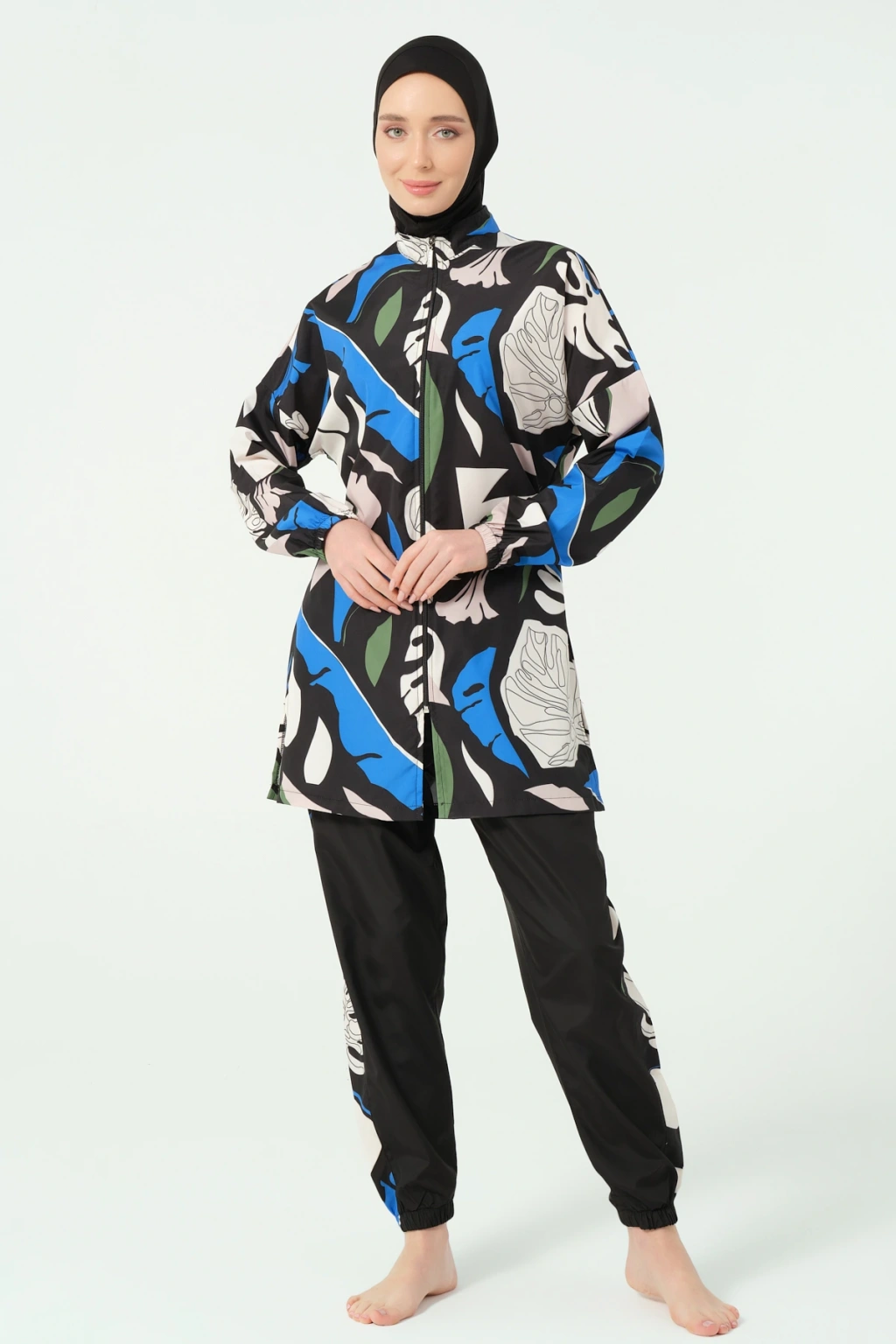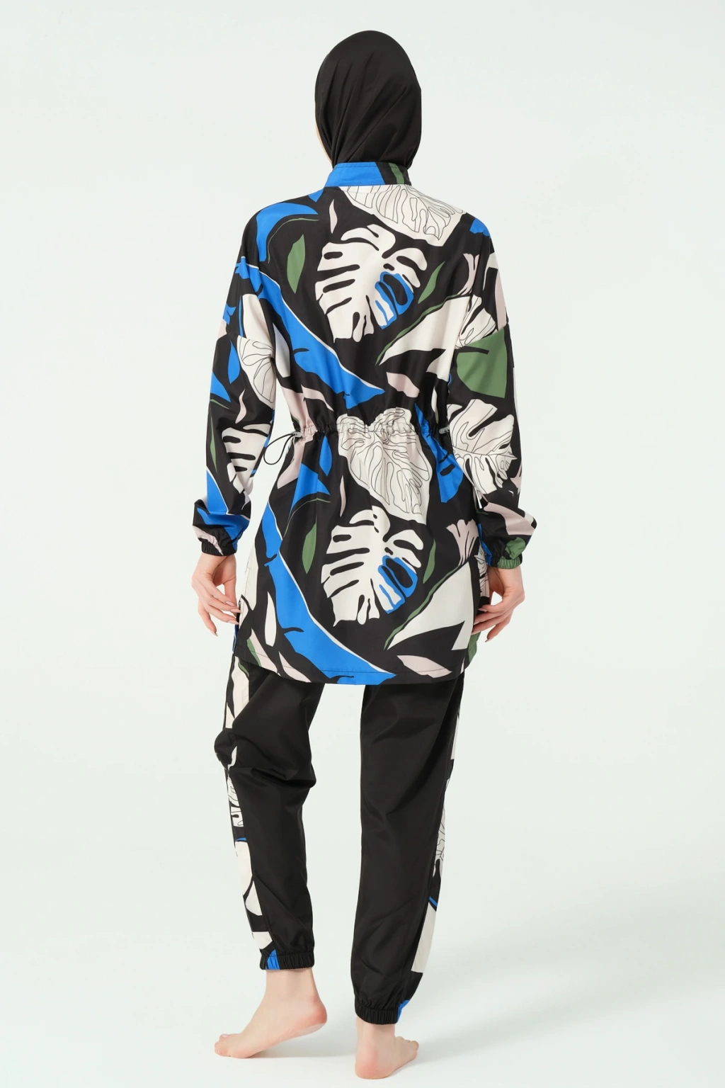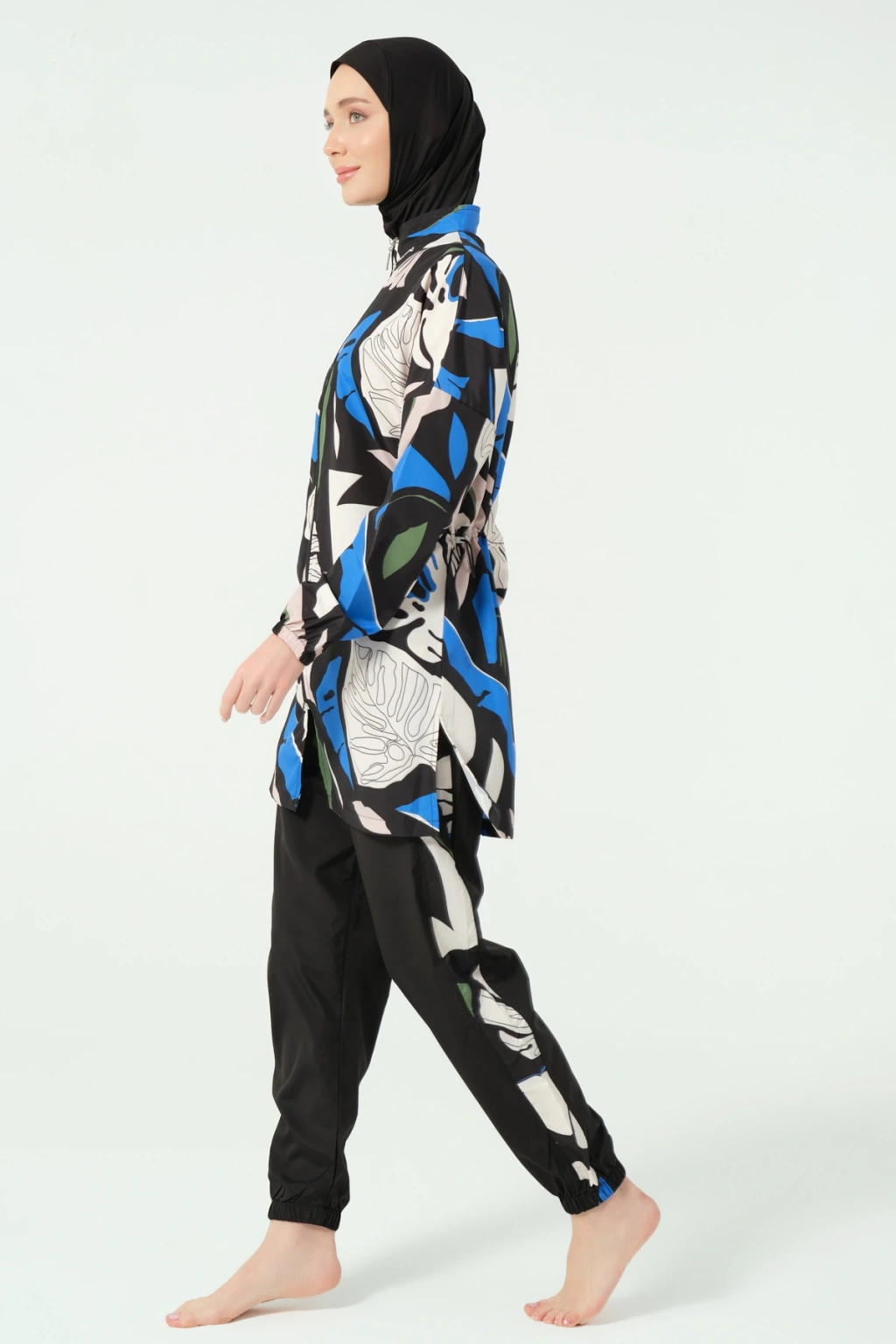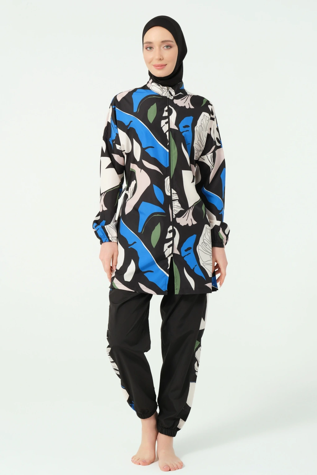 TR: Üst, Pantolon, Eşarp, Bone, Tek parça iç çamaşırı olmak üzere 5 parçadan oluşmaktadır. Hızlı kuruma, kolay yüzme olanağı sağlar.