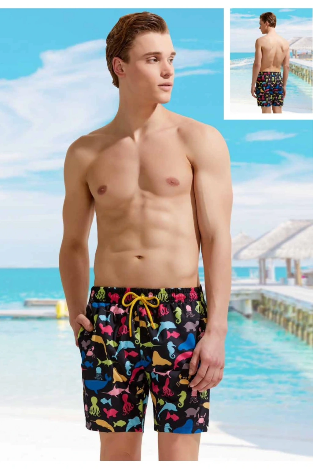 Canlı ve renkli denizaltı desenleriyle dikkat çeken bu şort mayo, plaj modasına dinamik bir dokunuş katıyor; Esnek lastik bel tasarımı sayesinde rahat bir kullanım sunar ve vücut hatlarınıza mükemmel uyum sağlar; Her yaş grubuna hitap eden tasarımıyla geniş bir kullanıcı yelpazesine sahiptir; gençlerden yetişkinlere herkes için idealdir; Dayanıklı kumaş yapısı, uzun süreli kullanım için idealdir ve sık yıkamalara karşı dirençlidir; Type 1 yıkama talimatına uygun şekilde kolayca temizlenebilir; böylece mayonuz her zaman yeni gibi kalır; Şık alt silueti ile hem konforlu hem de stil sahibi bir görünüm sağlar; plajda veya havuz kenarında şıklığınızla fark yaratın;