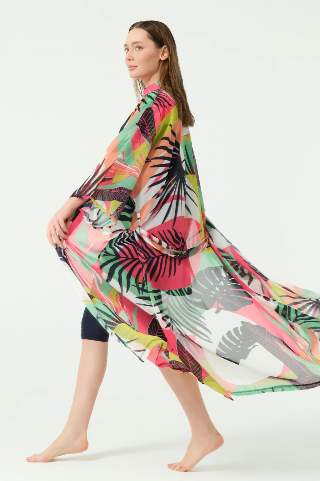 TR: Desenli şifon kumaş. Kemer detaylı tasarım.