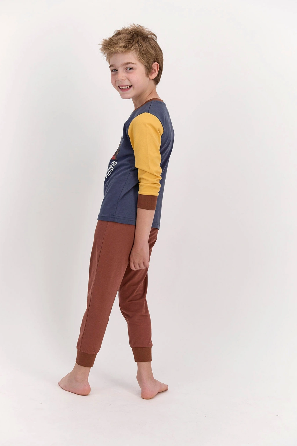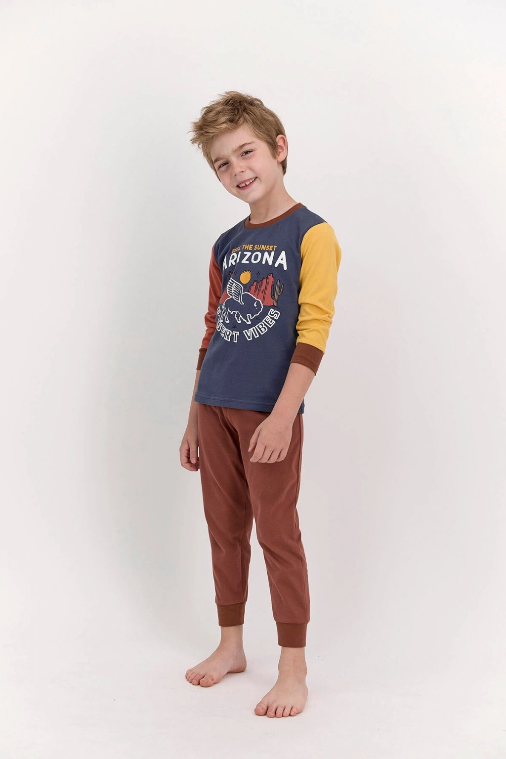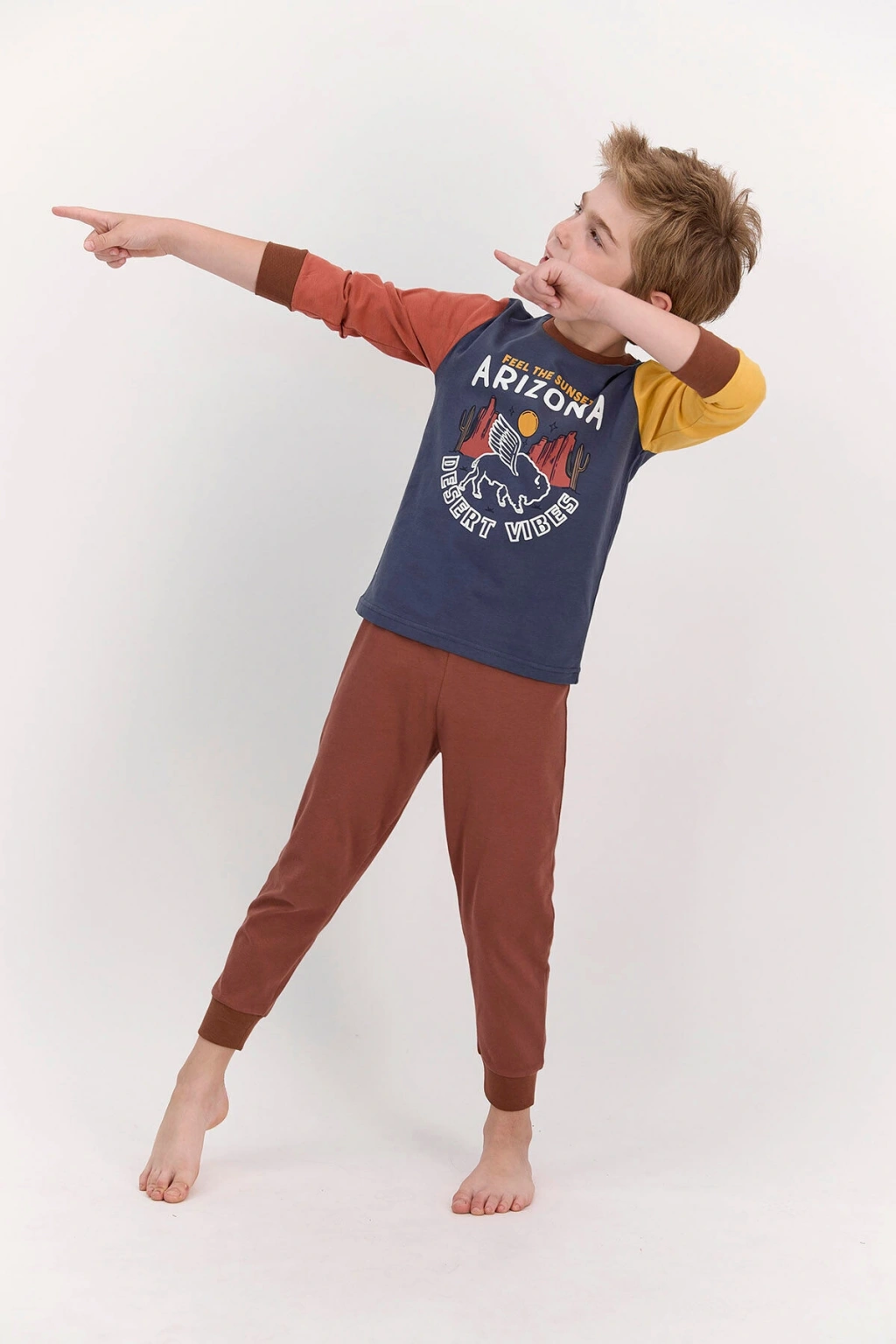 RolyPoly Arizona Koyu İndigo Erkek Çocuk Pijama Takımı, koyu indigo, sarı ve kiremit renklerinin birbirleri arasında kurdukları özgün ilişki üzerine geliştirilmiş son derece özel bir tasarıma sahiptir. ; İki parçadan oluşan takımın genel konsepti, hareketli ve canlı görünüme sahip olmak isteyen çocukları tatmin edebilecek öğeleri içermektedir. ; Koyu renk indigonun zemin rengi olarak kullanıldığı takım indigo renk ile modern bir görünüm elde etmiştir. ; Ayrıca takımın genel konseptini oluşturan büyük beyaz puntolu “Arizona” yazısı ve manzarasıyla da indigo renk, önemli düzeyde bir uyumluluk göstermiştir. ; Üst parçanın kol bölgesinde kiremit ve sarı renklerine yer verilerek üst bölge tasarımının hareket kazanması sağlanmıştır. ; RolyPoly Arizona Koyu İndigo Erkek Çocuk Pijama Takımı alt parçasında ise son derece sade ve minimal bir tasarım benimsenmiştir. ; Stok Kodu : RP2521-C-V2 Marka : Rolypoly Renk : 21k Koyu İndigo Kumaş İçerik : Üst Kumaş : %100 Pamuk, Alt Kumaş : %100 Pamuk Kumaş Tipi : Üst Kumaş : Süprem, Alt Kumaş : Süprem FİYATLAR SEÇİLEN BEDENLERE GÖRE FARKLILIK GÖSTEREBİLİR. ; ConnectProf © tarafından yayınlanmıştır.;