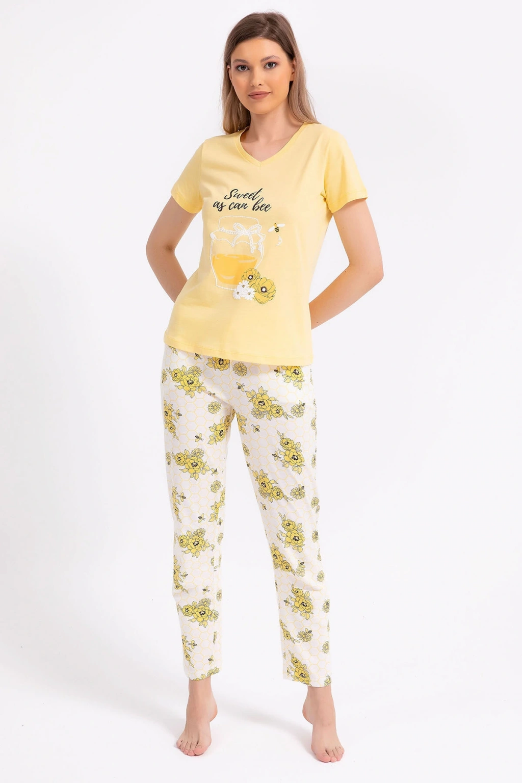 25109 Kadın V Yaka Kısa Kollu Bol Paçalı Pijama Takım