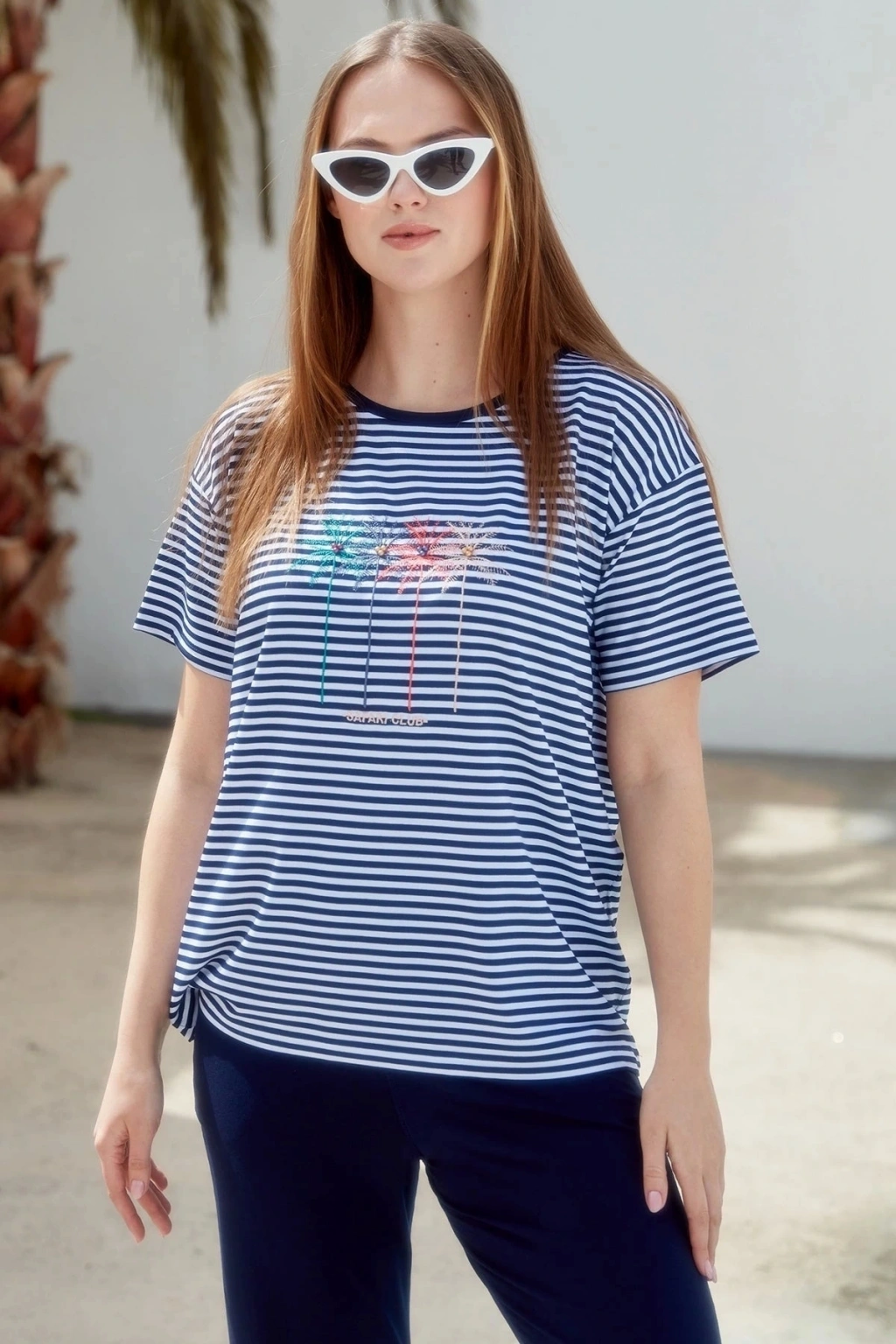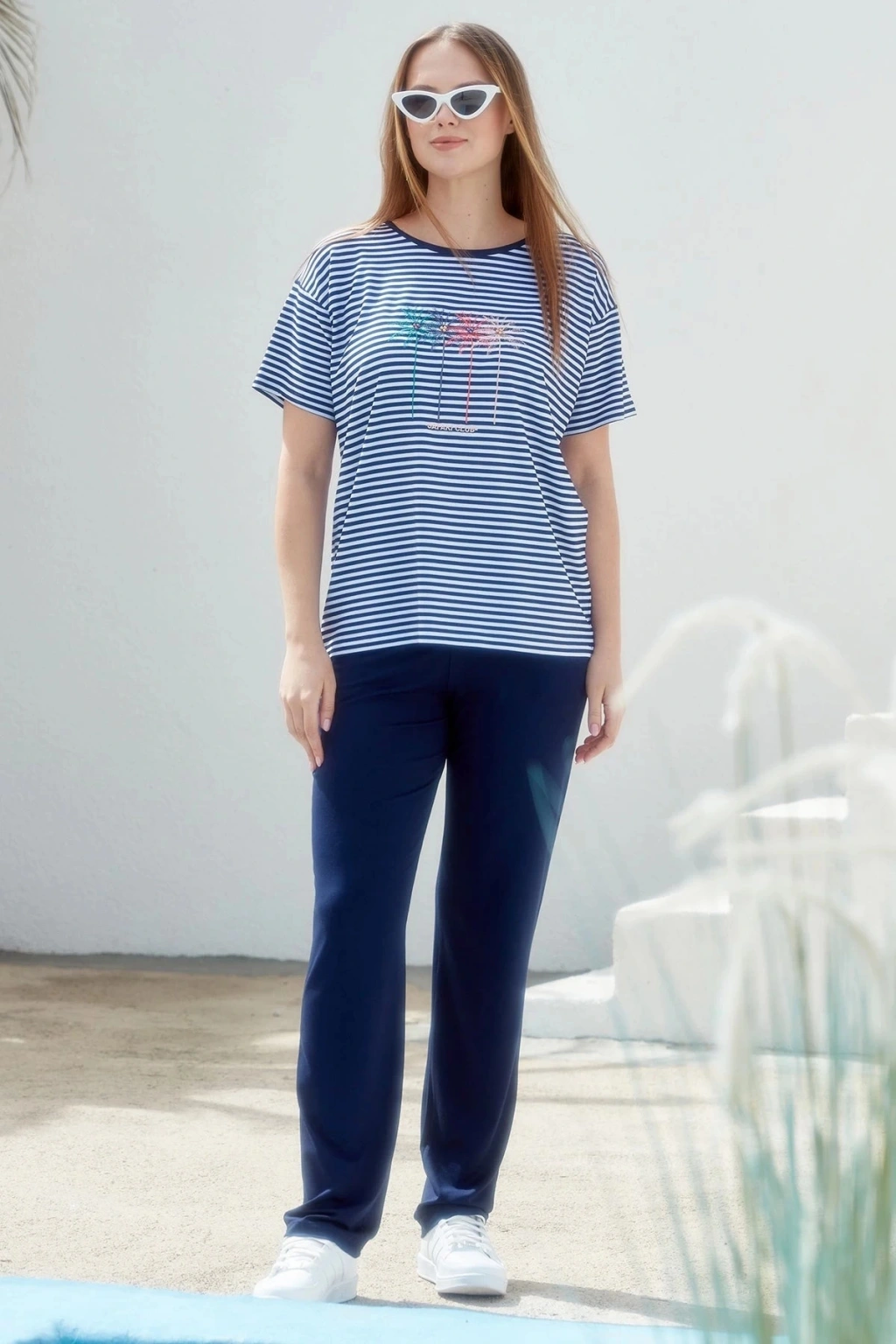 Sıfır Yaka Nakış Detaylı Çizgili Penye Takım - Lacivert