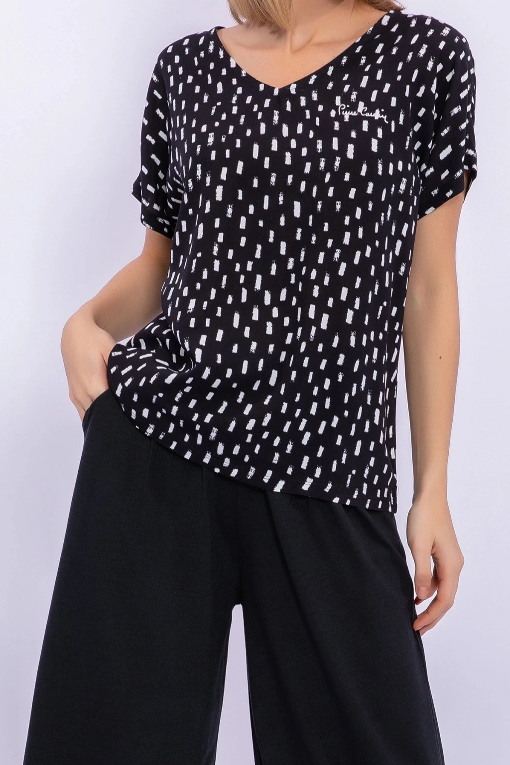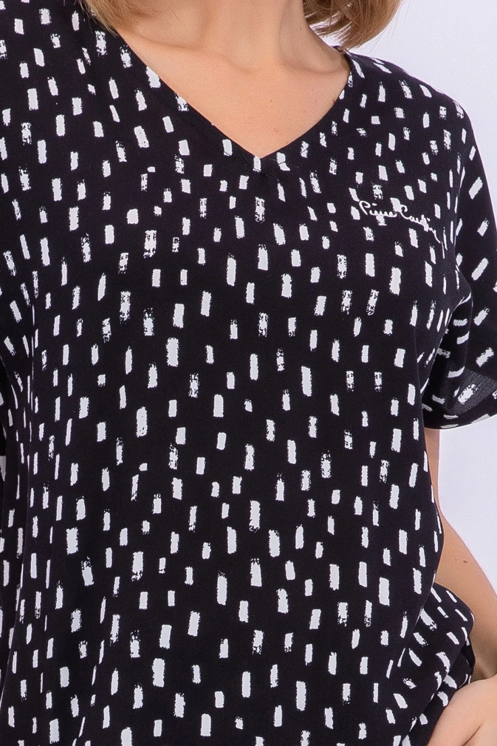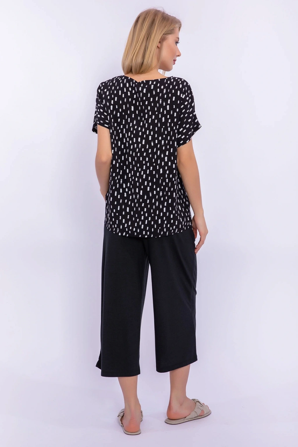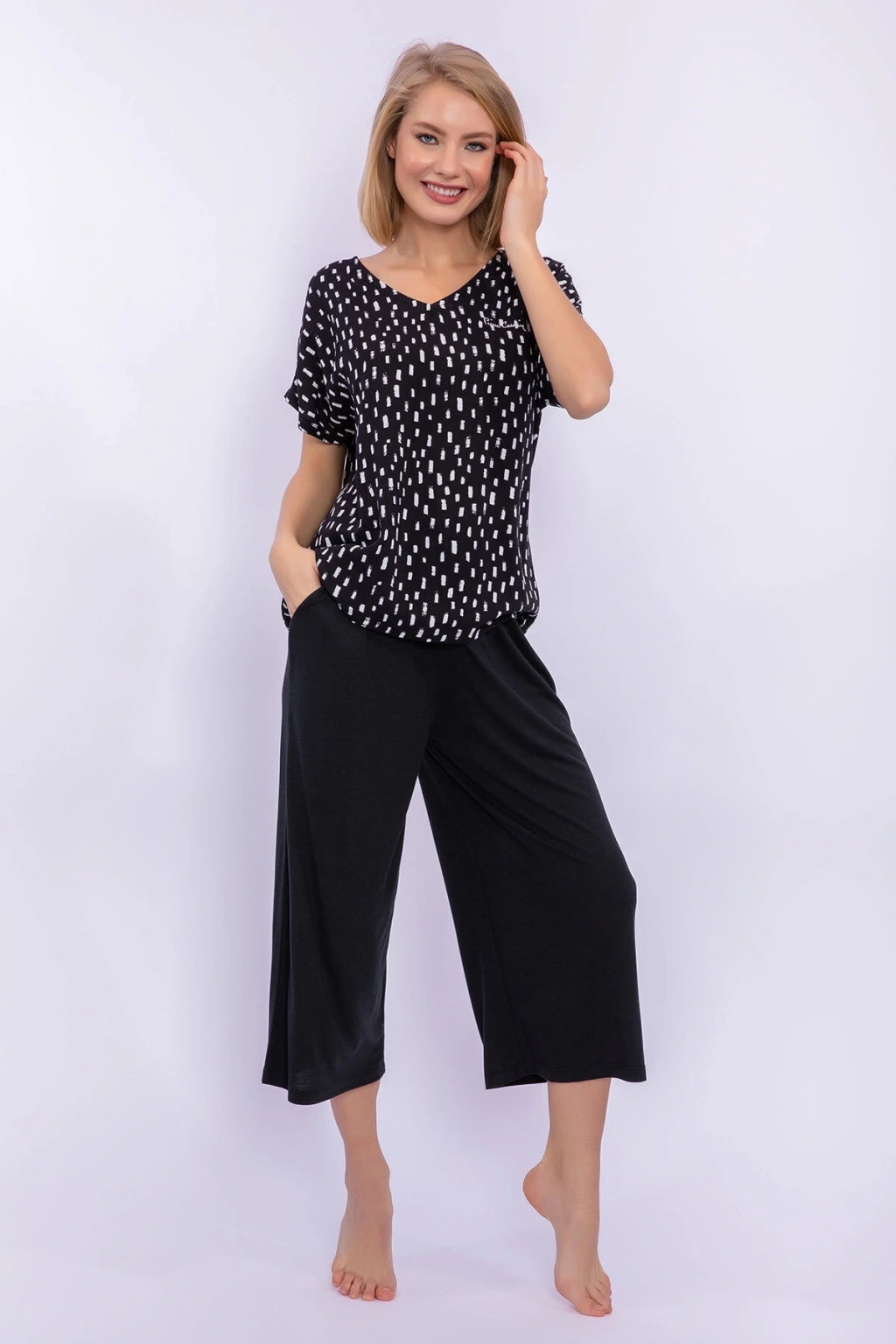 Ev giyim konforunu senin rahatlığın için sunuyoruz. ; Günün her anında üzerinde taşıyabileceğin siyah poplin kapri takımımız ile ‘evde ne giyeceğim’ sıkıntısı sona eriyor. ; %100 viskon takımımızı uyandıktan hemen sonra giyebilir ve tüm ev işlerini rahat kesimi ile seni sıkmadan yapabilirsin. ; Siyah üzerine beyaz kalın çizgiler yerleştirdiğimiz tişörtümüzü seni serin tutması için kısa kollu olarak tasarladık. ; Alt parça kapri ise hareket kabiliyetini kısıtlamaması adına bol yapıldı. ; Geniş v yakası ile boynunu sıkmaz ve seni terletmez. ; Üst parçanın ön ve arka kısmı beyaz kalın çizgilerle hareketli olduğu için kapriyi düz renk tercih ettik. ; Takımızın altına siyah ya da beyaz tüylü terlikler ya da pofuduk ev ayakkabıları giymeyi tercih edebilirsin. ; Eğer üşürsen ise siyah ya da beyaz bir hırka ile kombini tamamlayabilirsin. ; Günün her anında ev içinde keyifle giyeceğinden eminiz. ; Ister uyandıktan sonra ev içindeki yapman gereken işlerini yaparken istersen de bir yorgunluk kahvesi içerken siyah poplin kapri takımımız hep senin yanında olacak. ; Ürün kodu:Pc8244-S-V1 Kumaş detay:Üst : %100 viskon (poplin)alt : %50 viskon %50 polyester (süprem) Sezon :Ilkbahar-Yaz Marka:Pierre cardin Renk:Sıyah Cinsiyet:Kadın;