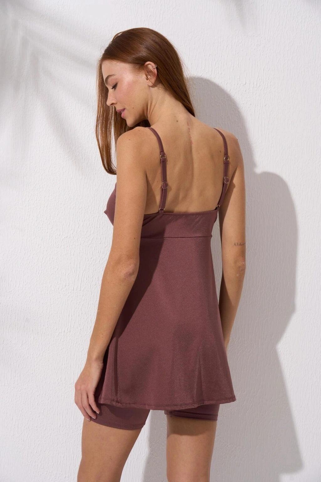 - İç giyim koleksiyonunuzda şıklığı ve rahatlığı bir arada sunan şortlu v yaka tankini, plaj günlerinizde ve özel anlarınızda konforunuzu ön planda tutar; - Düz deseniyle sade ve zamansız bir görünüm sağlayarak, plaj modasına uygun bir stil oluşturmanızı kolaylaştırır; - Dokuma kumaş yapısı sayesinde dayanıklılığı ve nefes alabilirliği ile öne çıkar; uzun süreli kullanımlarda bile formunu korur;