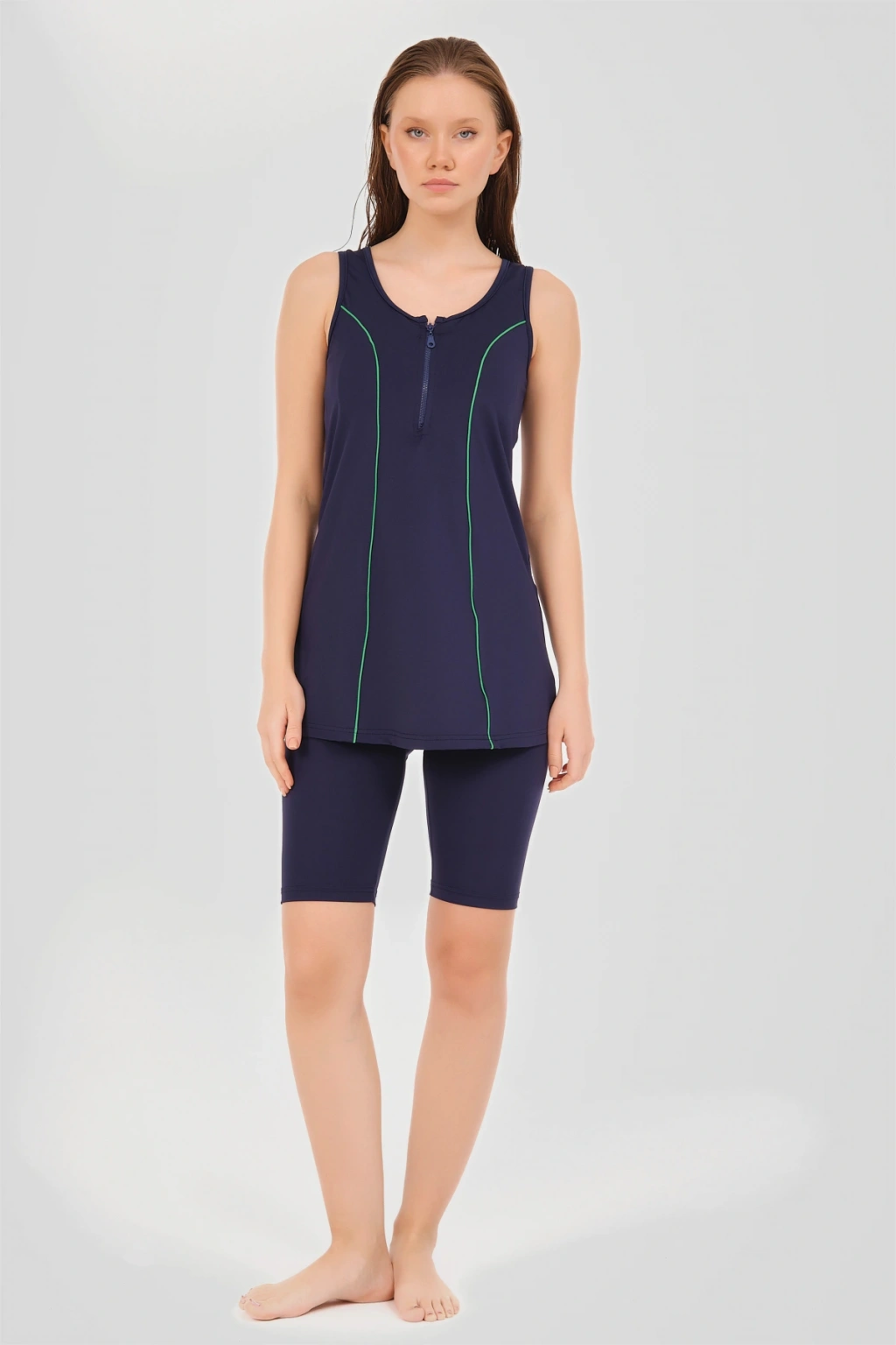 Spor Biye Detaylı Askılı Yarı Kapalı Mayo Zarif ve konforlu bu yarı kapalı mayo, suyun içinde mükemmel uyum ve hareket özgürlüğü sunan esnek likralı kumaş ile tasarlanmıştır. ; Canlı renkler ile her yaş ve bedene uygun bir görünüm sağlar. ; Tanım Su itici . ; Suyu iten apreli likra kumaş. ; Üst biye süslemeli. ; Askılı. ; Yuvarlak yaka. ; Bone. ; Kısa tayt. ; Tek parça iç çamaşır. ; Paket İçeriği Üst, Tayt, Bone, Tek parça iç çamaşırı olmak üzere 4 parçadan oluşmaktadır. ; Hızlı kuruma, kolay yüzme olanağı sağlar. ; Kumaş İçeriği %95 Poliester, %5 Elastan, Su itici apre uygulanmıştır.;