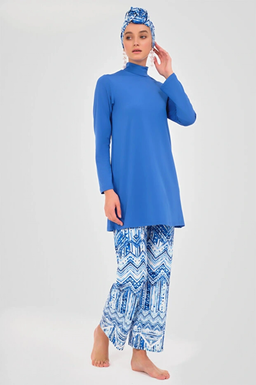 Mavi renginin asil ve dingin tonu, modern drapaj detayıyla buluşuyor. Bu yüzücü elbisesi, plaj ve havuz stilinizde sofistike bir duruş sergilerken, size üst düzey kapanma konforu ve hareket özgürlüğü sunar.