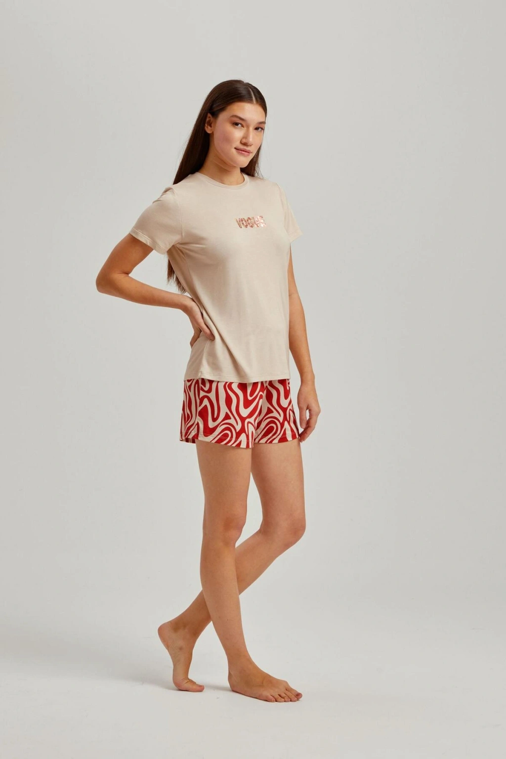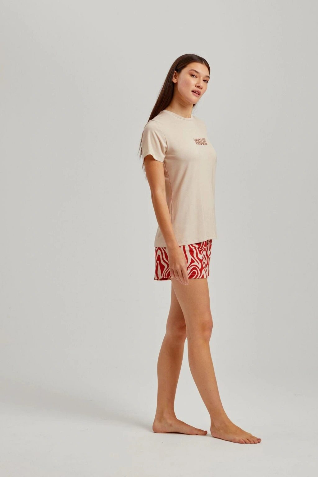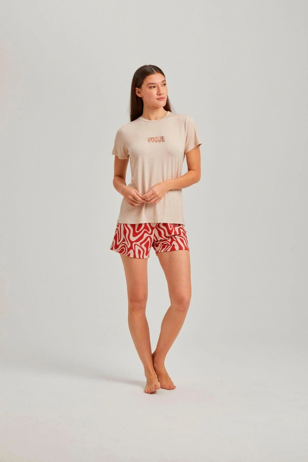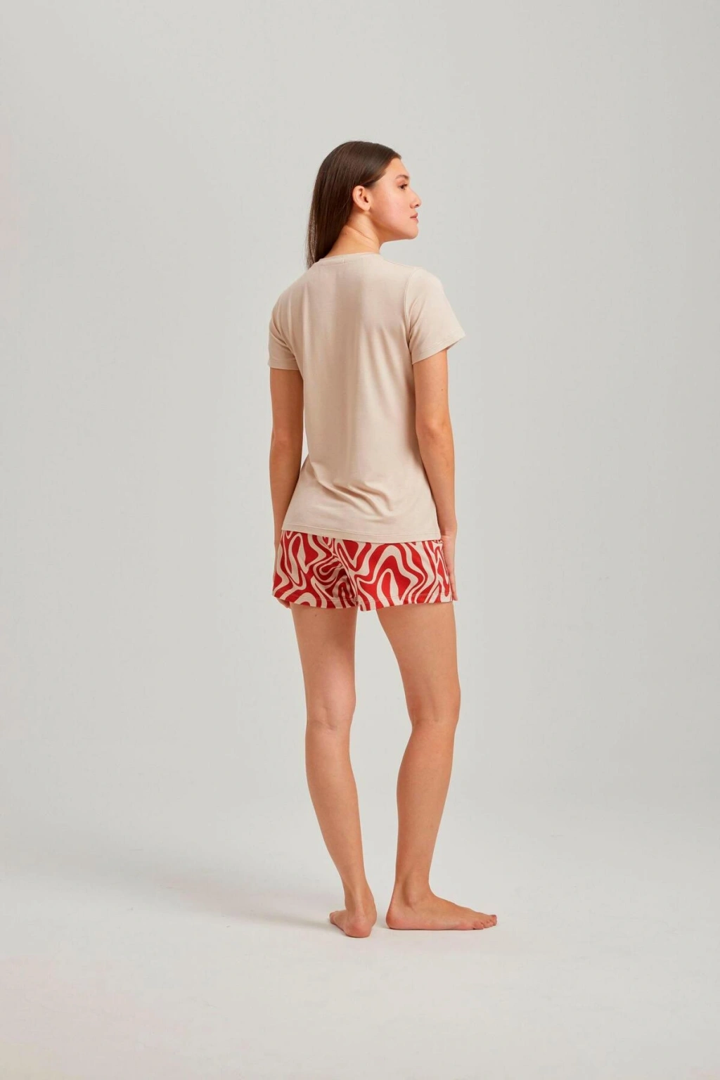 Bisiklet yakası ile modern ve rahat bir görünüm sunar.; Dalga desenleri ve taş rengiyle şık ve dinamik bir stil oluşturur.; Kısa kolları sayesinde yaz aylarında serinlik ve konfor sağlar.; İki parçadan oluşan set, hem şort hem de üst olarak kullanılabilir.; Örme viskon kumaşı, yumuşak dokusuyla gün boyu rahatlık sunar.; %95 viskoz ve %5 elastan içeriği ile esneklik ve dayanıklılık kazandırır.; Homewear koleksiyonunun parçası olarak ev giyiminde şıklığı ön planda tutar.; Tüm yaş gruplarına hitap eden tasarımıyla geniş kullanıcı kitlesine uygundur.; Regular kalıbı sayesinde vücut hatlarını saran ancak sıkmayan ideal uyumu sağlar.;