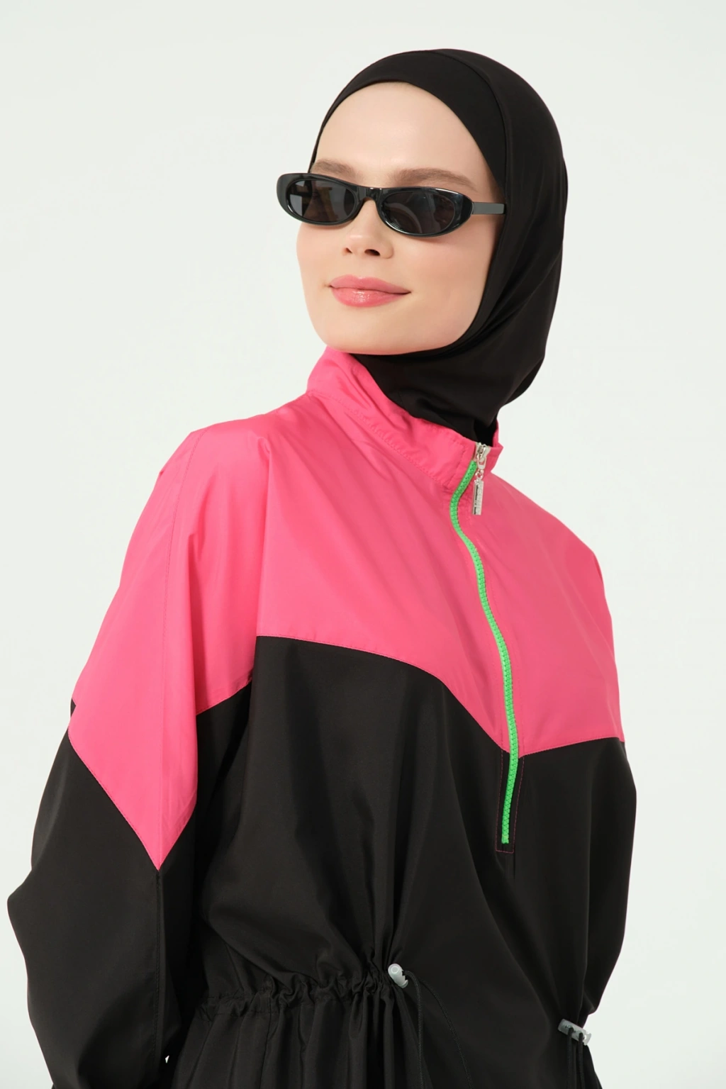 EN: Water-repellent: Lycra fabric with water-repellent . Two-tone loose-fit top. Half-bone zippered high collar. Pants with zippered pockets. Pleated cuffs. Lycra scarf and bonnet. One-piece bustier.