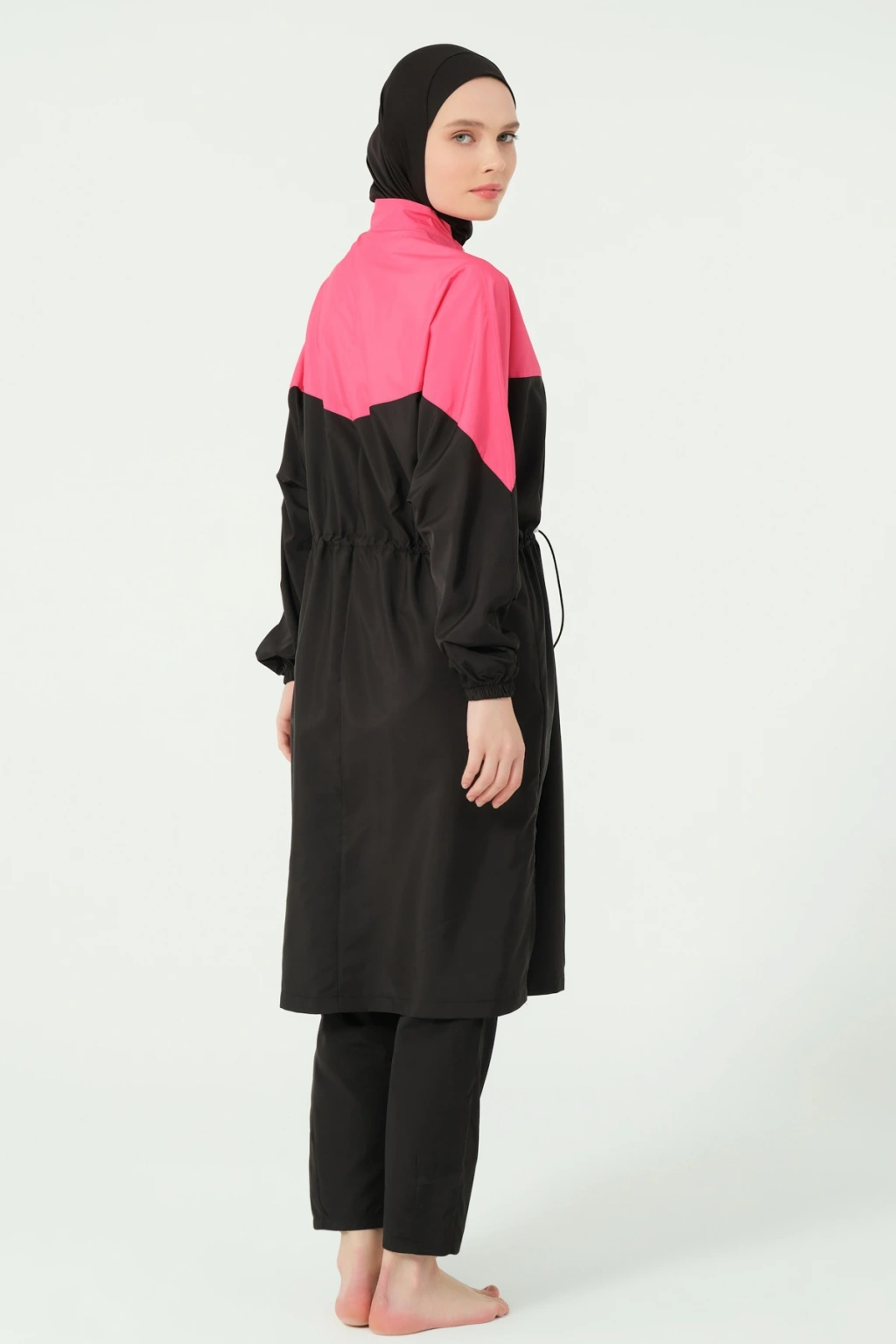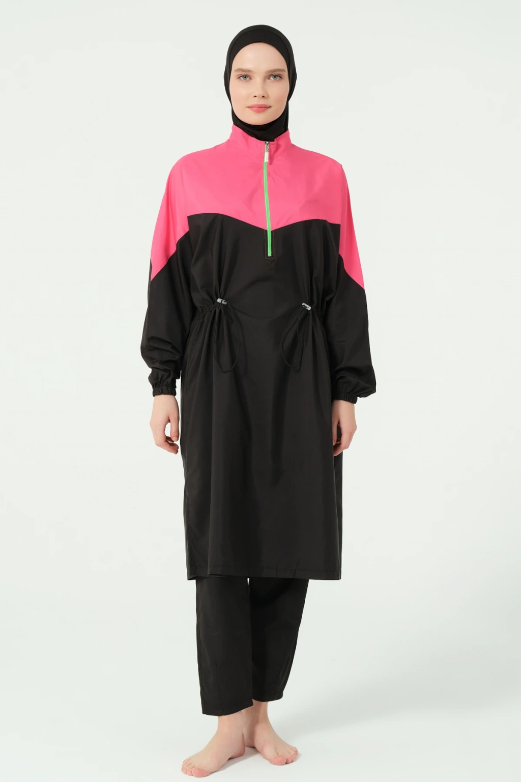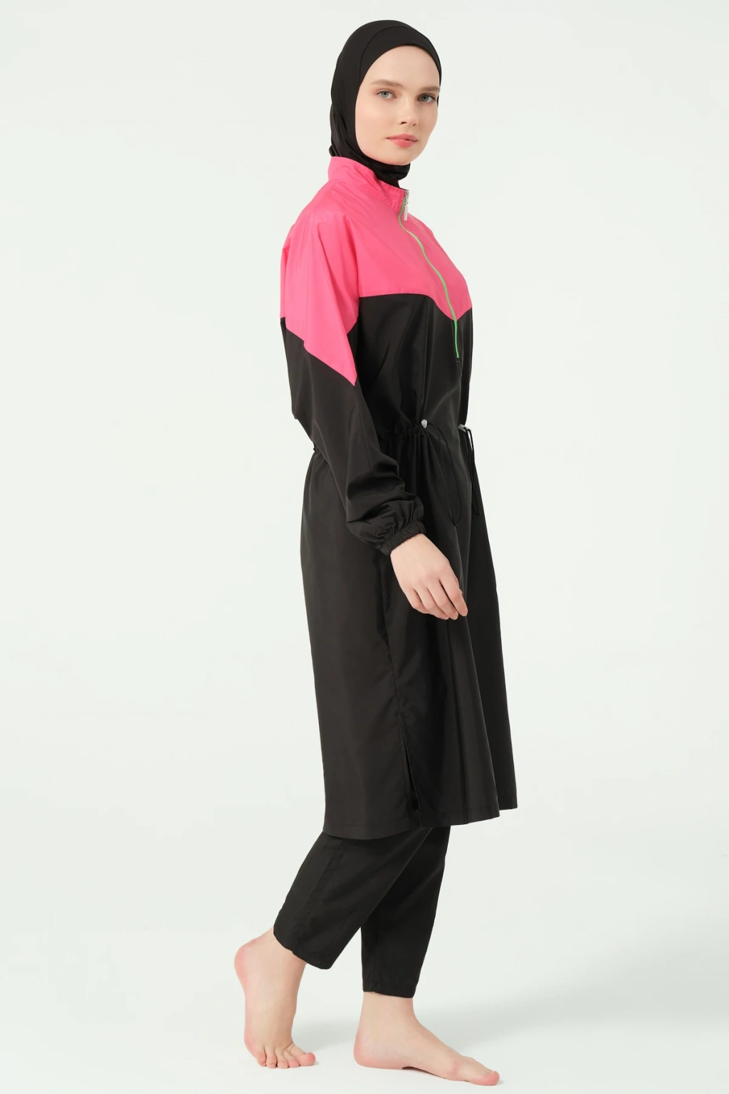 TR: Üst, Pantolon, Eşarp, Bone, Tek parça iç çamaşırı olmak üzere 5 parçadan oluşmaktadır. Hızlı kuruma, kolay yüzme olanağı sağlar.
