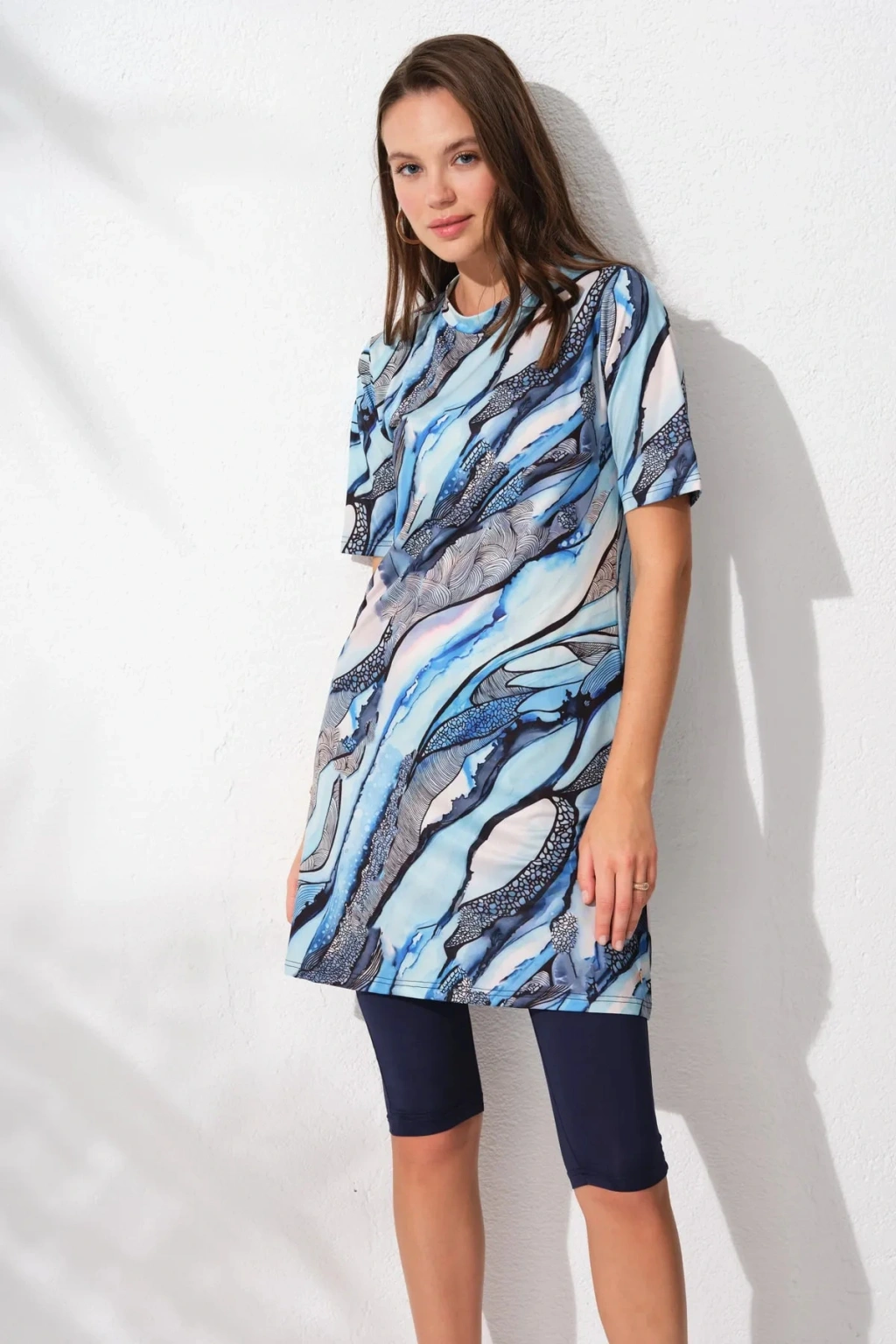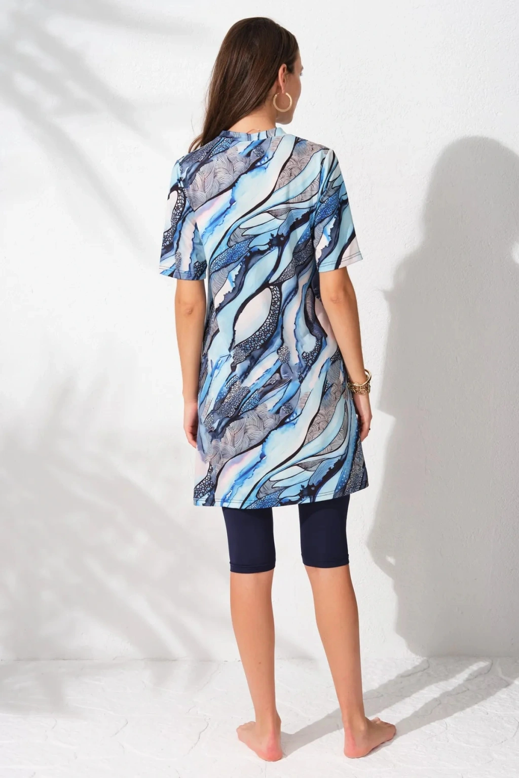 Pierre Cardin markamıza ait Tesettür grubumuz yılın trendlerini yansıtıyor! Tesettür mayo diz boyunda tayt, yarım kol tunik üst , sabit soft göğüs pedli iç büstier ve bone olmak üzere 4 parçadan oluşmaktadır. ; Tam kalıp üretilmiş olan mayoyu kendi bedeninizde alabilirsiniz.Ara bir bedene sahipseniz bir beden büyük tercih etmelisiniz. ; Tesettür mayonun tunik üstü popo hattını örter.Mavinin tonlarından oluşan desen okyanus dalgalarını anımsatıyor. ; Yarımkol tesettür mayomuzu aynı desendeki plaj çantasıyla ve pareosuyla kombinleyerek kullanabilirsiniz. ; Manken üzerindeki M-38 bedendir. ; Manken ölçüleri: Boy:174 Kilo:52 Göğüs: 80 Bel:60 Basen:90 Ürünü daha uzun süre kullanabilmek için soğuk su ve beyaz sabunla yıkamalı ve gölgede kurutmalısınız. ; Makinede yıkanmamalıdır,ütülenmemelidir. ; Kumaş:%85 Polyester %15 Elastane;