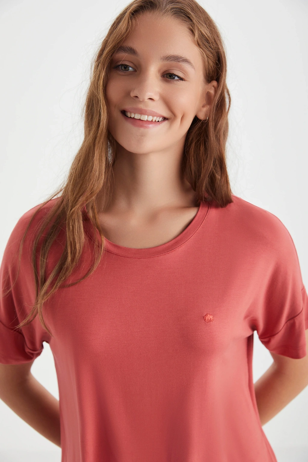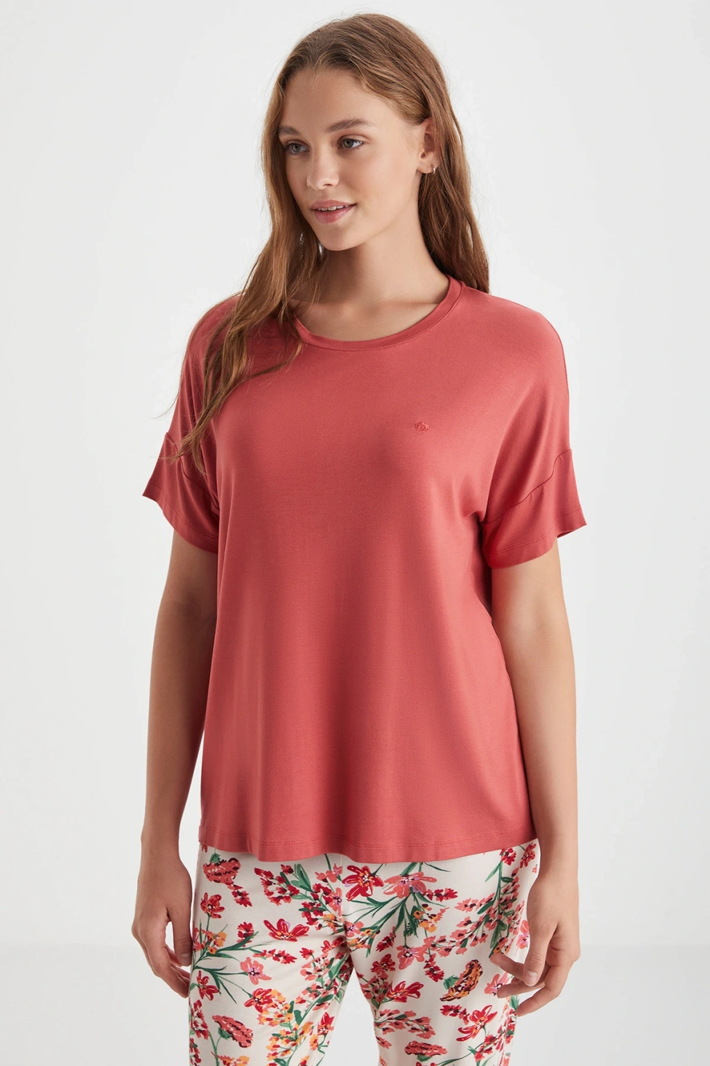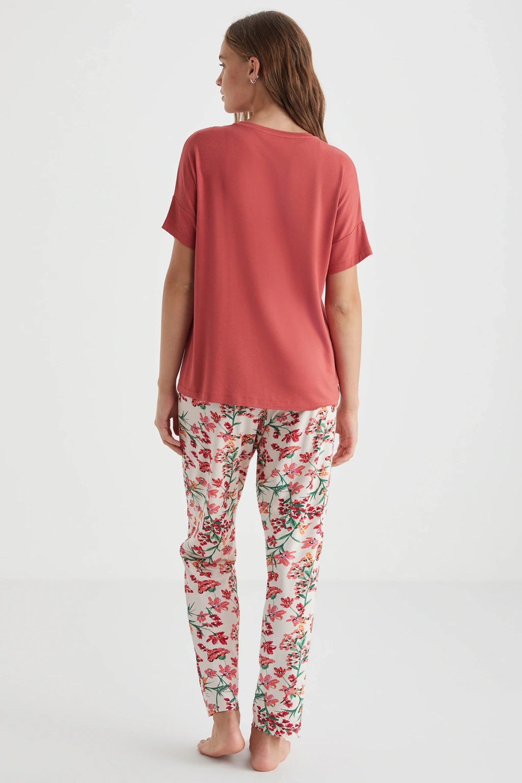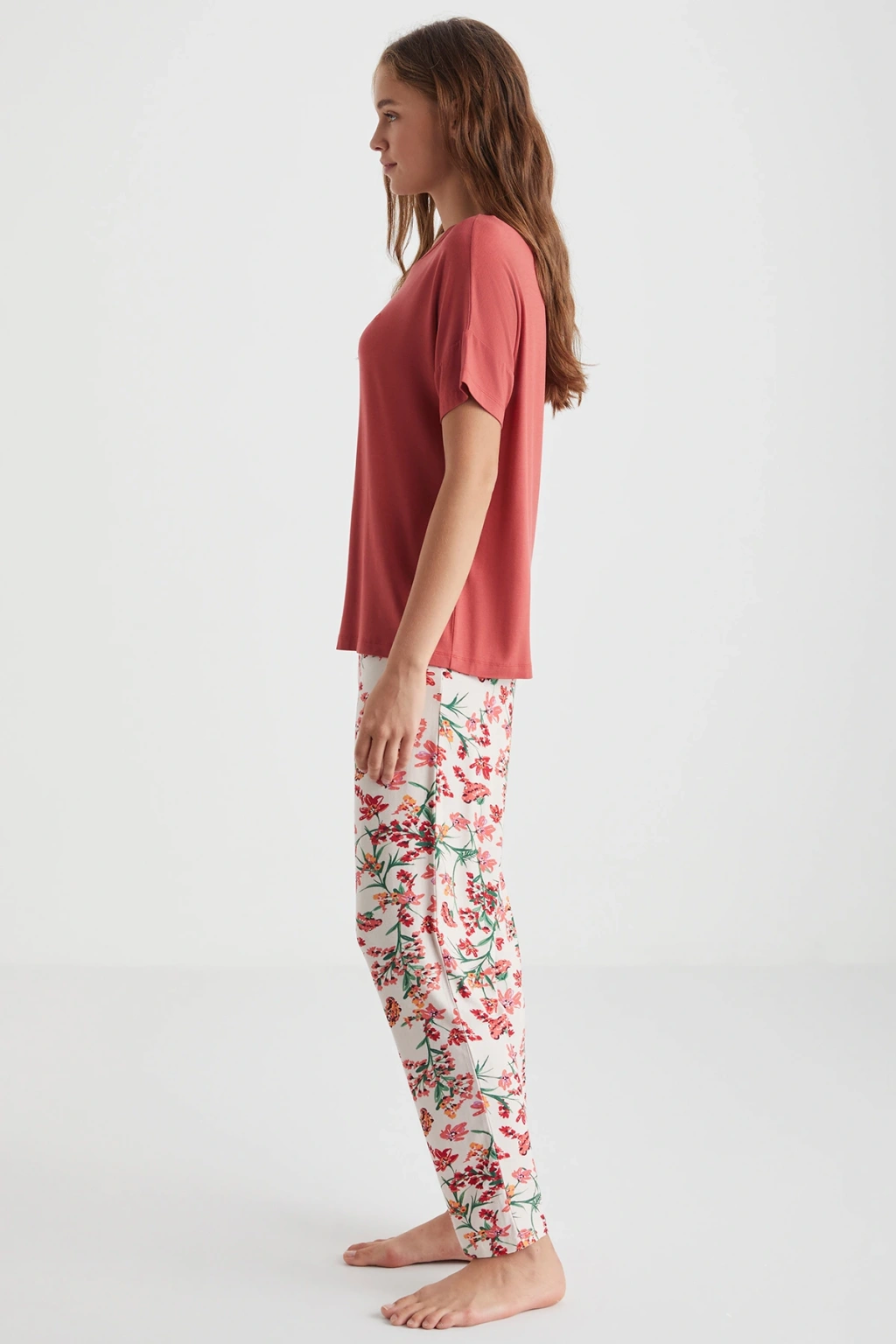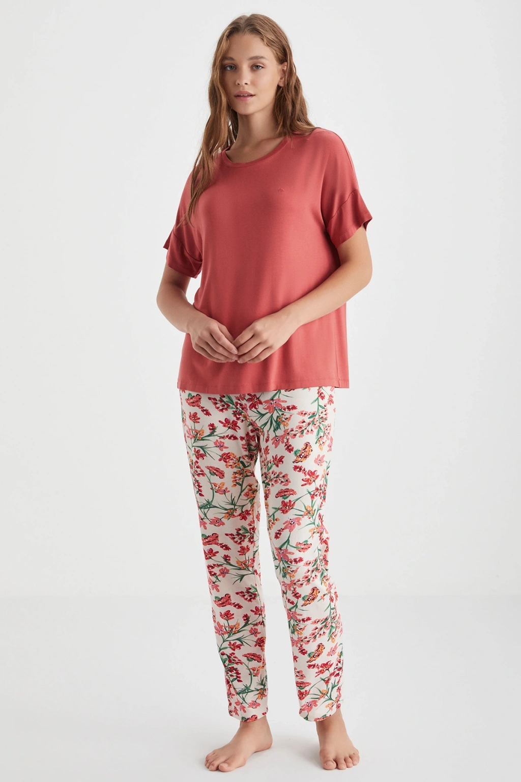 Çiçek desenli pijama altı, kısa kollu tişört.