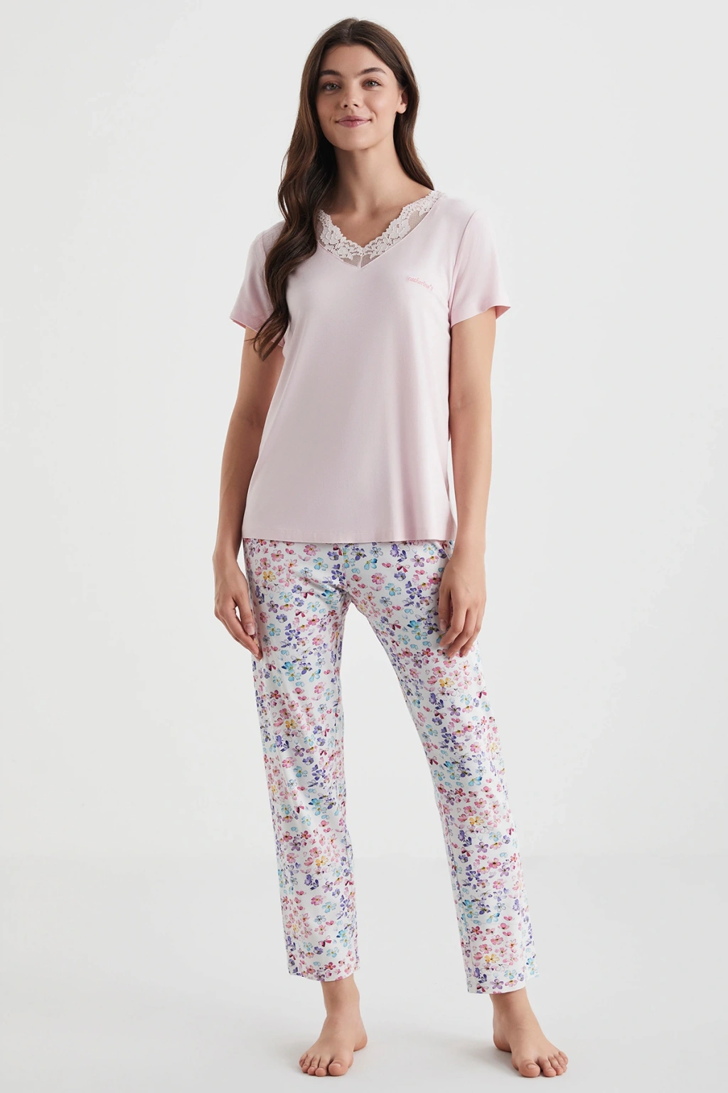 25109 Kadın V Yaka Kısa Kollu Bol Paçalı Pijama Takım
