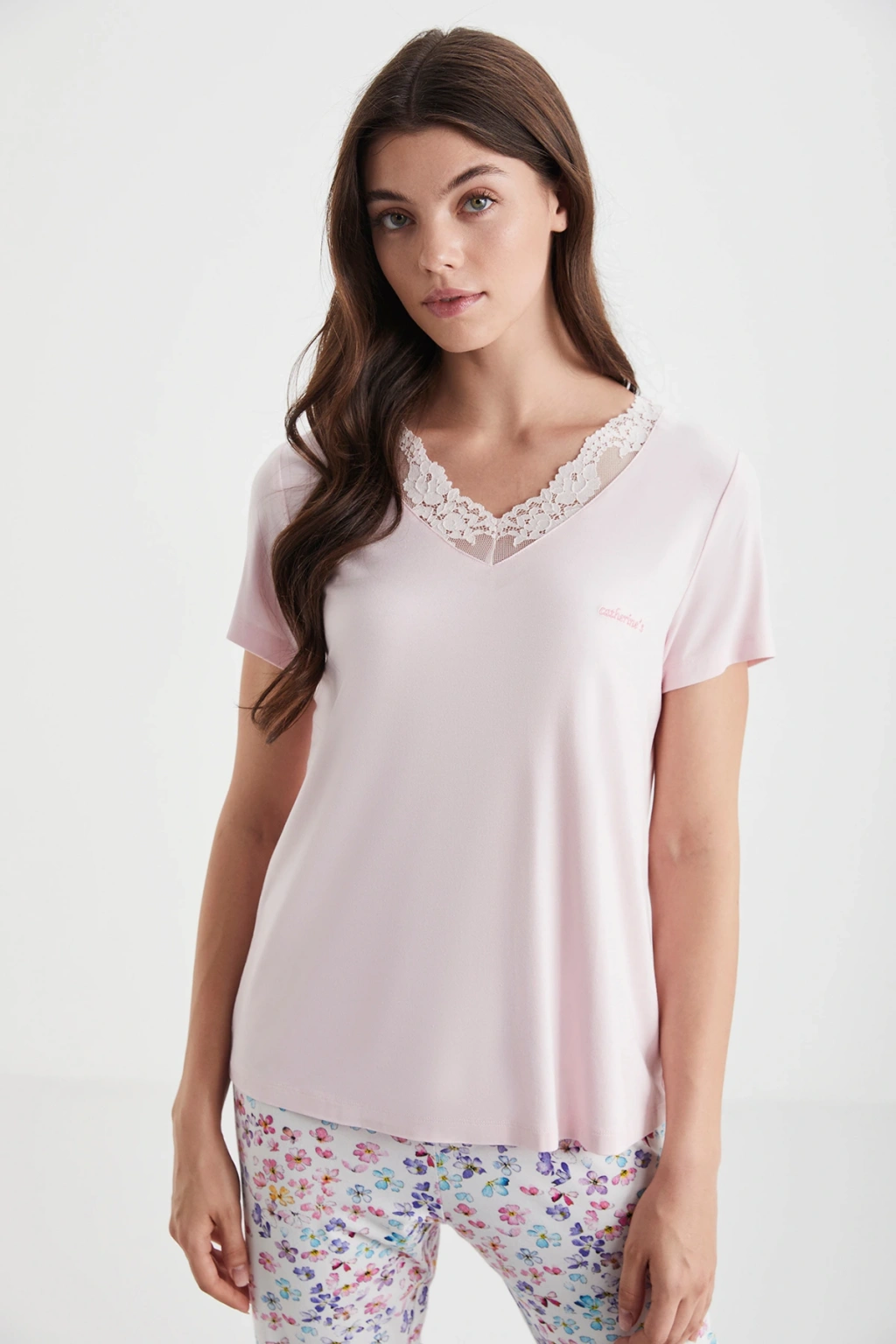 Dantel yakalı pijama takımı.