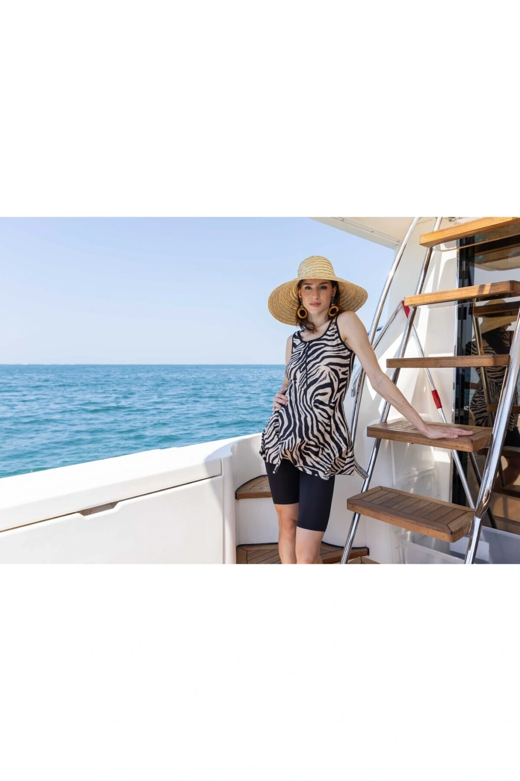 TR: Su itici: Suyu iten apreli likra kumaş. Üst desenli. Kemik fermuarlı. Askılı ve evaze etek detaylı. Yuvarlak yaka. Bone. Kısa tayt. Tek parça iç çamaşır.